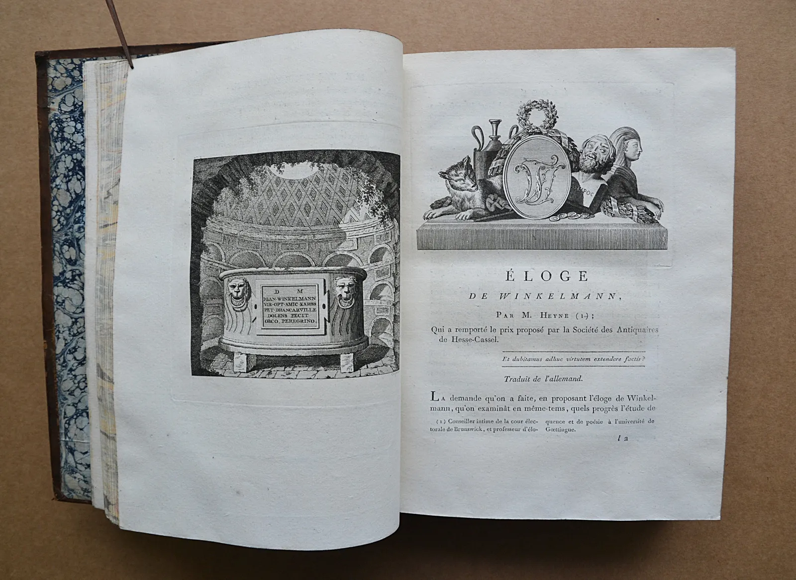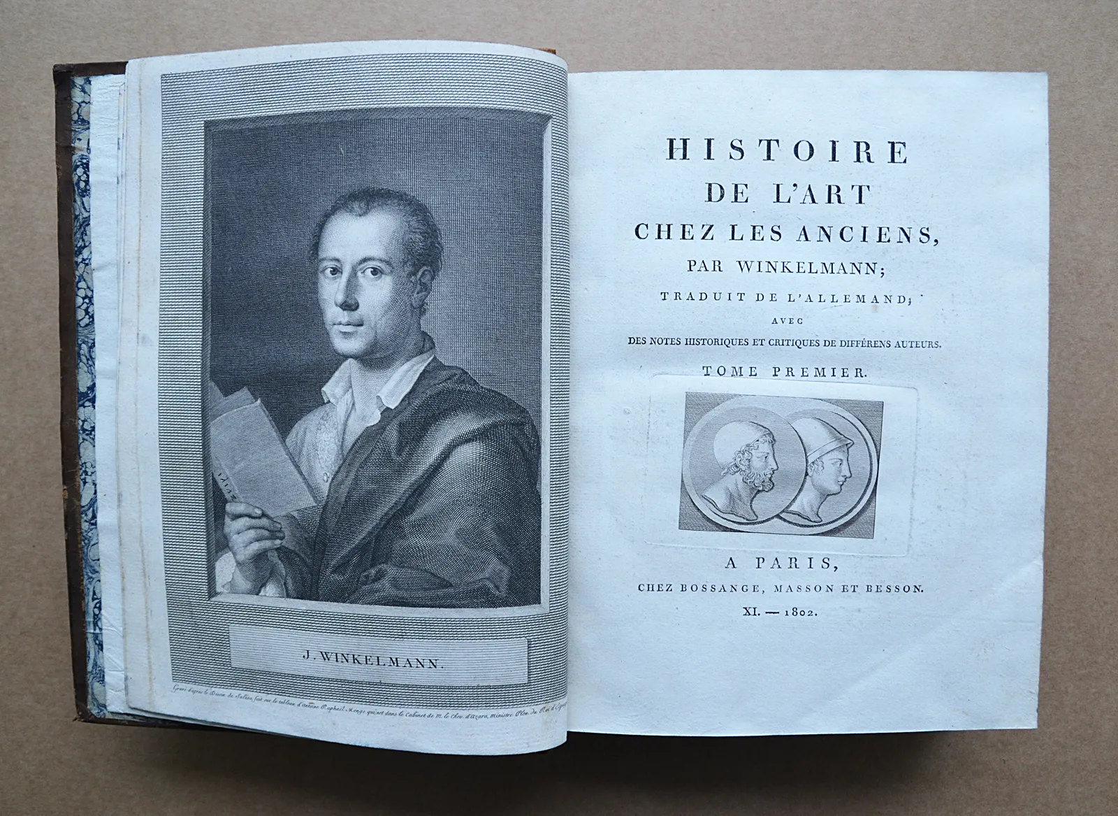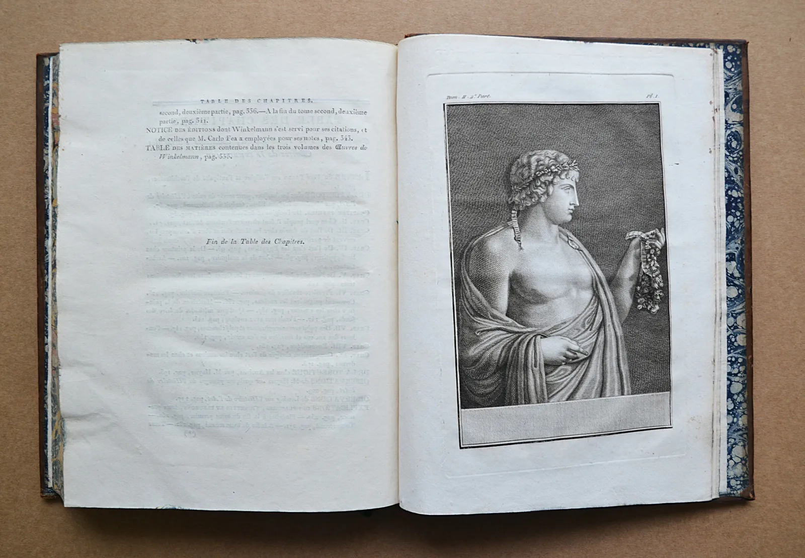 Deux tomes en trois volumes, veau porphyre de l'époque à la grecque, par le fondateur de l'archéologie moderne et précurseur du néoclassicisme. Illustré de 3 frontispices, 65 planches hors-texte et 88 gravures dans le texte.