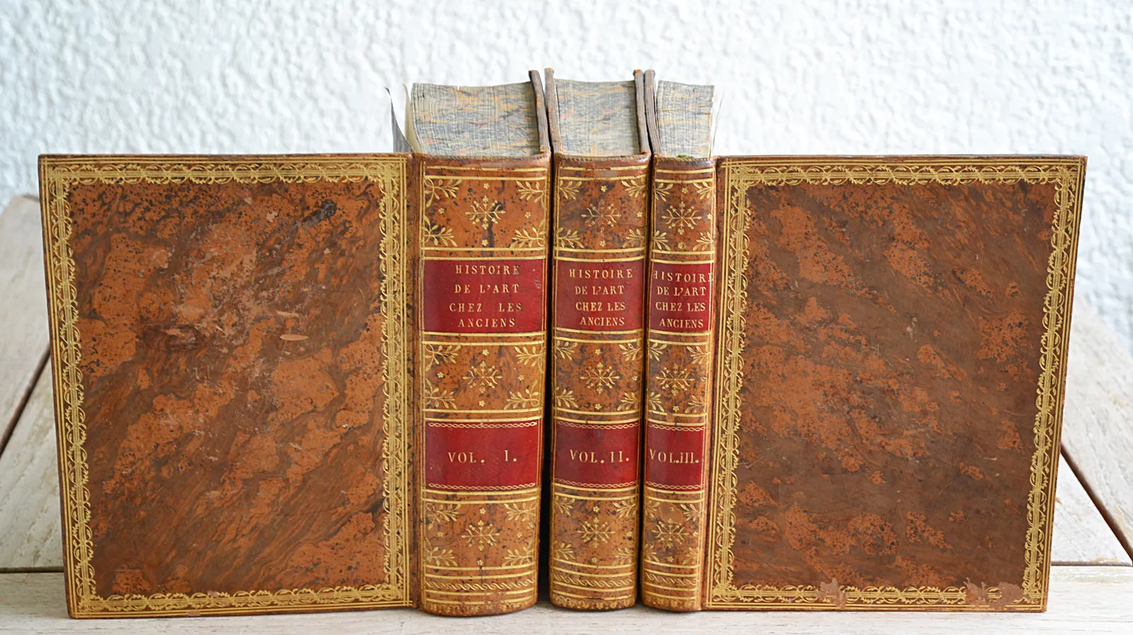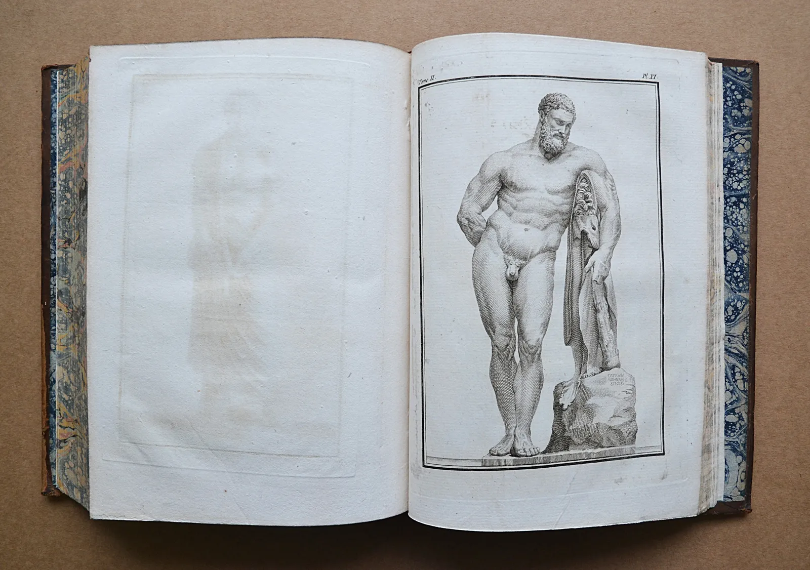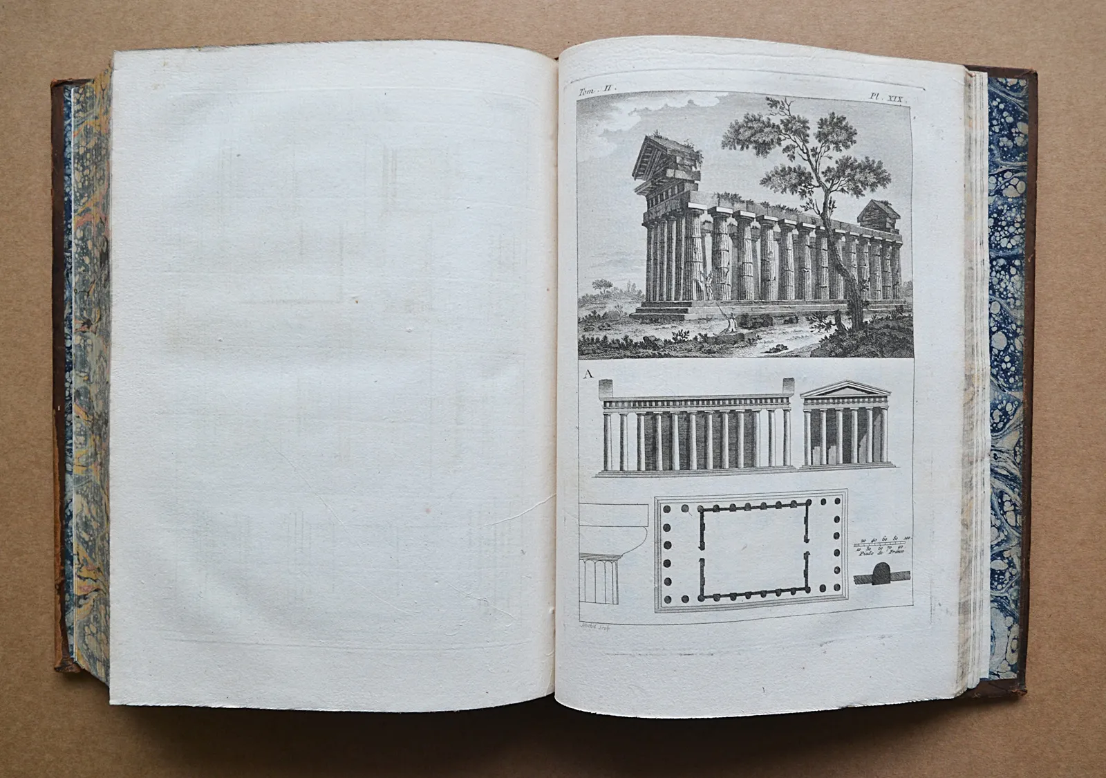 Deux tomes en trois volumes, veau porphyre de l'époque à la grecque, par le fondateur de l'archéologie moderne et précurseur du néoclassicisme. Illustré de 3 frontispices, 65 planches hors-texte et 88 gravures dans le texte.