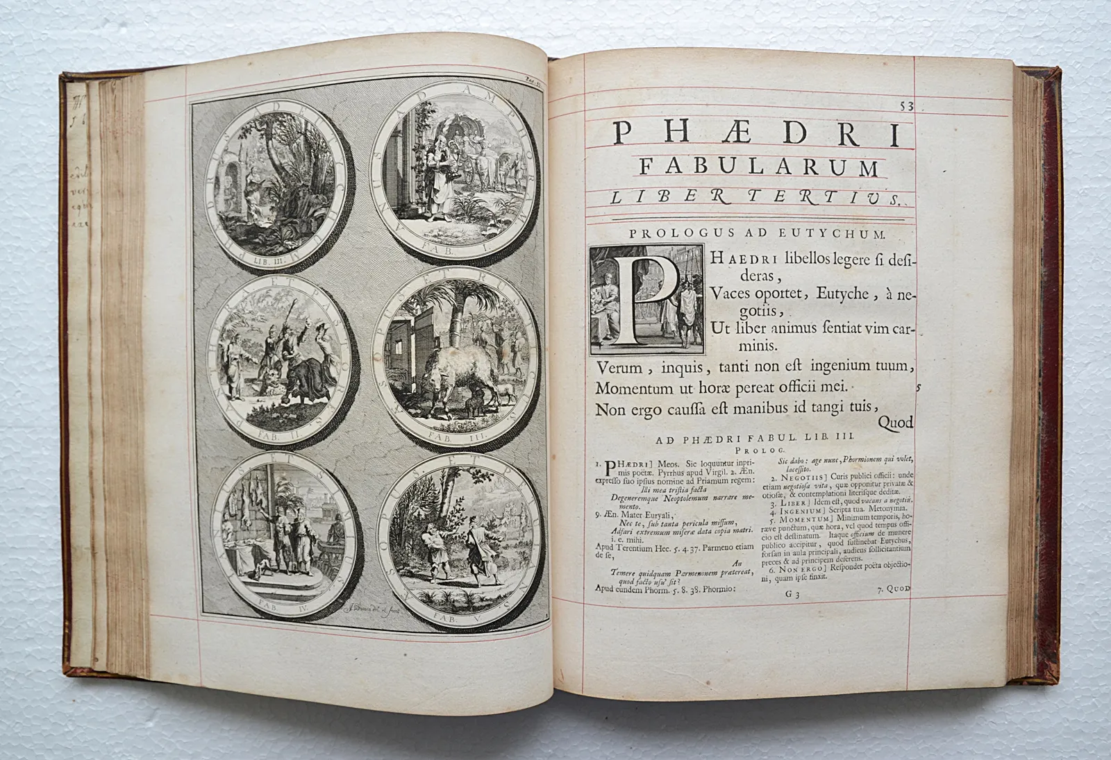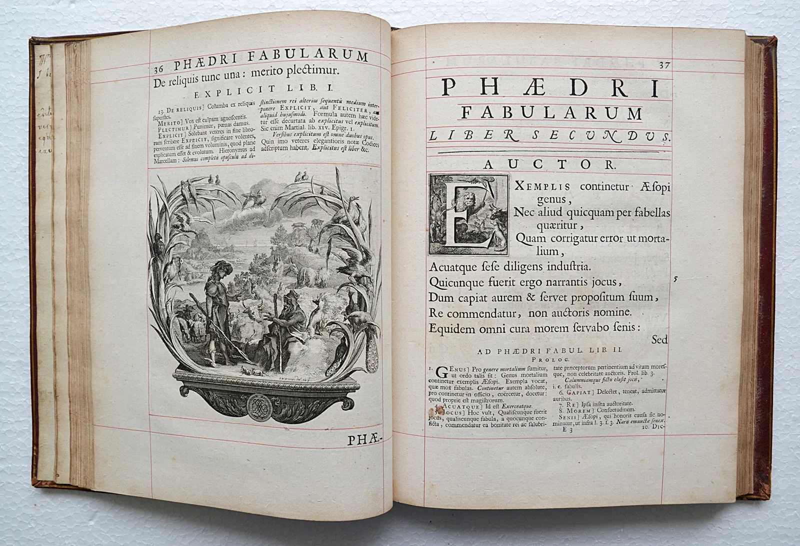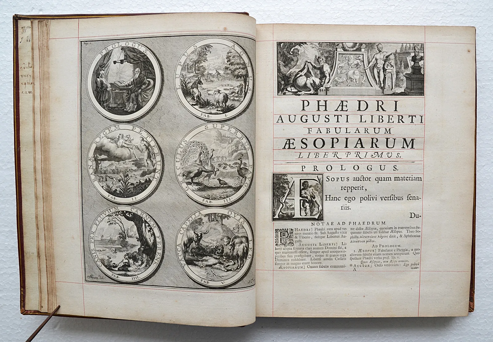 Édition estimée et fort recherchée des 123 fables de Phèdre établie par le philologue hollandais David van Hoogstraten (1658-1724) ; elle est illustrée d’un titre-frontispice par Goeree, gravé par Boutats, 1 fleuron de titre non signé, 1 grand portrait dépliant de Jean-Guillaume, prince de Nassau, par Vaillant gravé par Van Gunst, 6 vignettes, 31 culs-de-lampe, 9 lettrines historiés et 18 figures hors texte composées chacune de 6 médaillons à sujet, dessinés et gravés par Jan van Vianen.