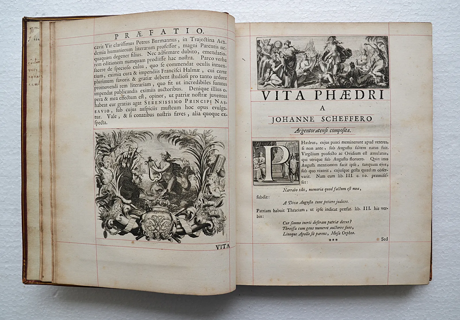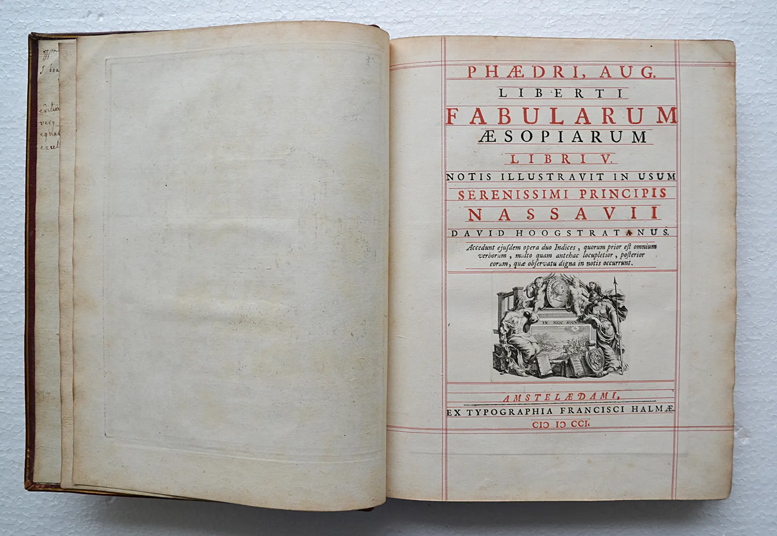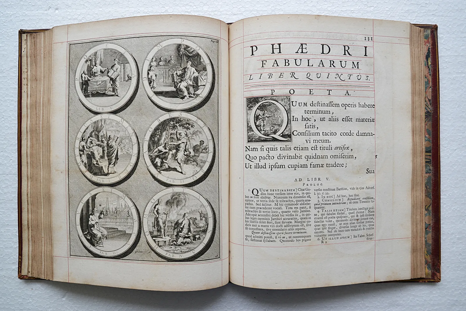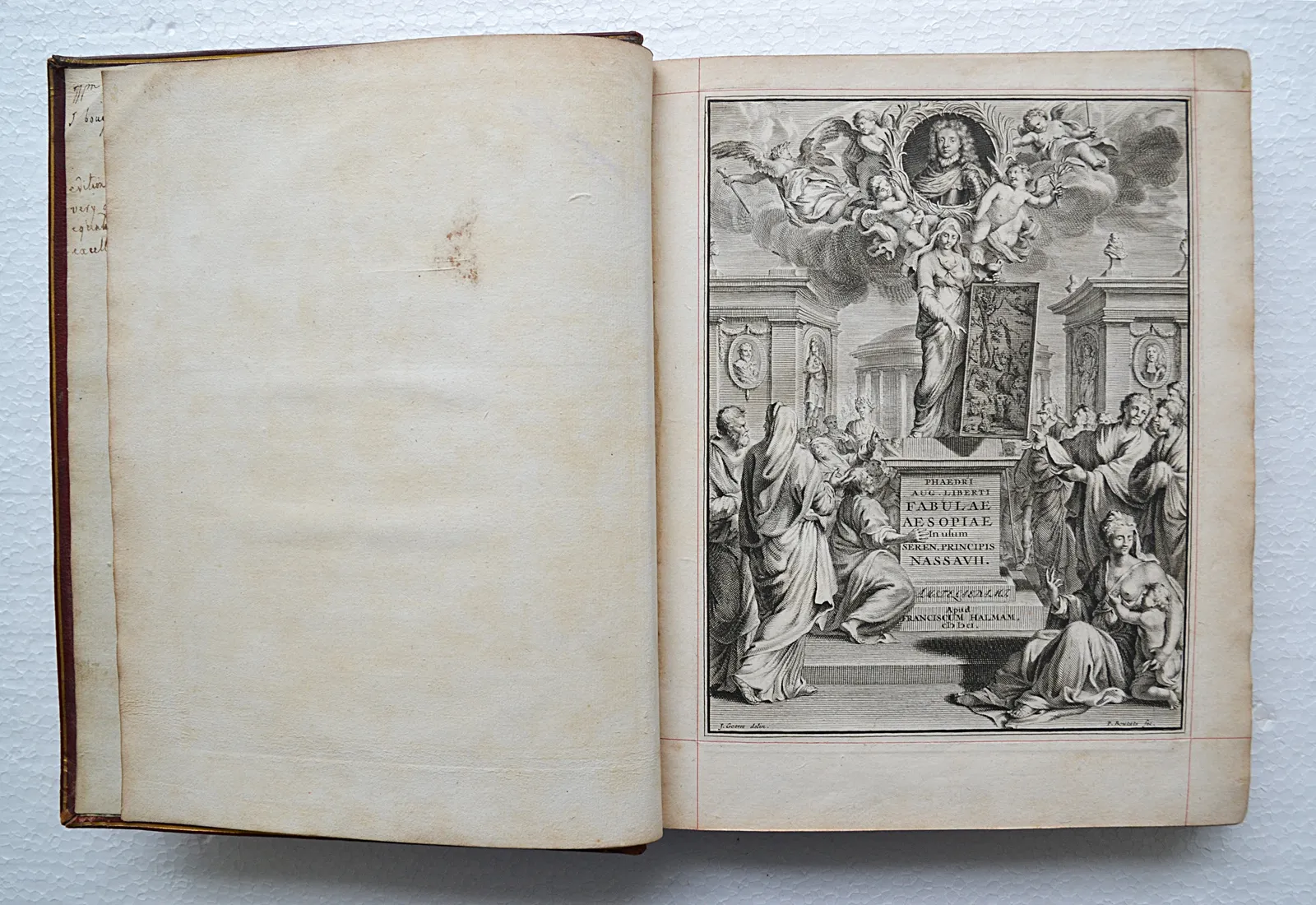 Édition estimée et fort recherchée des 123 fables de Phèdre établie par le philologue hollandais David van Hoogstraten (1658-1724) ; elle est illustrée d’un titre-frontispice par Goeree, gravé par Boutats, 1 fleuron de titre non signé, 1 grand portrait dépliant de Jean-Guillaume, prince de Nassau, par Vaillant gravé par Van Gunst, 6 vignettes, 31 culs-de-lampe, 9 lettrines historiés et 18 figures hors texte composées chacune de 6 médaillons à sujet, dessinés et gravés par Jan van Vianen.