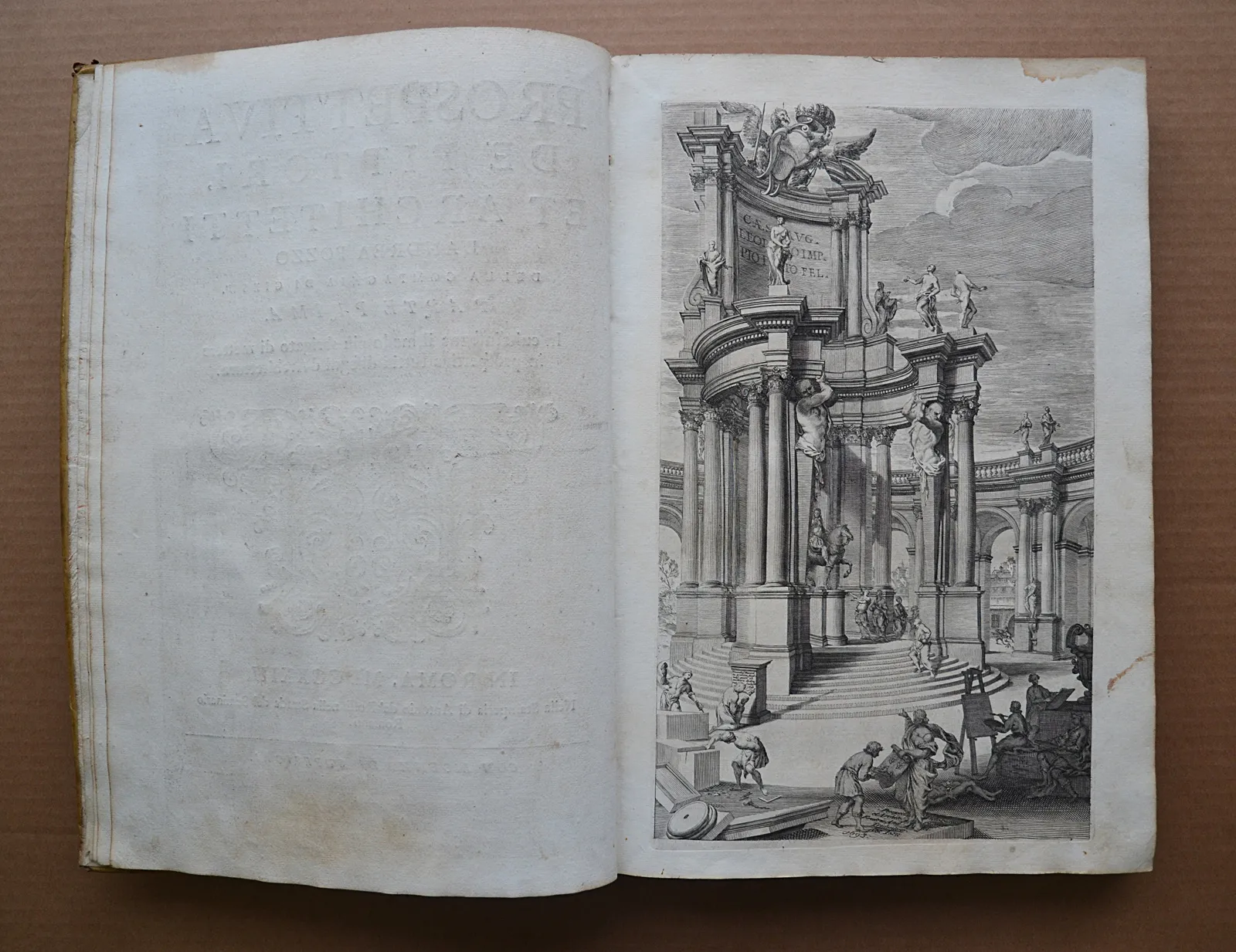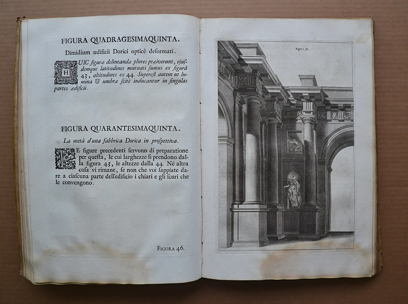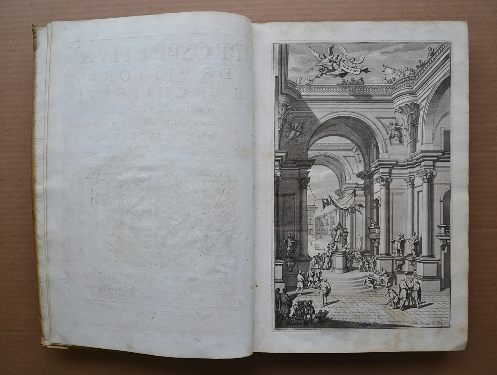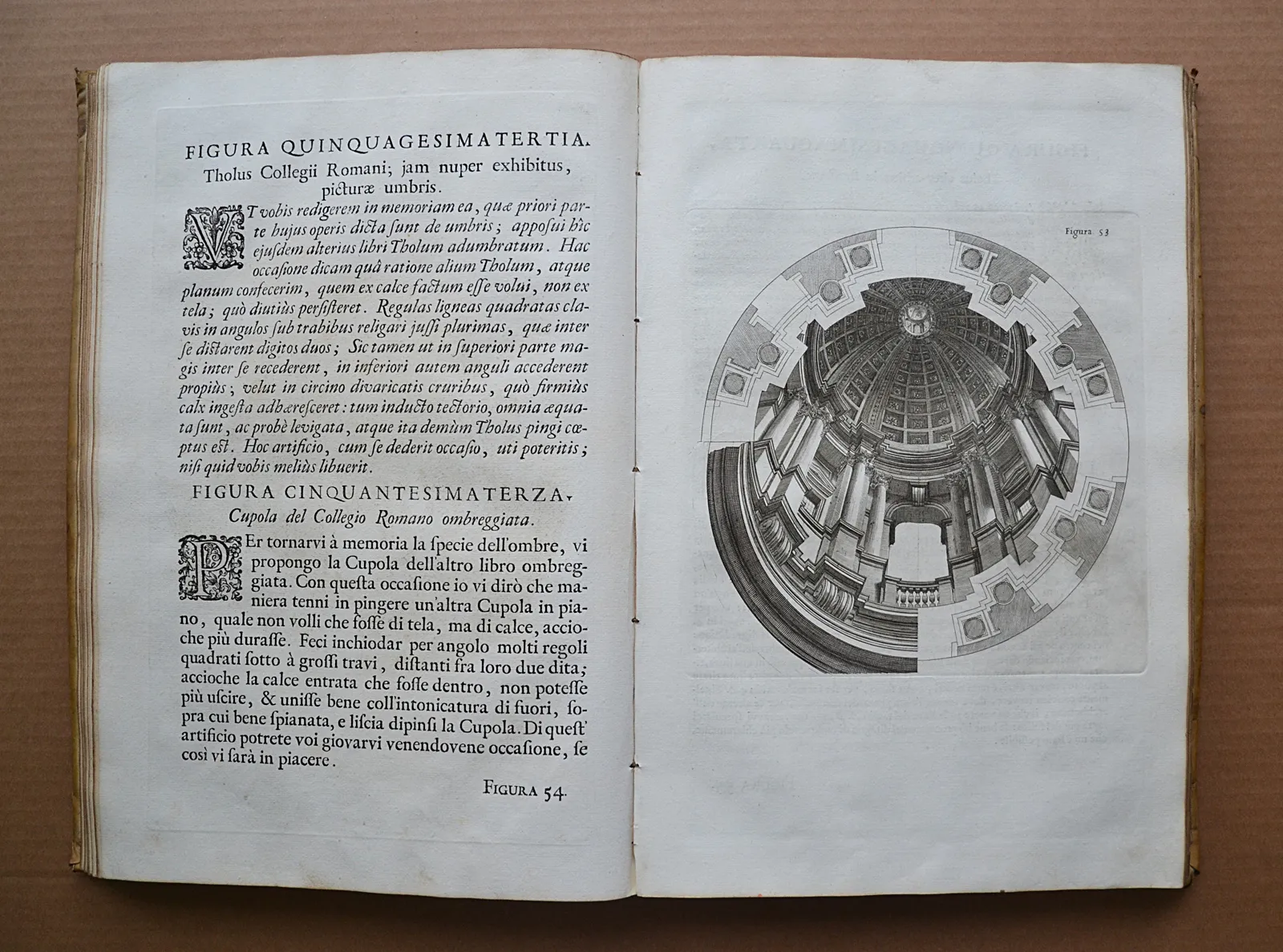 Deux volumes in-folio en vélin rigide de l'époque, illustrés de 221 planches gravées. L'un des plus beaux traités de perspective du XVIIIe siècle, édition bilingue latin-italien de 1723.