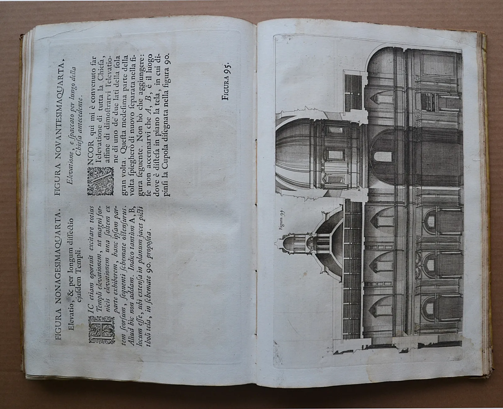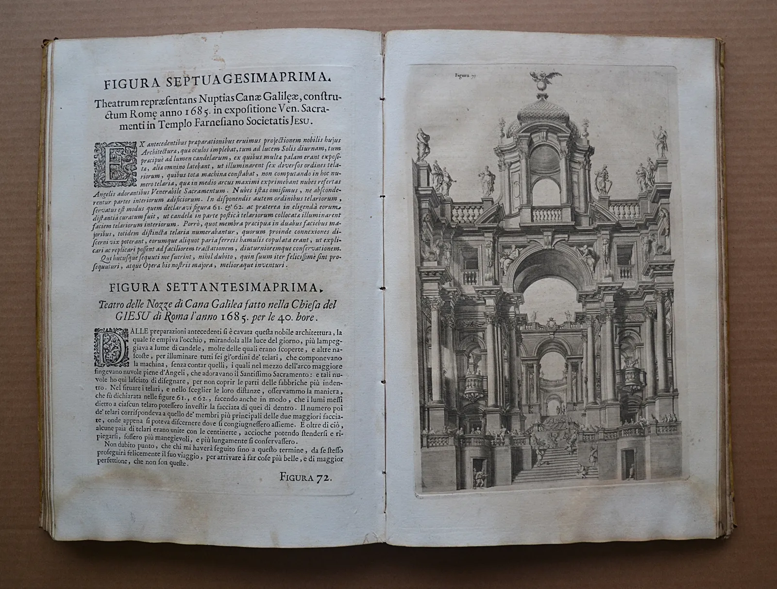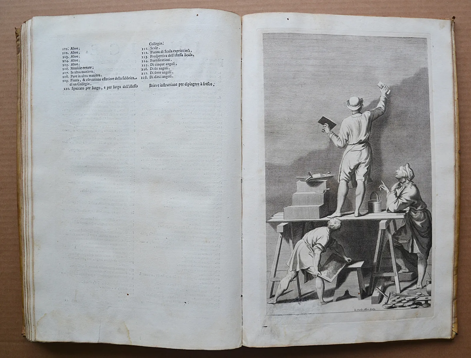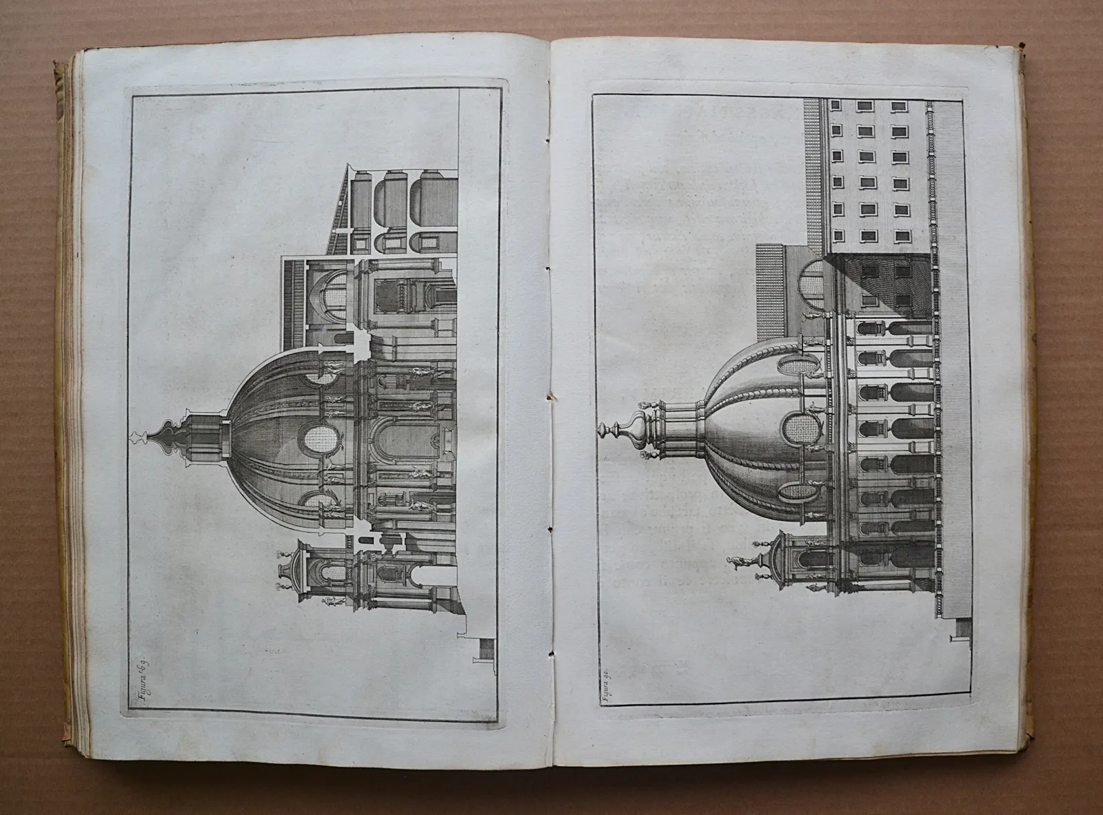 Deux volumes in-folio en vélin rigide de l'époque, illustrés de 221 planches gravées. L'un des plus beaux traités de perspective du XVIIIe siècle, édition bilingue latin-italien de 1723.