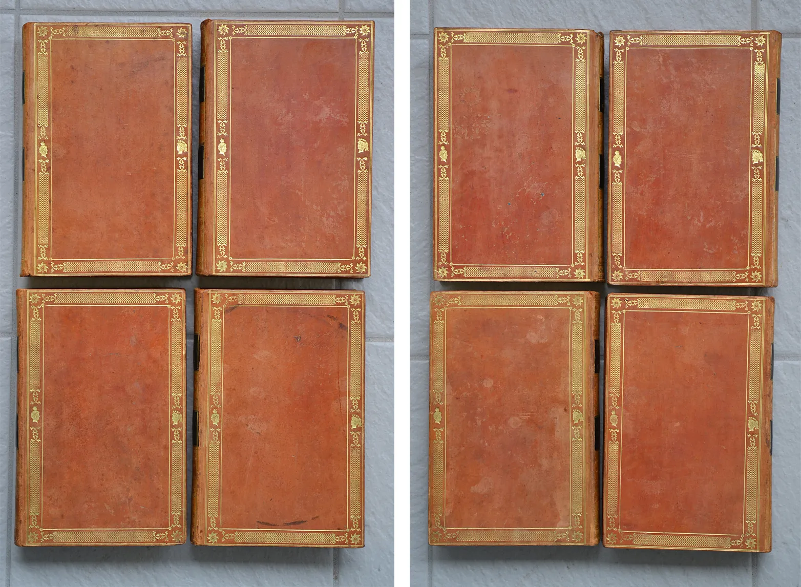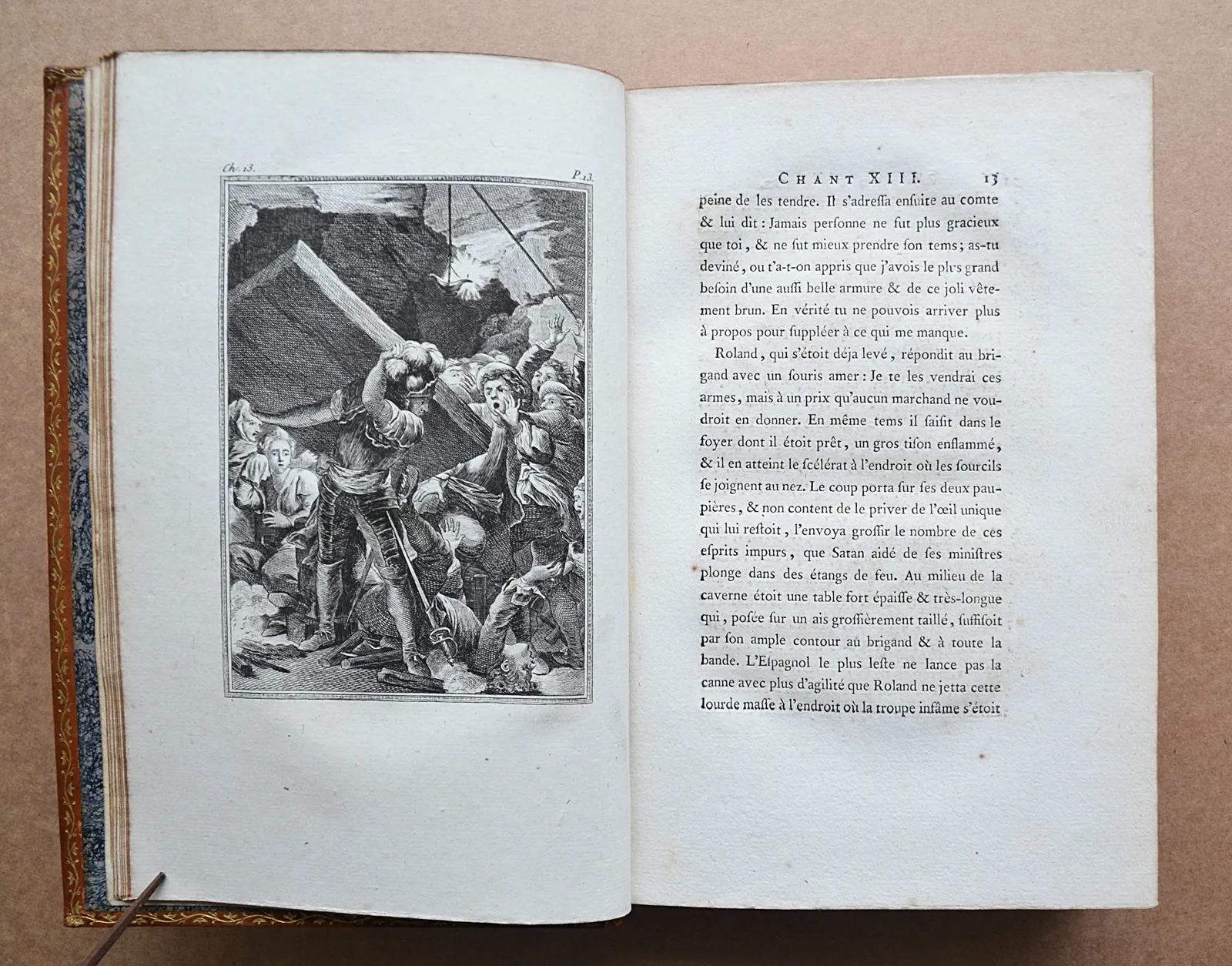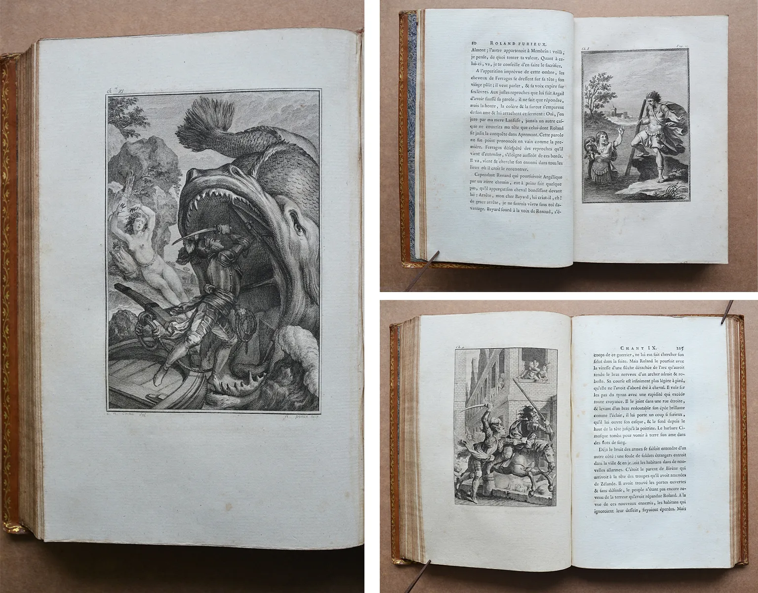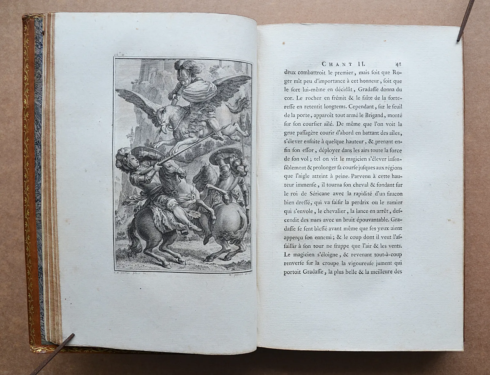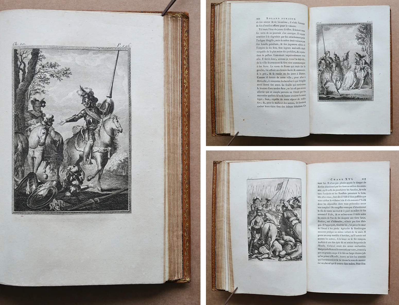 A Paris, chez Brunet & chez Laporte (T4), 1775 – 1783. Quatre volumes in-8 (15 x 23 cm.) de : (3ff.) – 321 pp. + 391 pp. + 407 pp. + 410 pp. ; veau fauve, large encadrement sur les plats composé de filets et de motifs dorés (soleil dans les angles, roulette à la grotesque, têtes de Roland et d’Angélique), dos lisses ornés de fleurons dorés représentant Roland et des attributs militaires (massue & glaive avec une tête d’aigle), large pièce de titre et de tomaison en maroquin noir, filet doré sur les coupes, roulette dorée à l’intérieur, tranches dorées (reliure de l’époque).