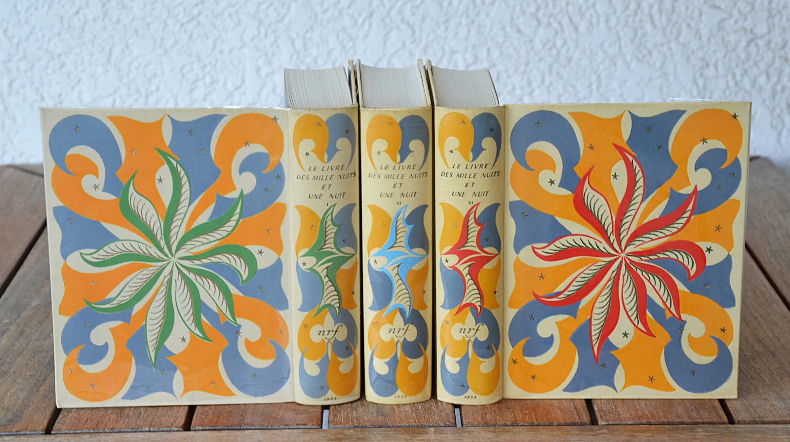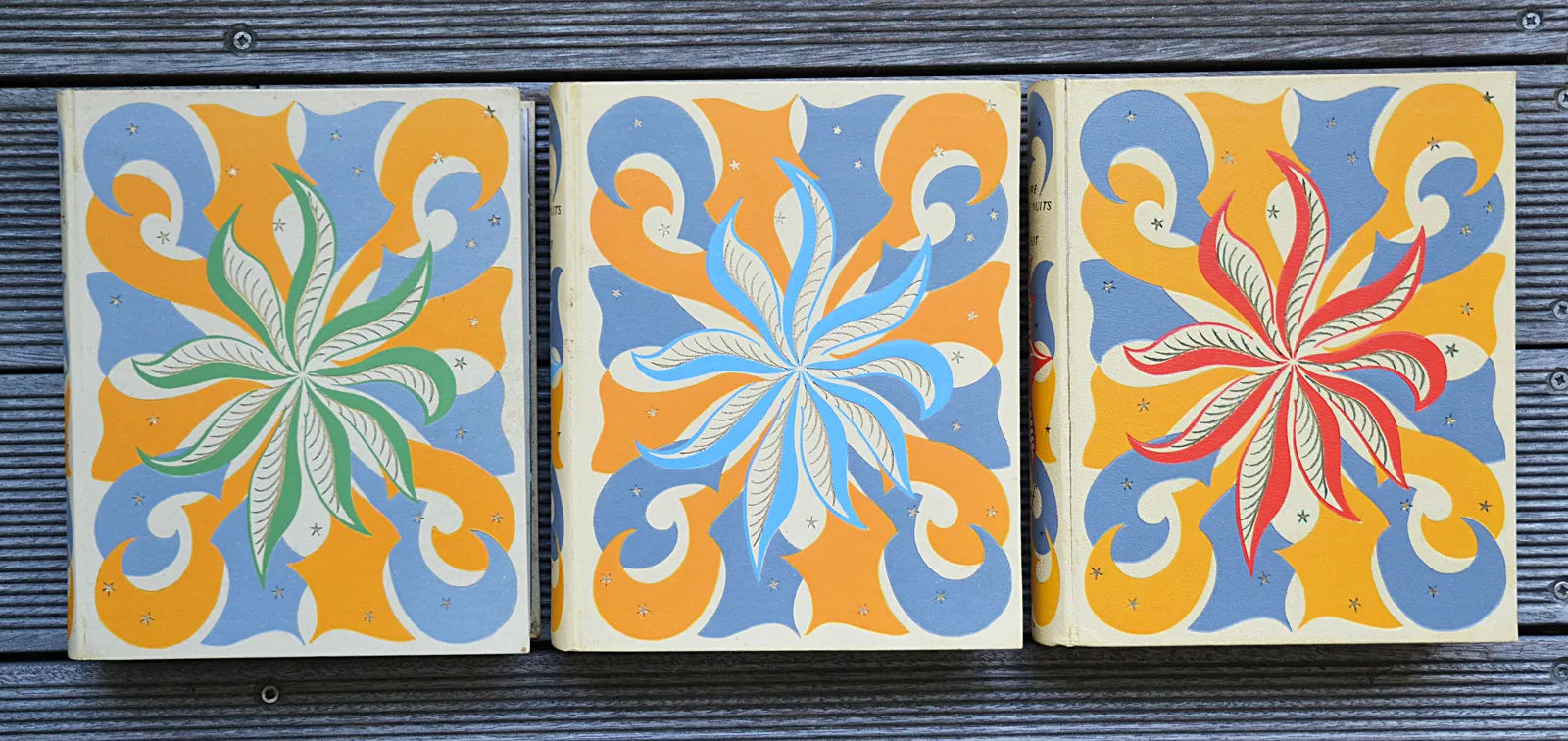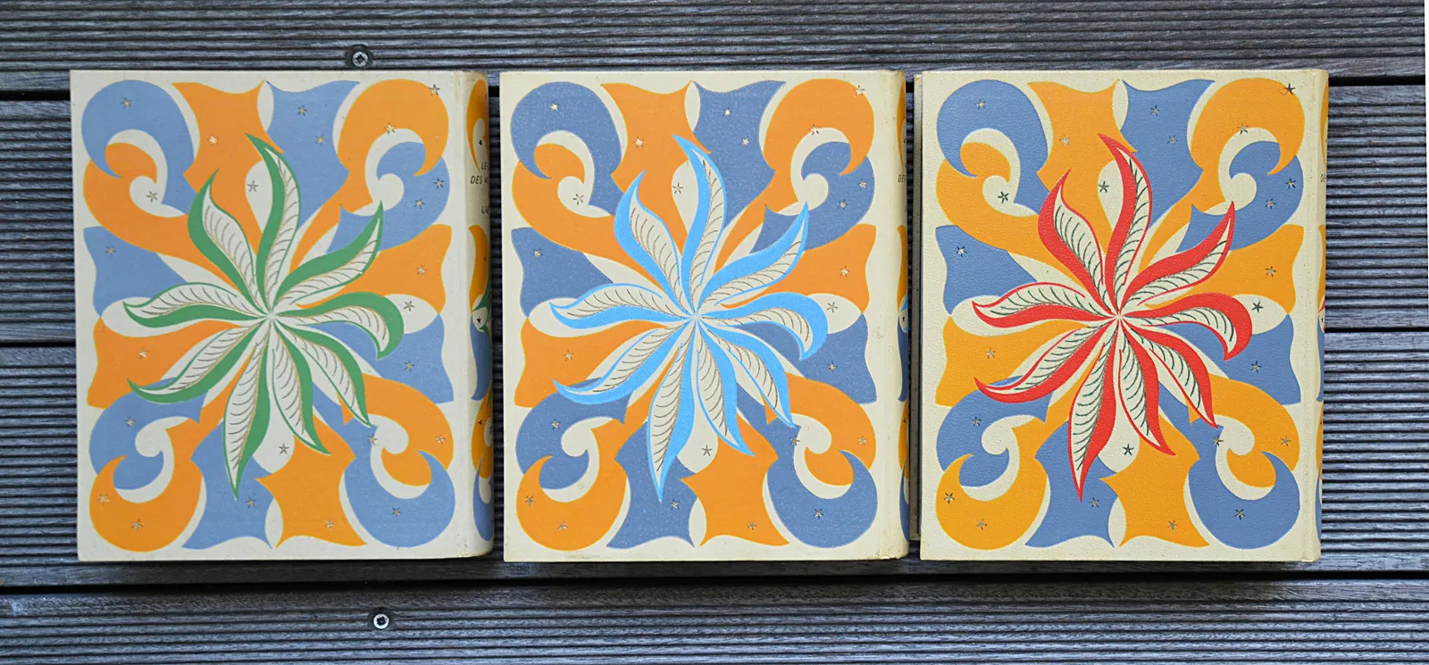 Trois volumes forts in-8 (19 x 23 cm.) de 839pp. + 867pp. + 833pp. ; cartonnages éditeur à décor polychrome exécutés d’après la maquette de Paul Bonet, gardes illustrées, rhodoïds & emboîtages cartonnés illustrés d’étoiles.