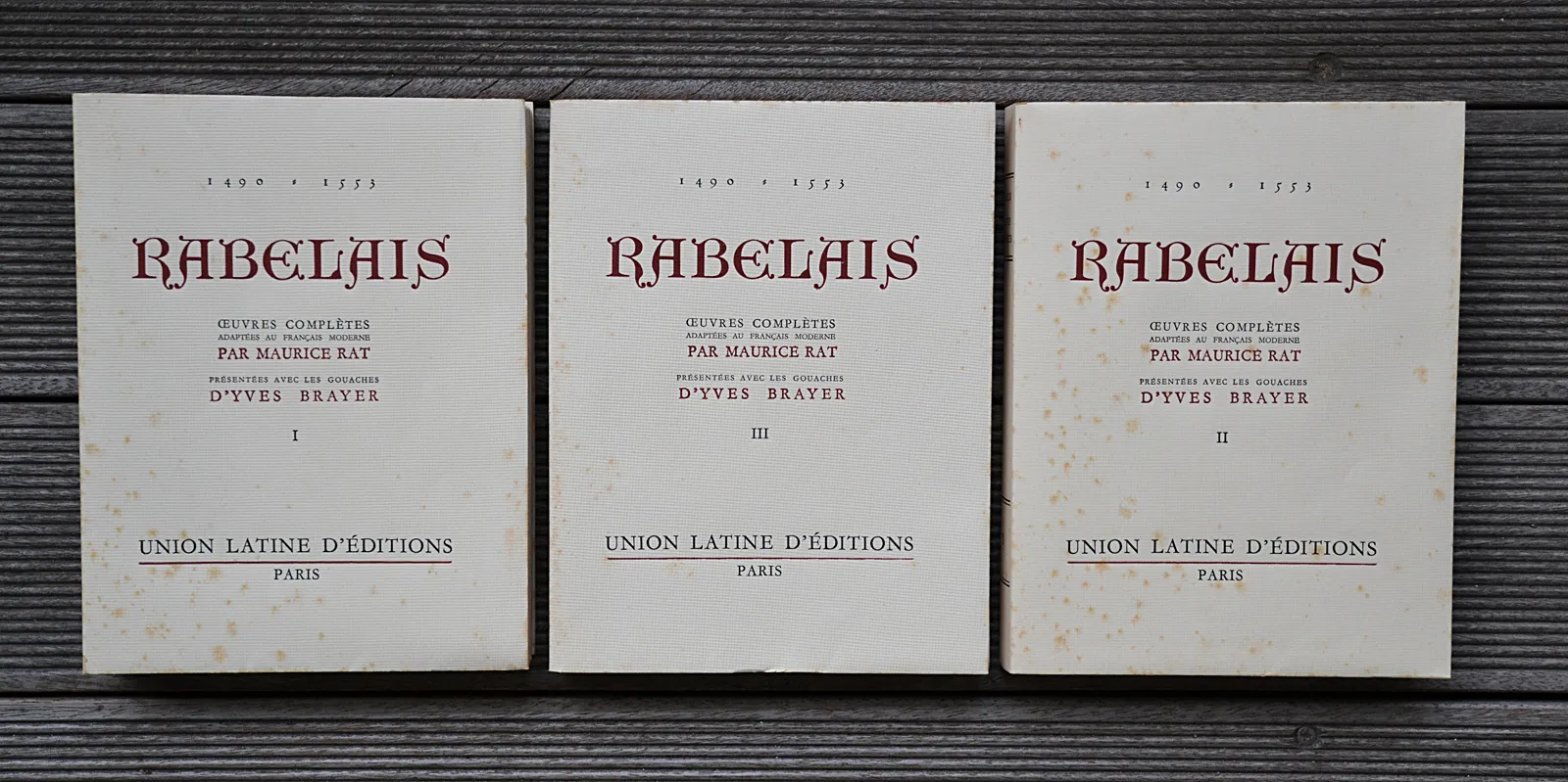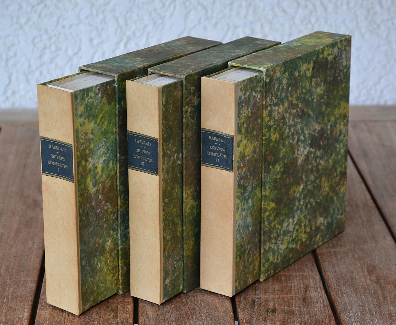 Trois volumes petits in-4 (17,3 x 22,5 cm.) de 333 pp. + 290 pp. + 294 pp. ; brochés, couvertures imprimées rempliées sous chemises et étuis cartonnés recouverts de papier marbré.