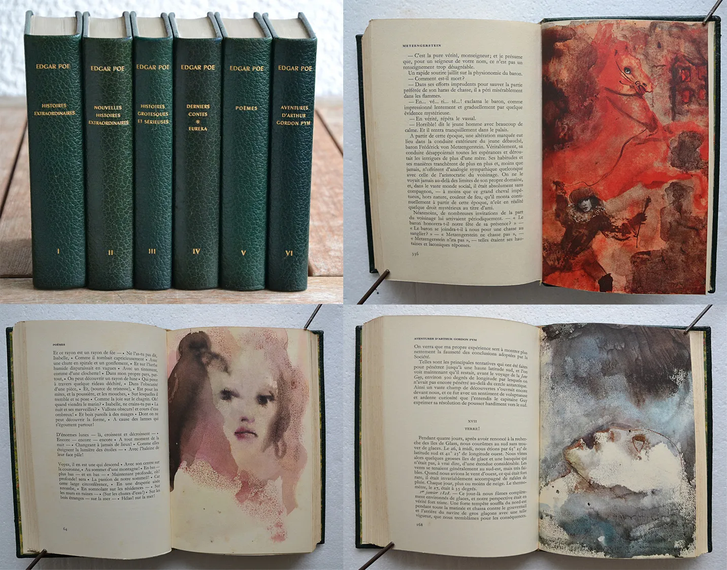 Six volumes en skivertex vert empire maroquiné, tirage à 2500 exemplaires sur grand vélin blanc, illustrés de 60 dessins en couleurs de Leonor Fini. Traduction de Baudelaire.