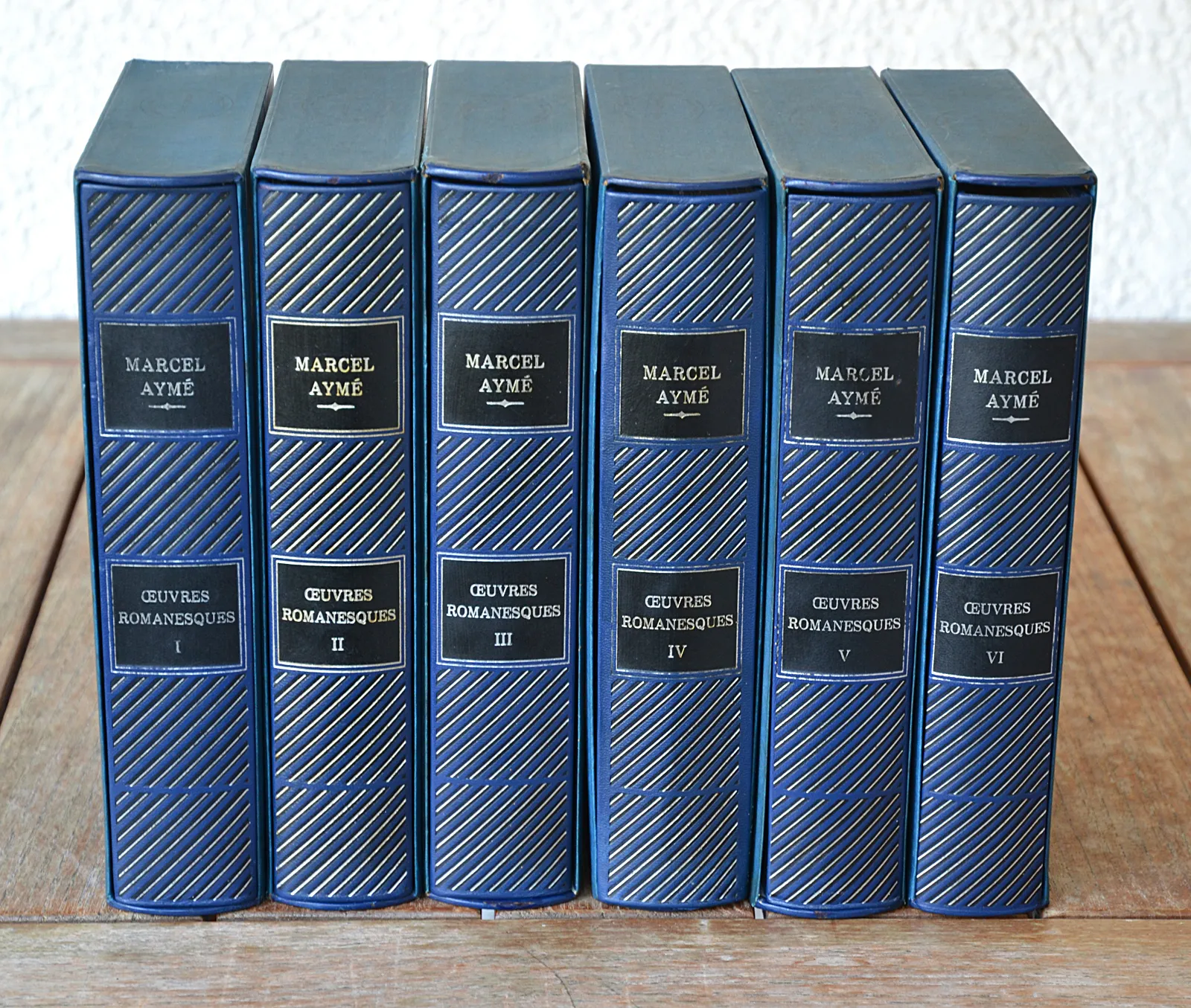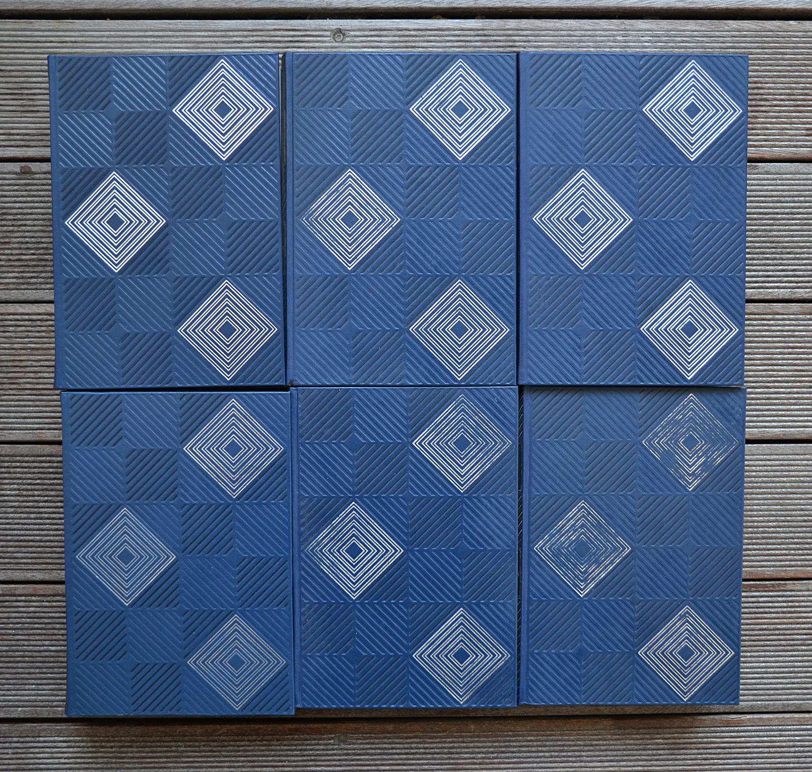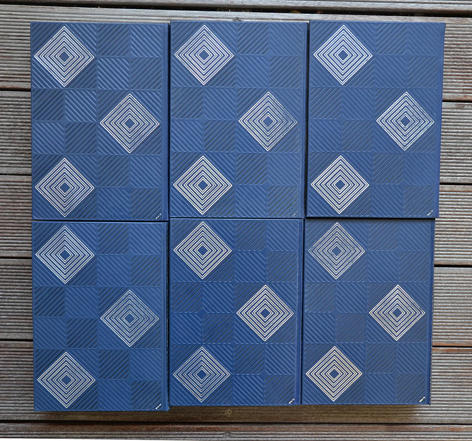 Six volumes in-4 (18,5 x 26,5 cm.) de 599 pp. + 609 pp. + 609 pp. + 673 pp. + 573 pp. + 525 pp. ; skivertex bleu-marine, motifs géométriques argentés et à froid sur les plats, dos lisses ornés, têtes dorées, emboîtages bleus (reliure de l’éditeur exécutée d’après les maquettes de Michel Otthoffer et de Michel de l’Ormeraie).
