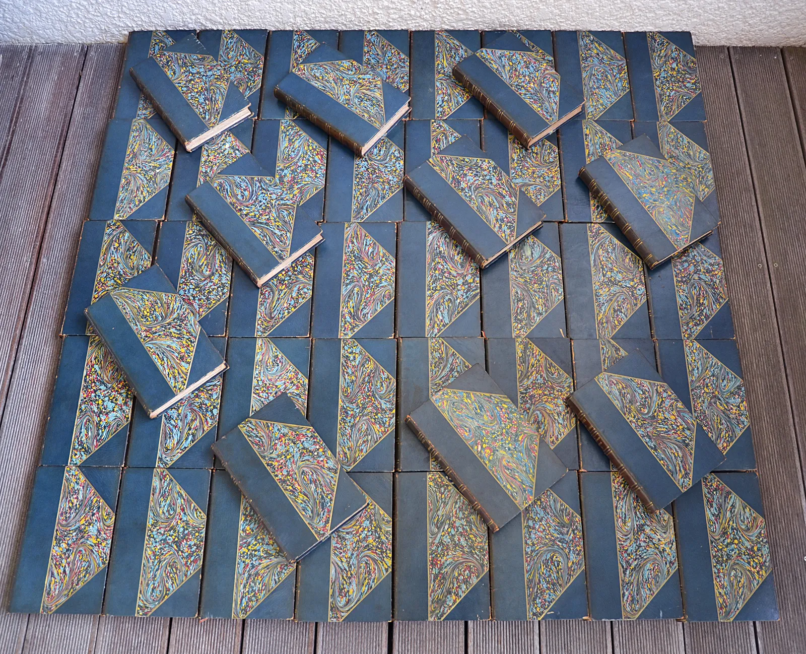 50 volumes in-8 (15,8 x 24 cm.), demi-maroquin bleu à long grain à coins, double filet doré sur les plats, dos à nerfs ornés de filets dorés, date dorée en queue, têtes rouges (reliure de l’époque).