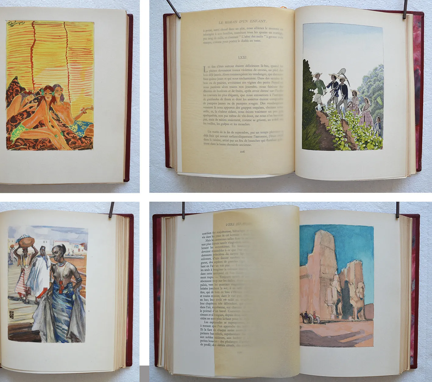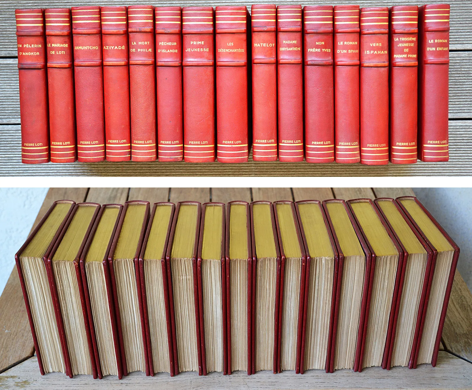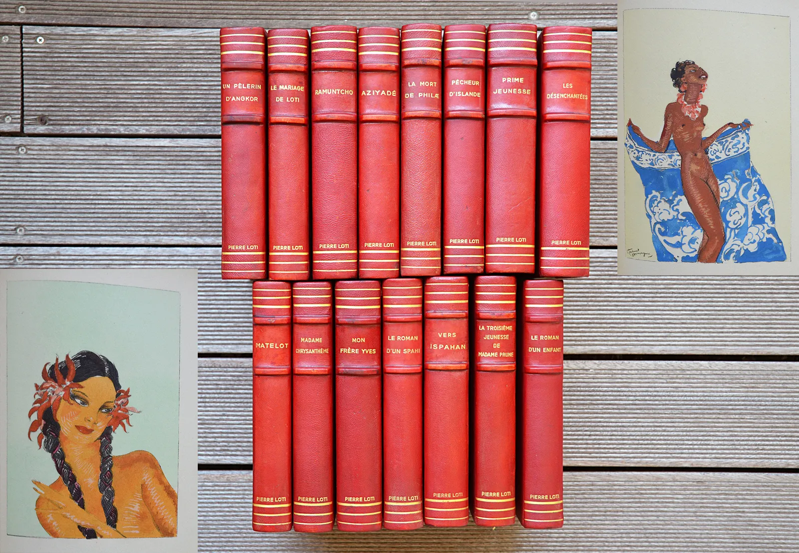 15 volumes en chagrin grenat de l'éditeur, illustrés de 400 illustrations dont 118 hors-texte au pochoir par Beaufumé et Jacomet. Édition recherchée selon Carteret.