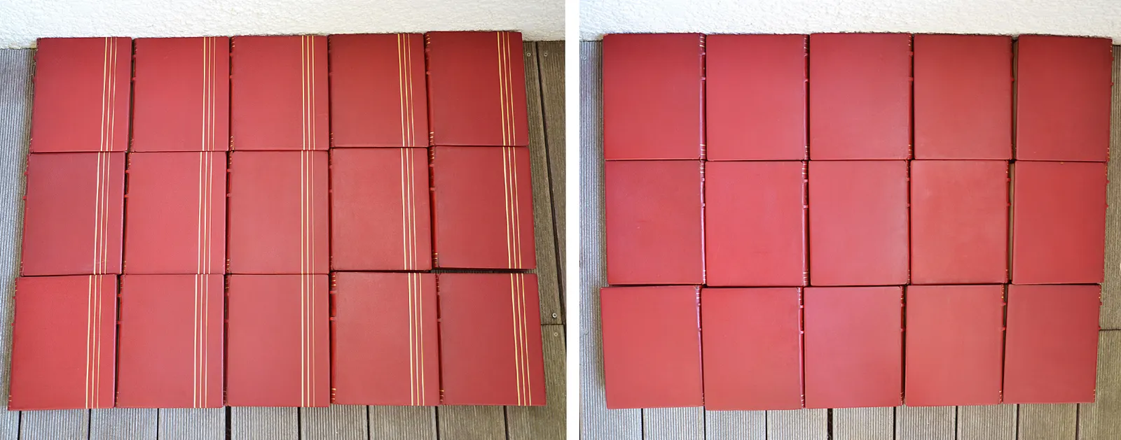 Quelques épidermures et décolorations, notamment sur plusieurs faux-nerfs ; quatre mors inférieurs fendillés.