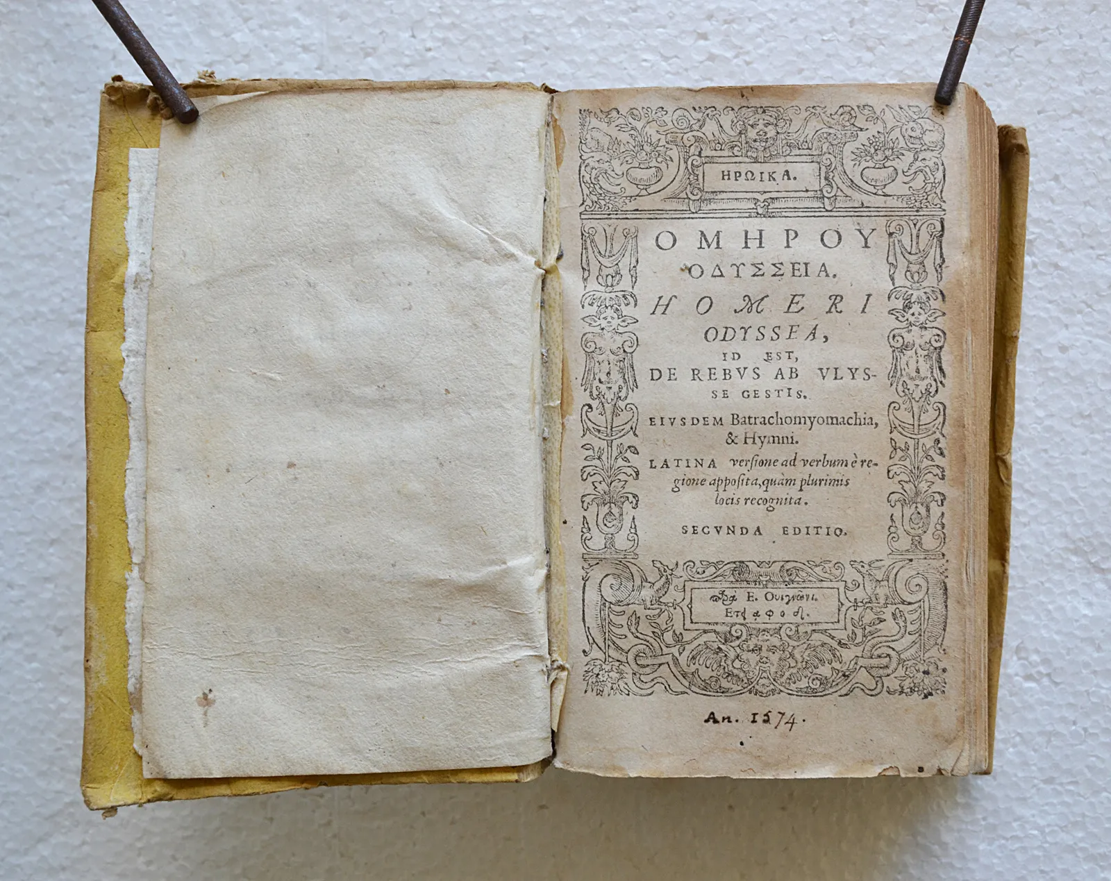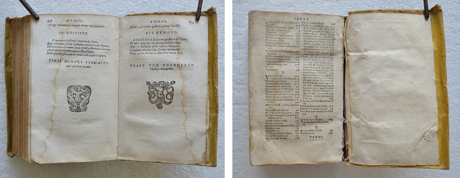 Petite fente sur deux mors ; épidermures ; quelques rousseurs sur les deux premiers volumes de l’Iliade et une trace de mouillure dans la marge supérieure de plusieurs feuillet dans le deuxième volume (sans gravité) ; premier feuillet blanc de l’Odyssée, presque détaché.