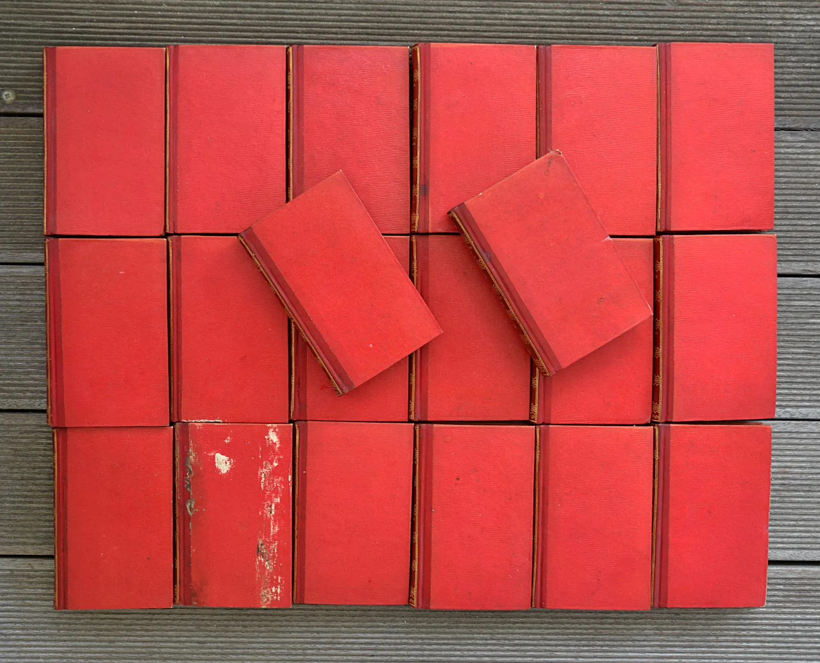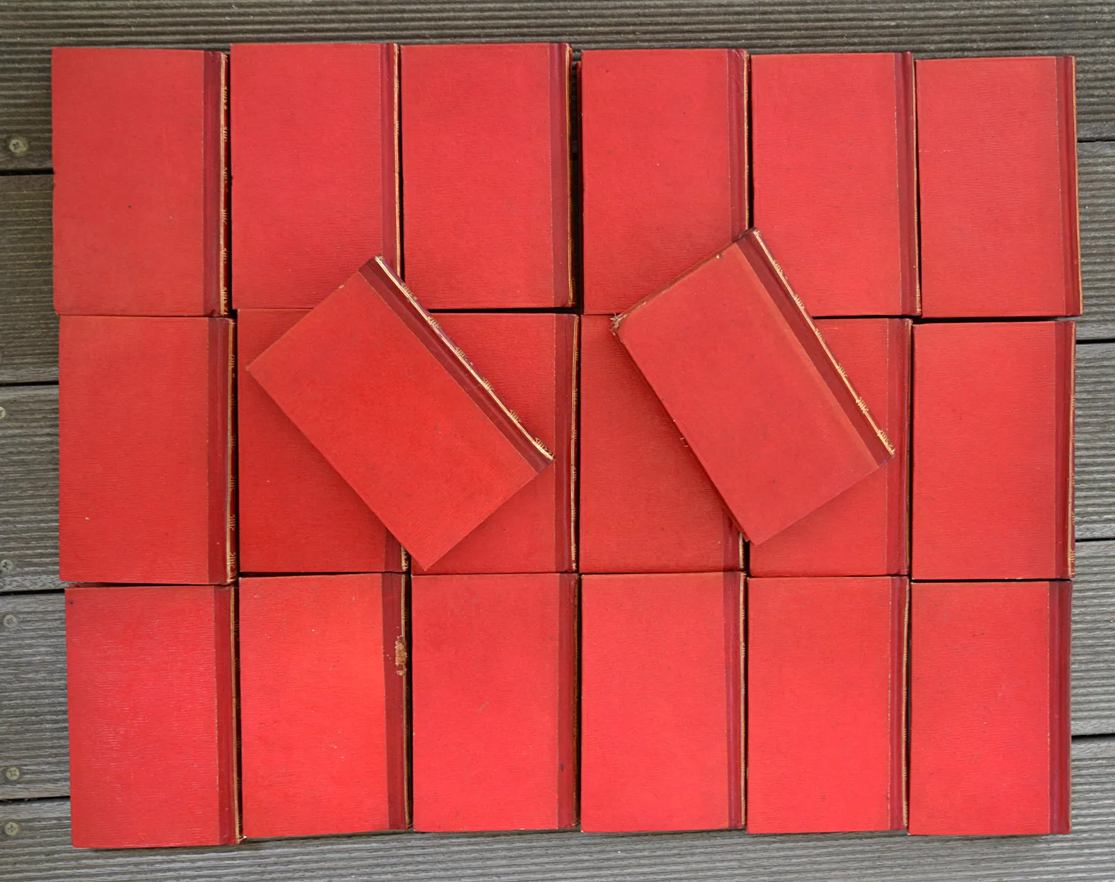 Vingt volumes in-18 (9,5 x 14,8 cm.), demi-maroquin rouge à long grain, dos lisses ornés (reliure de l’époque).