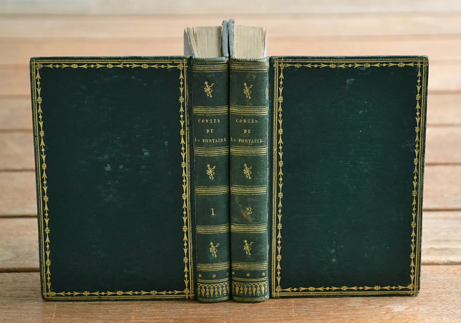 Deux volumes en maroquin vert à grain long du début du XIXe siècle, illustrés d'un frontispice allégorique et de 70 vignettes copiées sur les eaux-fortes de Romain de Hooge.
