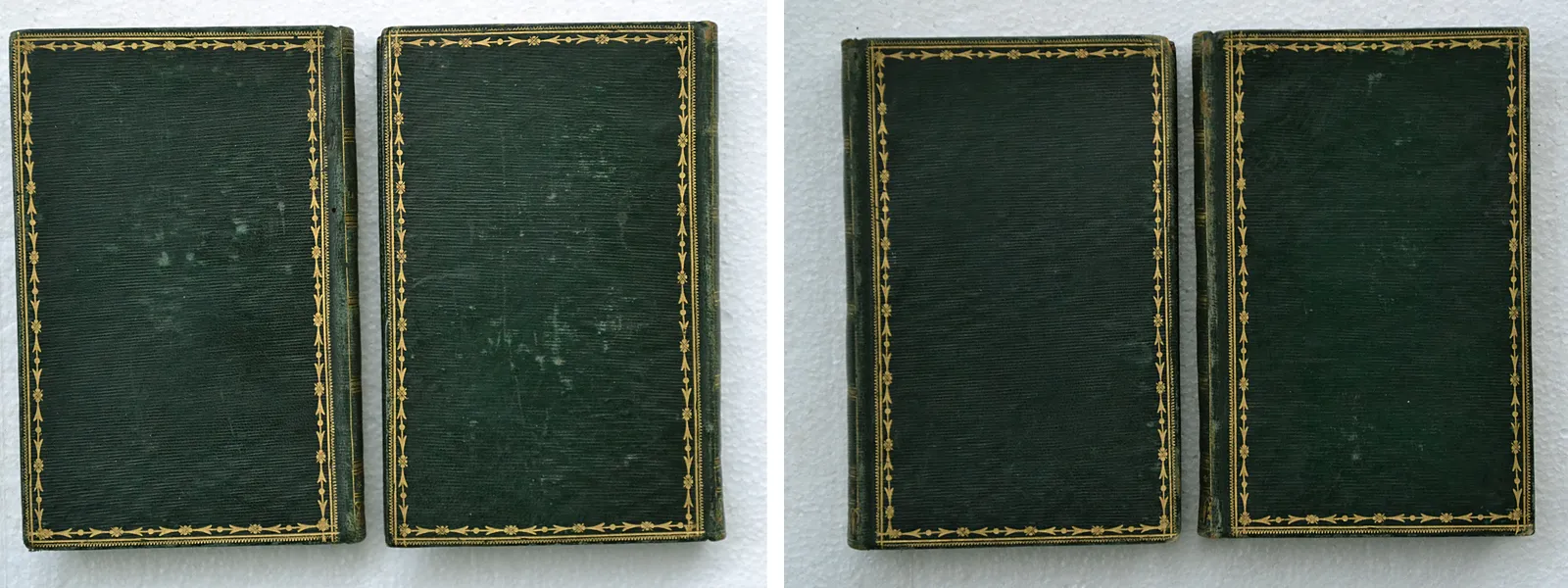 Deux volumes in-12 (10,5 x 16cm.) de (7ff.) – 240 pp. – (1f.) + (4ff.) – 285(1) pp. ; maroquin vert à grain long, encadrement de roulettes et filet dorés sur les plats, dos lisses ornés, roulettes dorées sur les coupes et à l’intérieur, tranches dorées (reliure du début du XIX° siècle).