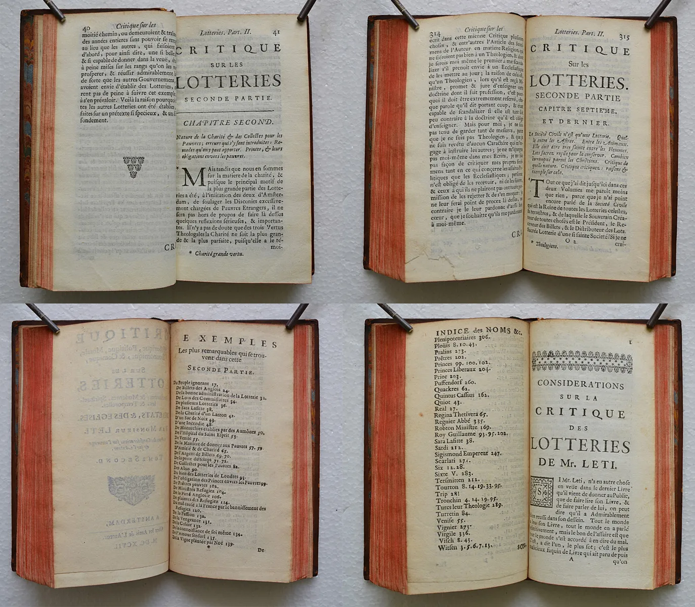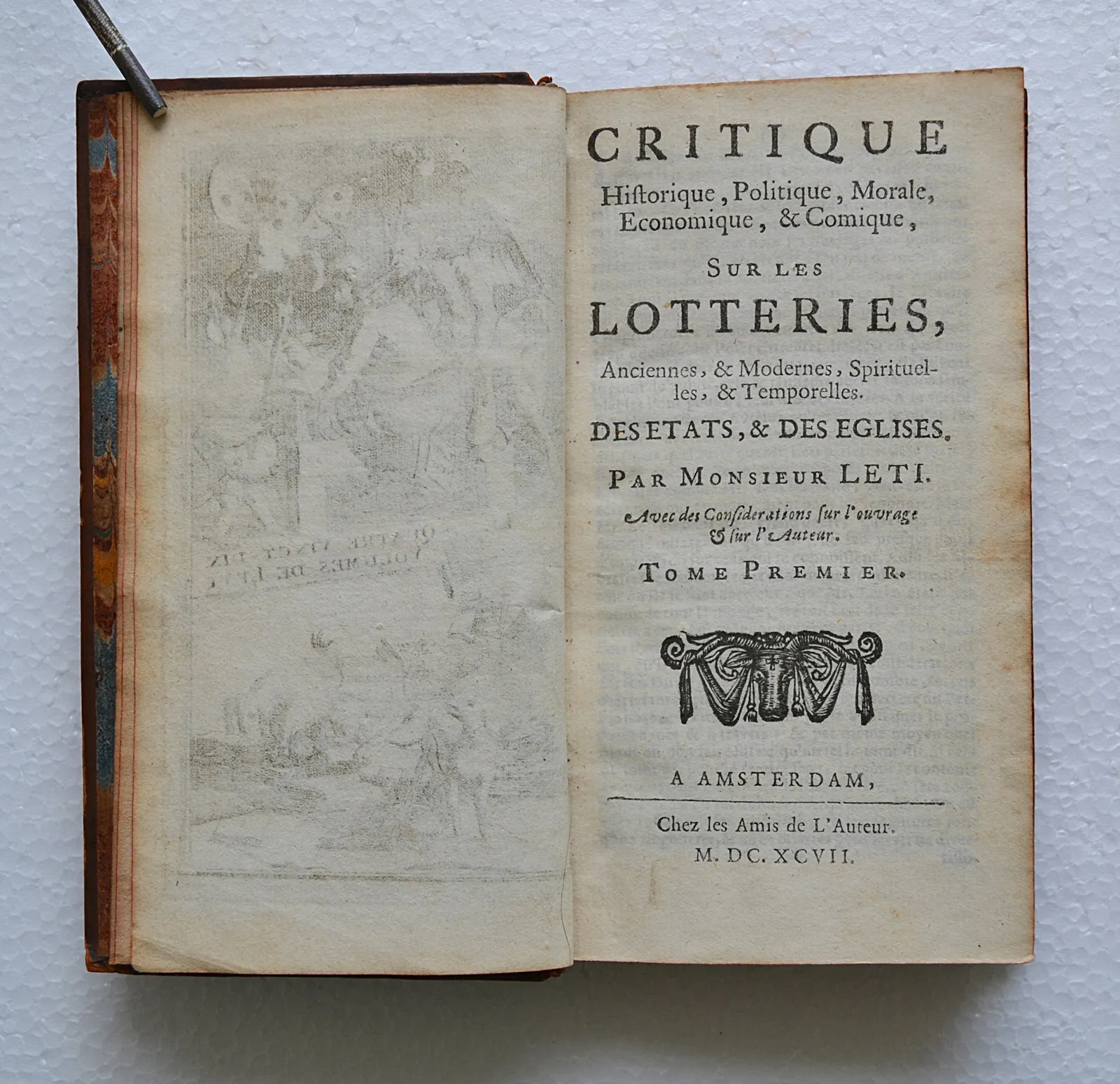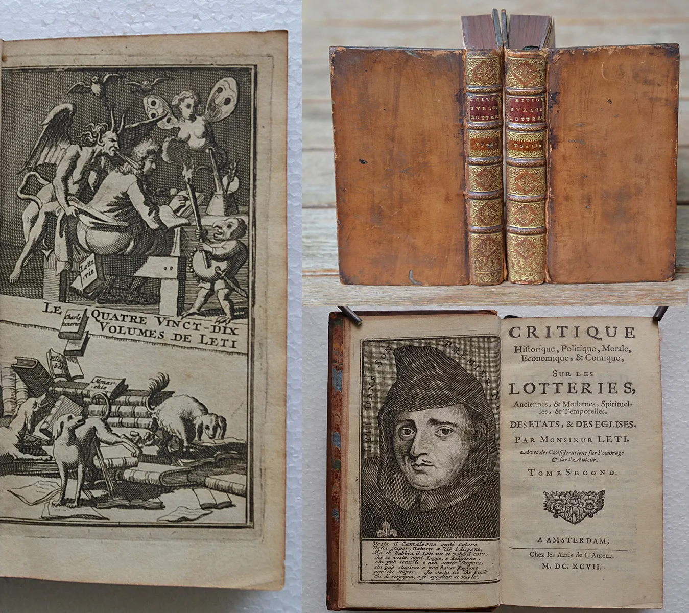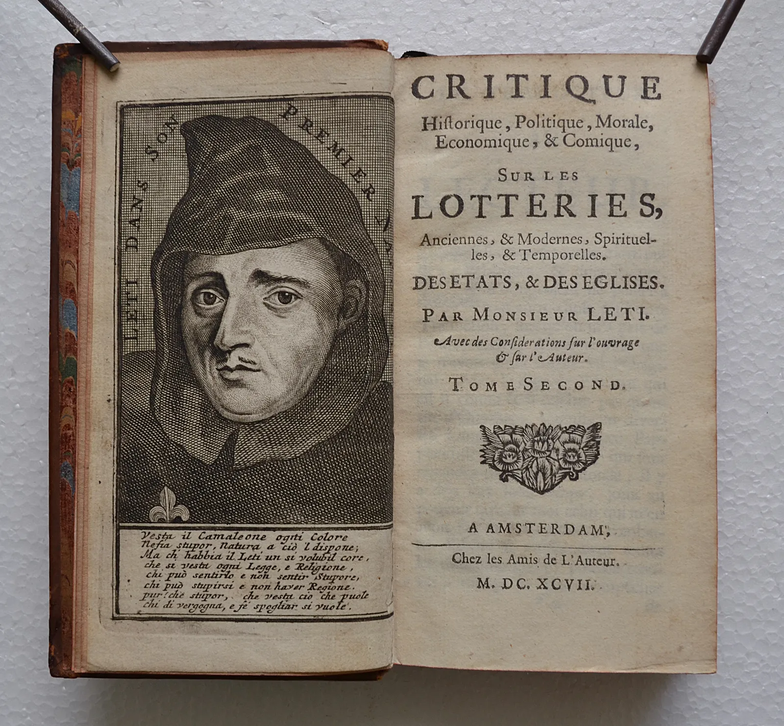 « Historiographe du roi Charles II d’Angleterre, l’Italien Gregorio Leti (1630-1701) s’est converti dans sa jeunesse au calvinisme – bien qu’il défende l’idée que toutes les religions ont les mêmes fondements, La Trinité, l’Incarnation et la Vertu. Le monde apparaît à ses yeux comme une immense loterie : il en est ainsi du mariage et du climat, de la politique et de la médecine et même de la création du monde, présentée comme une loterie entre Adam, Ève et le Démon. L’être humain ne pouvant se contenter de vivre heureux avec peu de biens, il est légitime qu’il s’adonne à la loterie en espérant gagner gros. On ne saurait donc condamner ces pratiques aléatoires simples, naturelles et innocentes, puisqu’elles servent les intérêts de l’État, de l’Église et des familles tout en adoucissant la misère des pauvres. Gregorio Leti rédige pourtant cet ouvrage principalement à des fins de critique sociale et religieuse, préconisant que les bénéfices et les emplois dans l’Église soient tirés au sort, chez les catholiques comme chez les protestants ». (BNF / exposition sur les jeux).