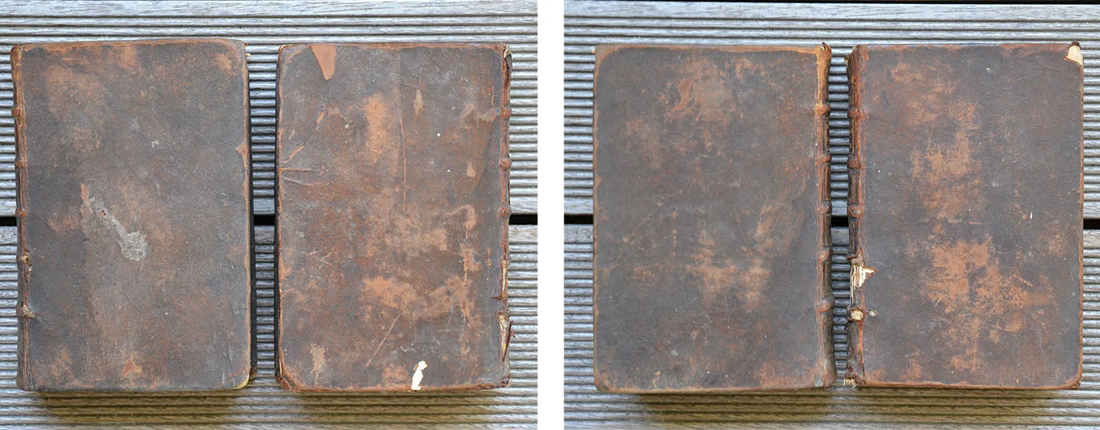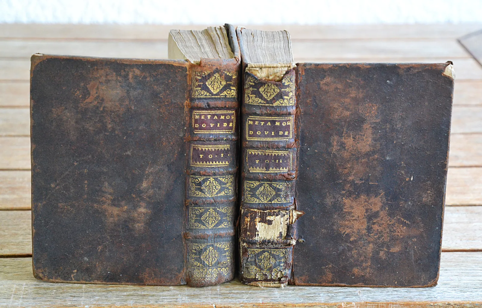 Accrocs avec perte de cuir sur le dos (mors fendillés) et les coiffes du T2 ; petite perte de cuir et décollement sur la coiffe du T1 ; épidermures ; coins éclatés ; déchirures sur deux feuillets, sans perte de texte, dont une avec un morceau détaché (p.185 du T2) ; traces de mouillures et de salissures sur plusieurs feuillets.