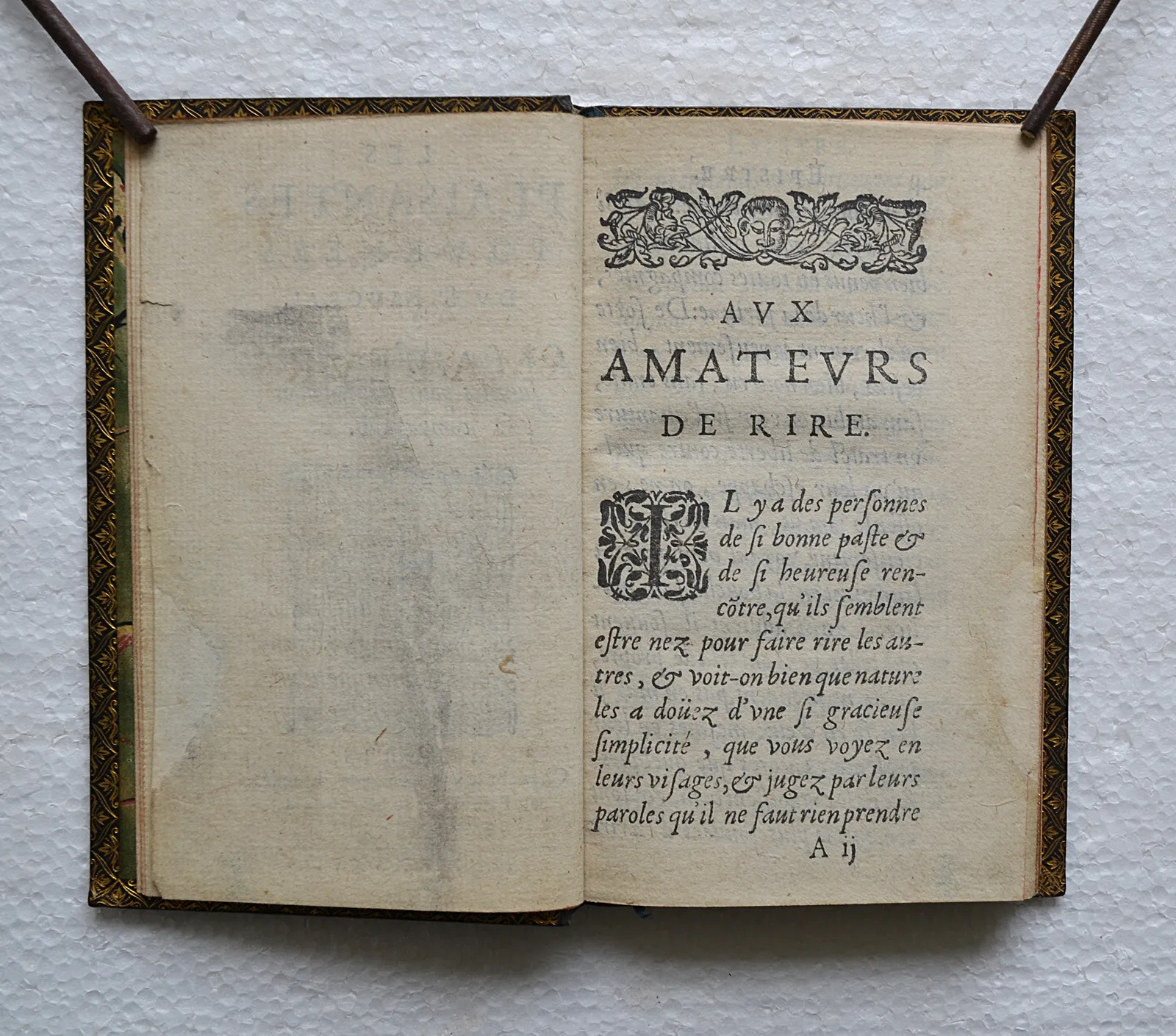 Rare recueil du XVIIe siècle de bons mots et de récits comiques en maroquin bleu-nuit richement orné, signé Corfmat, avec annotations manuscrites à l'encre rouge du XIXe siècle.