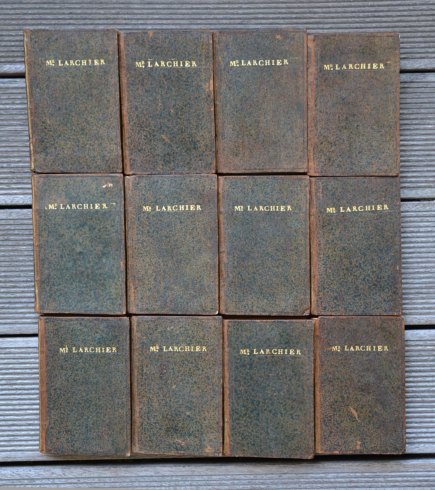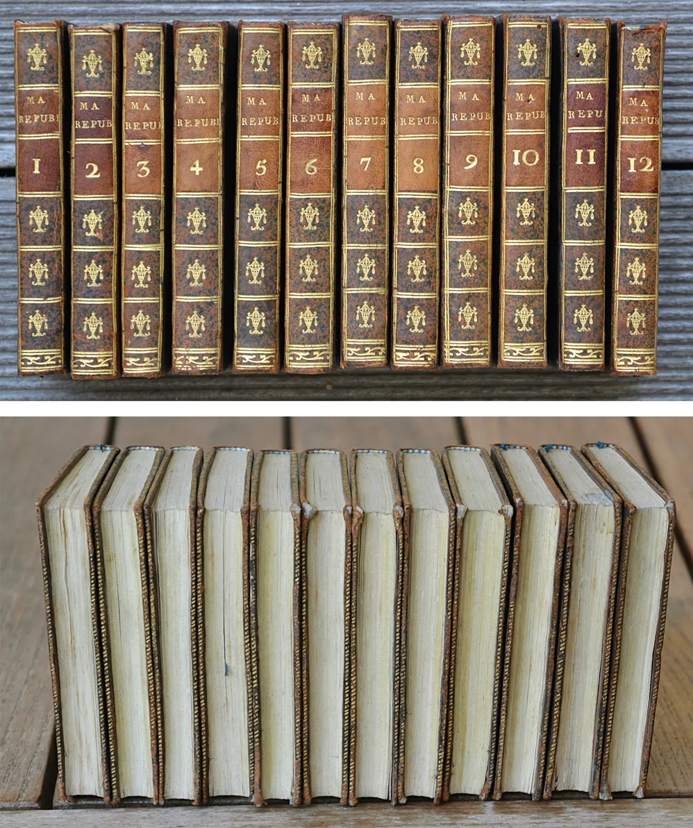 12 volumes in-24 (8,5 x 13 cm.) de : (2ff.) – 193 pp. + (2ff.) – 214 pp. + (2ff.) – 184 pp. + (2ff.) – 215 pp. + (2ff.) – 220 pp. + (2ff.) – 235 pp. + (2ff.) – 216 pp. + (2ff.) – 212 pp. + (2ff.) – 142 pp. – (1f.) + (2ff.) – 216 pp. + (2ff.) – 208 pp. – (2ff.) – 214 pp. ; basane fauve mouchetée, super libris : Mr. Larchier sur les premiers plats, dos lisses ornés, filet doré sur les coupes (reliure de style Directoire).