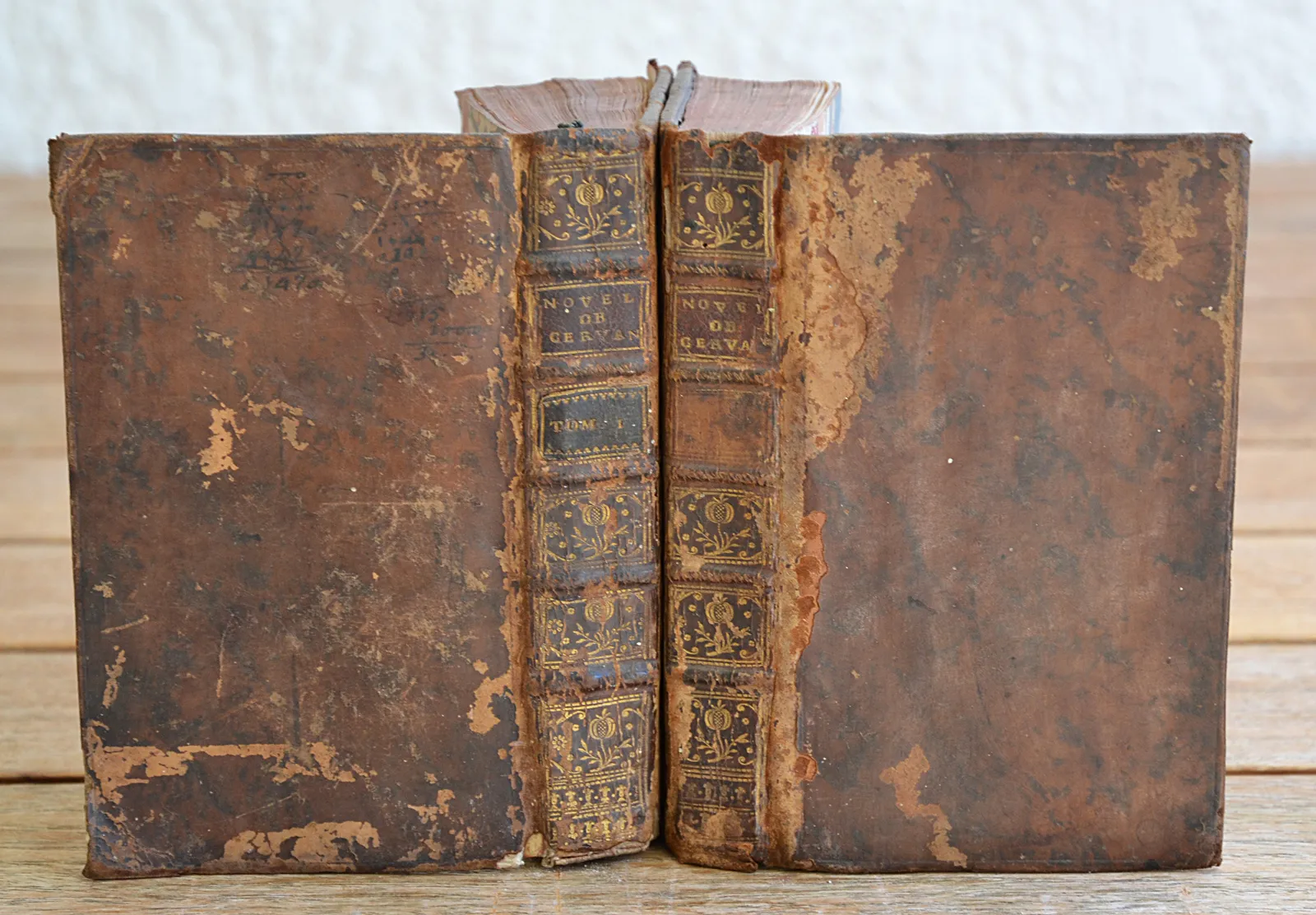 Pièce de tomaison du T2 absente ; accrocs avec perte de cuir sur trois coiffes ; épidermures et accrocs avec parfois de petites pertes de cuir ; coupes et coins frottés par endroits avec des pertes de cuir ; premier feuillet blanc presque détaché ; un petit trou de ver dans la marge inférieure des 8 premiers feuillets du T2 ; plats un peu « ouverts ».