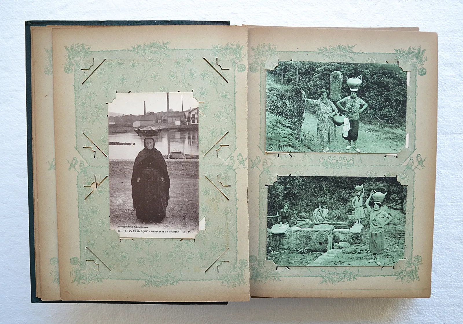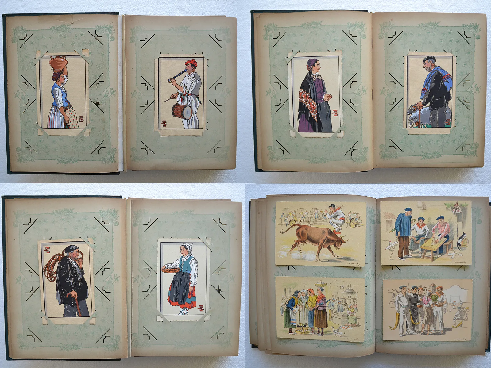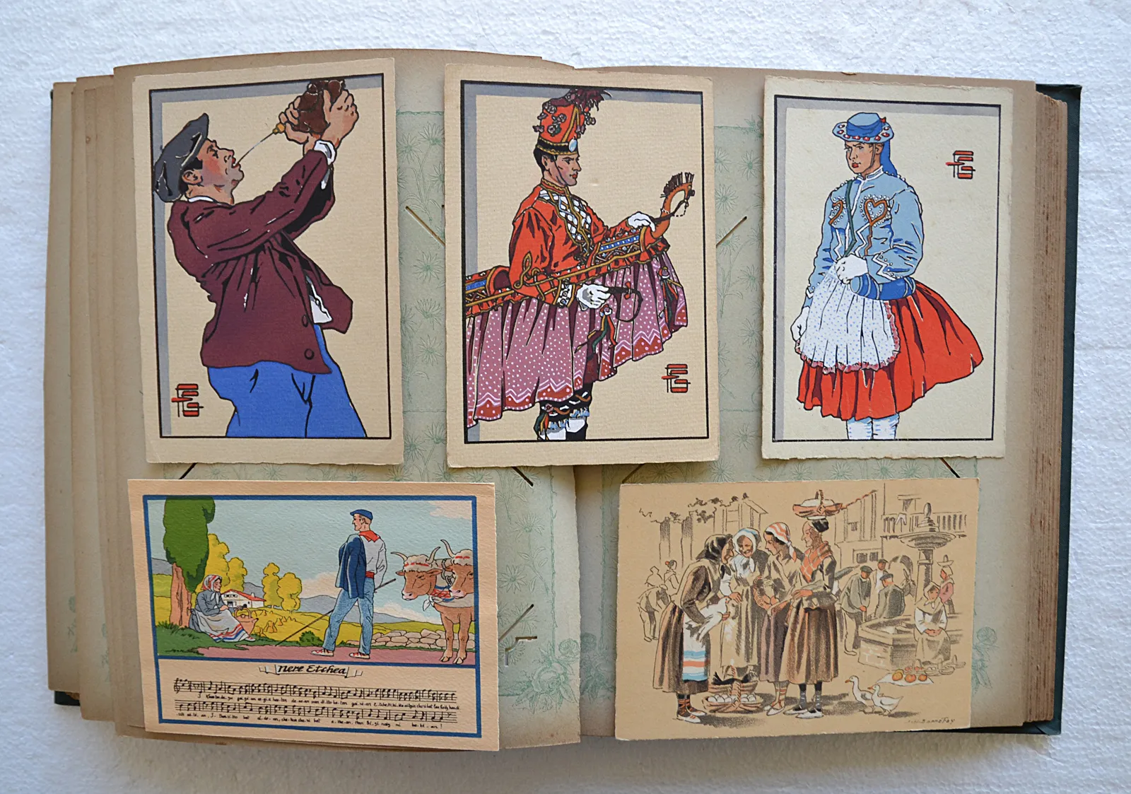 Album de 170 cartes postales et photographies du Pays Basque, dont 39 cartes d'artistes (Géo-Fourrier, Floutier, Tillac, Le Tanneur) et un carnet de tableaux basques.