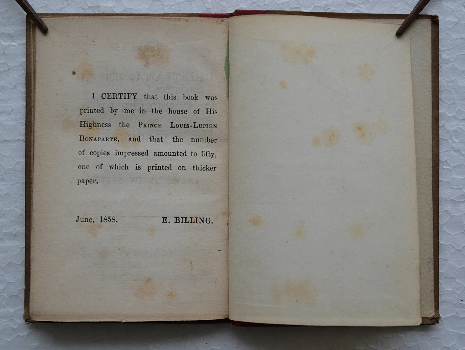 « I certify that this book was printed by me in the house of His Highness the Prince Louis-Lucien Bonaparte, and that the number of copies impressed amounted to fifty, one of which is printed on thicker paper. June, 1858, E. Billing »