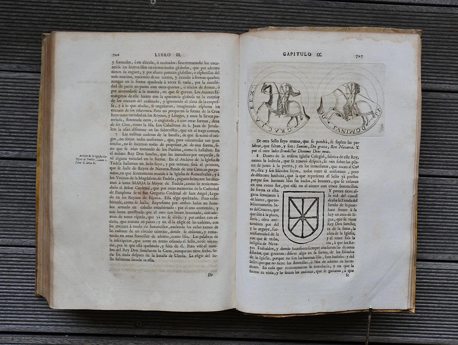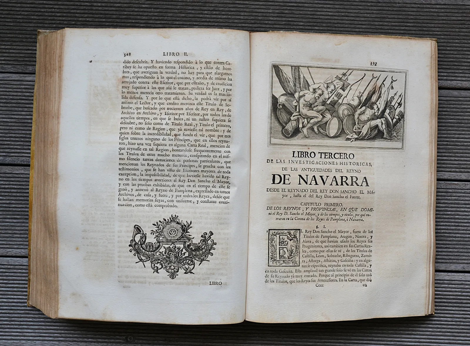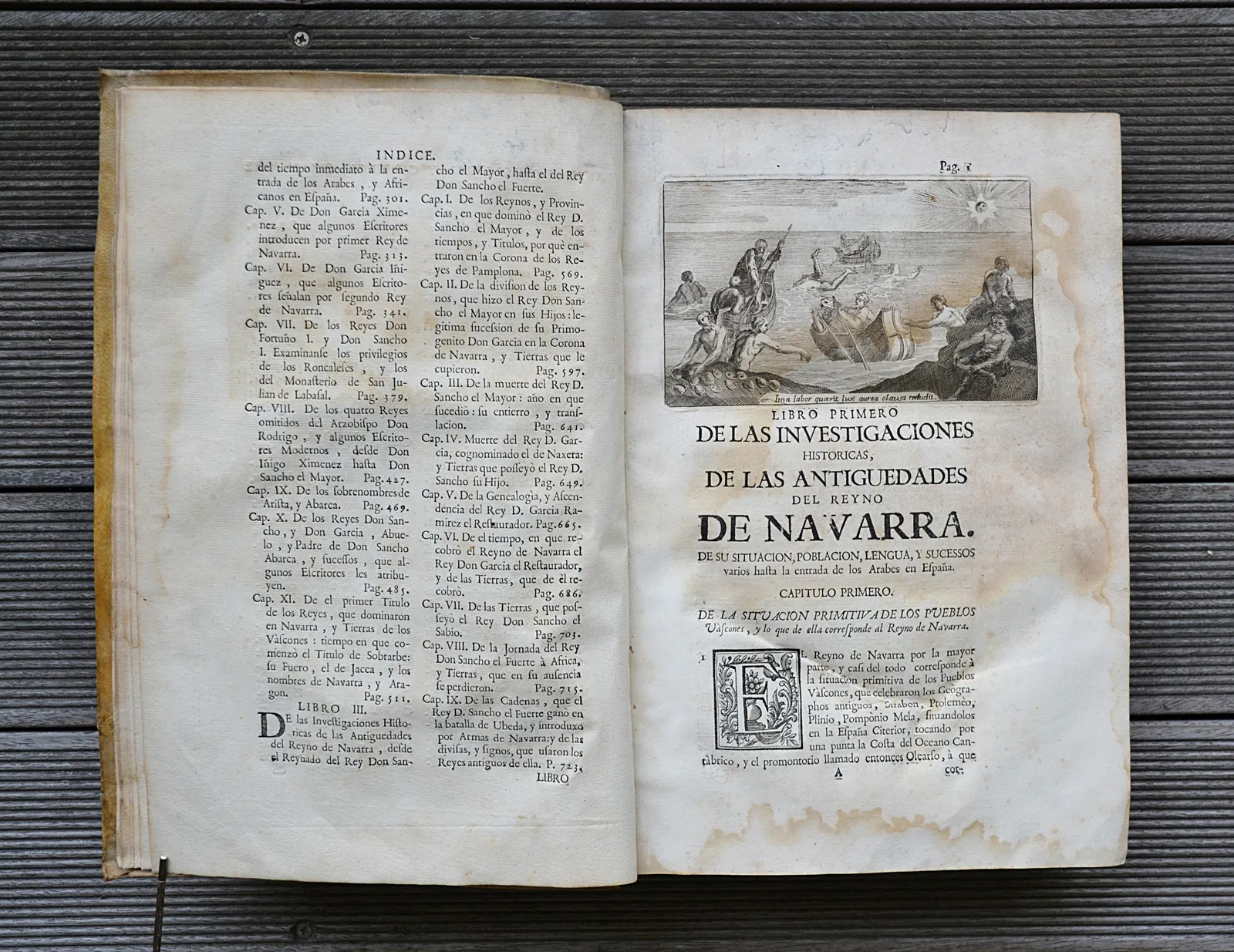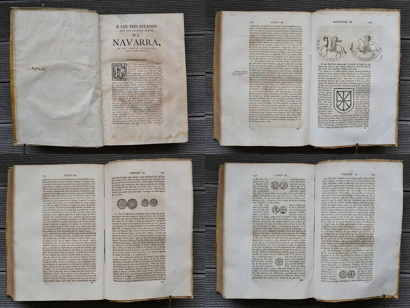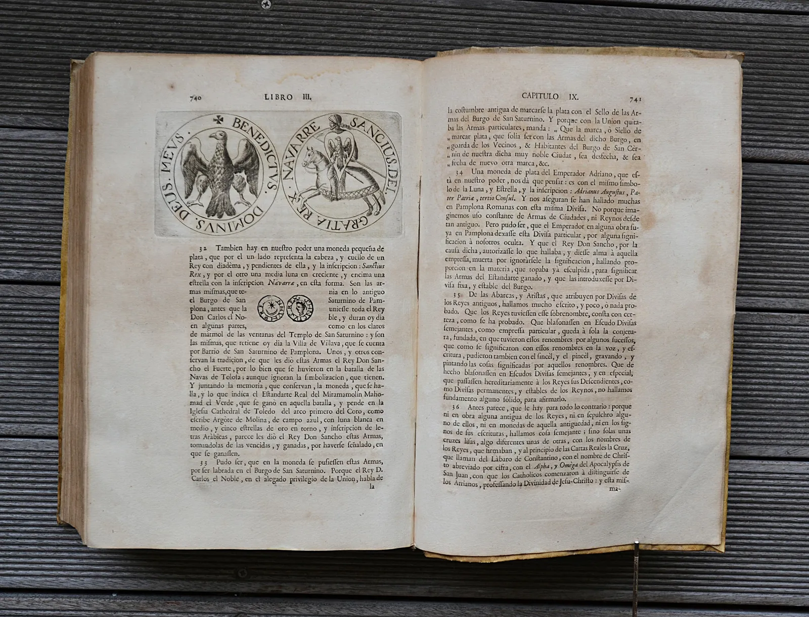Fort in-folio en vélin ivoire souple d'origine, rare impression de Pampelune de 1766. Provenance du Château d'Arcangues, avec de nombreuses vignettes gravées et dix gravures de numismatique.