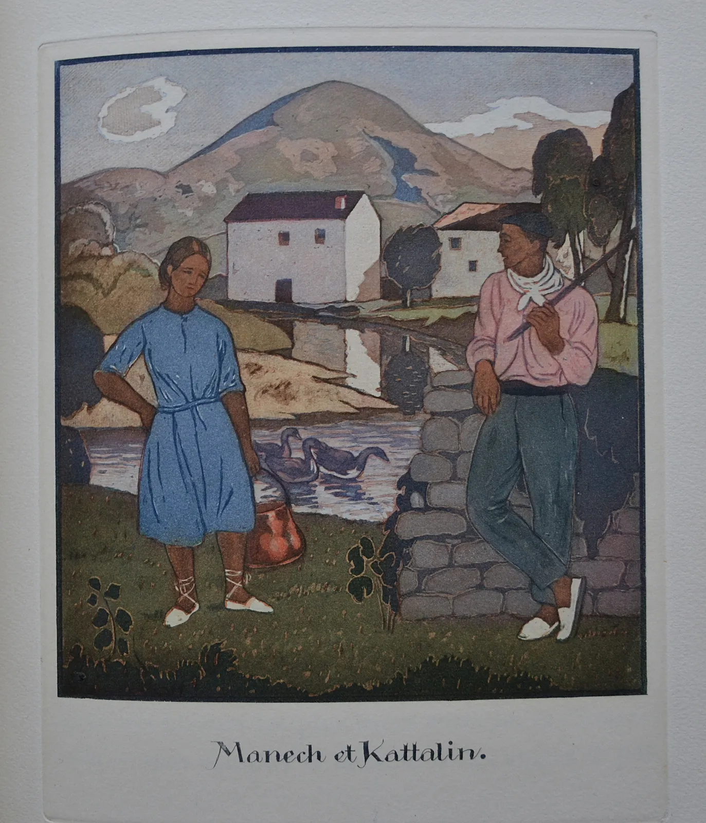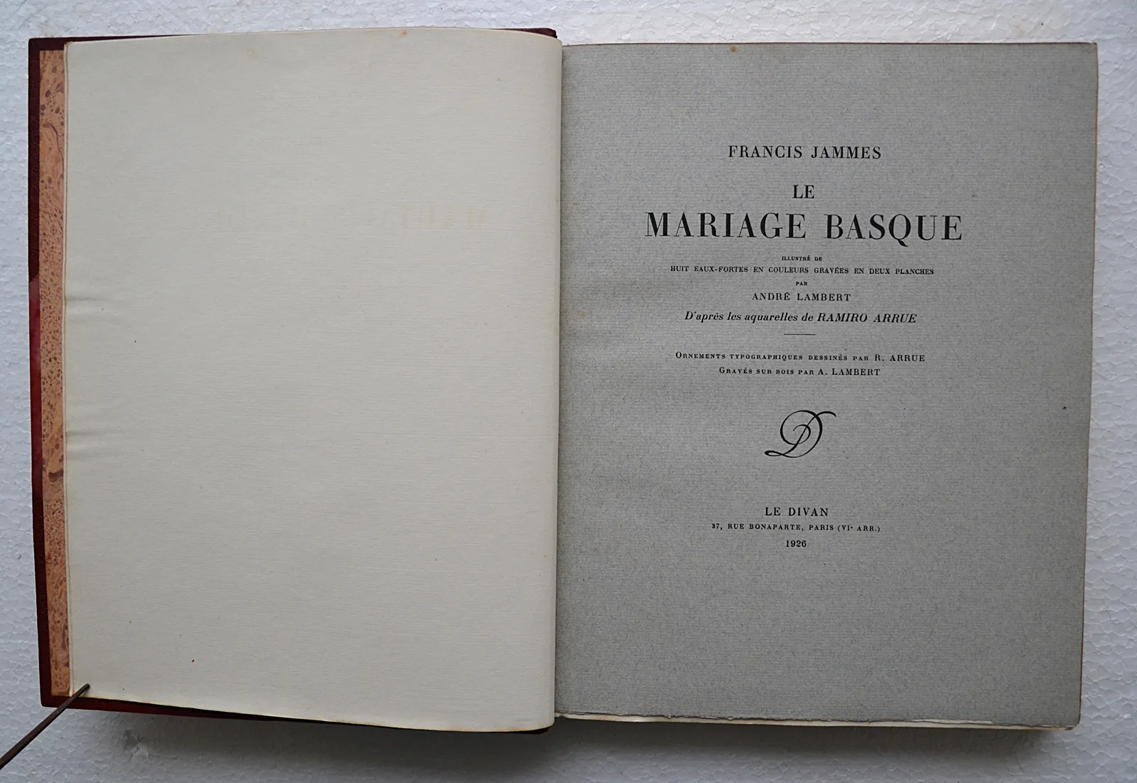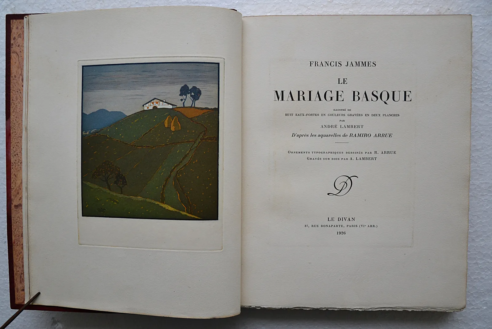 Le mariage basque. Illustré de huit eaux-fortes en couleurs gravées en deux planches par André Lambert, d’après les aquarelles de Ramiro Arrue. Ornements typographiques dessinés par R. Arrue, gravés sur bois par A. Lambert