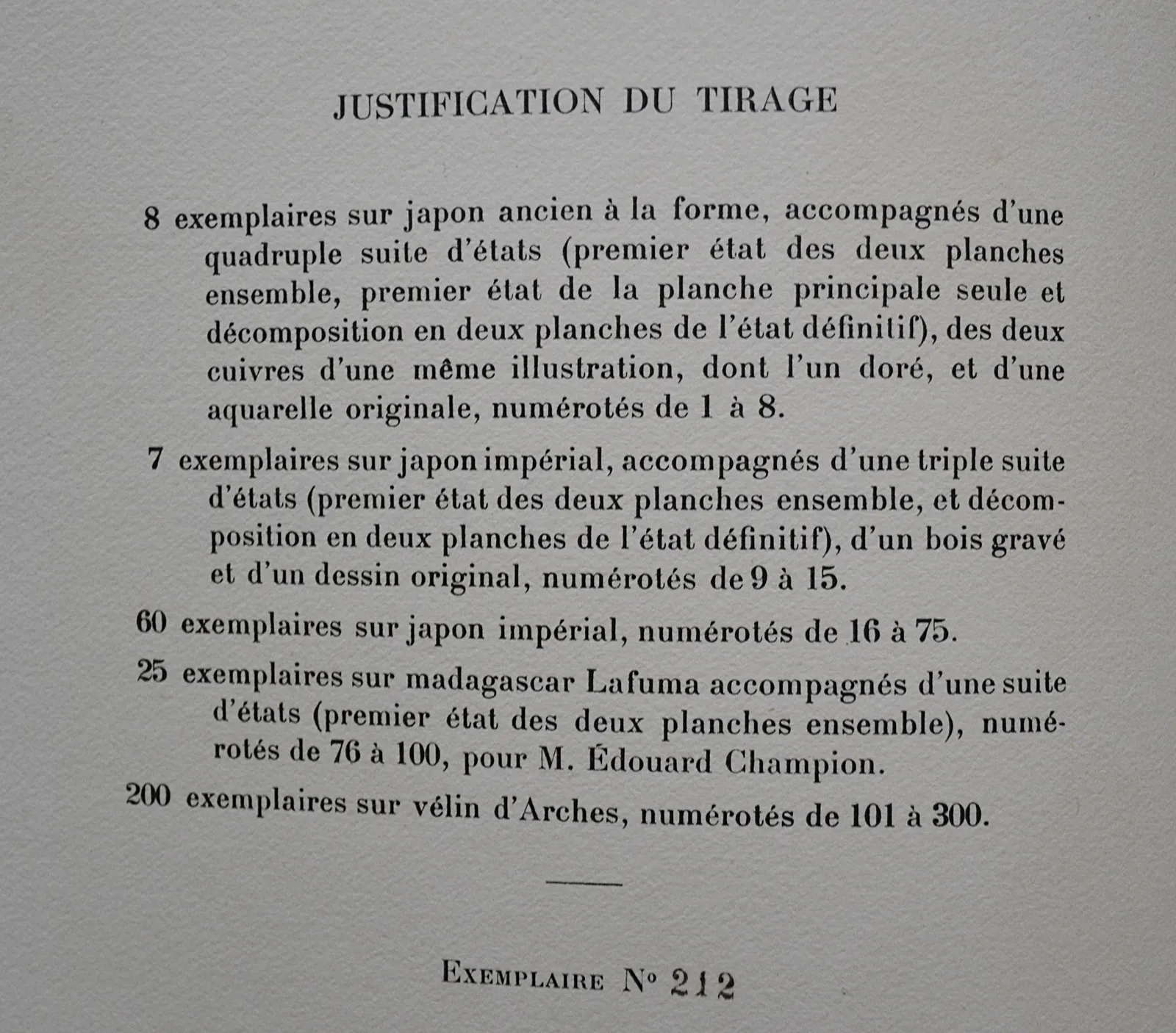 Tirage unique à 300 exemplaires, celui-ci, un des 200 exemplaires sur vélin d’Arches, numérotés de 101 à 300 (n°212). L’ouvrage est illustré de huit eaux-fortes en couleurs, de sept en-têtes, de sept lettrines et d’un cul-de-lampe, dessinés par Ramiro Arrue.