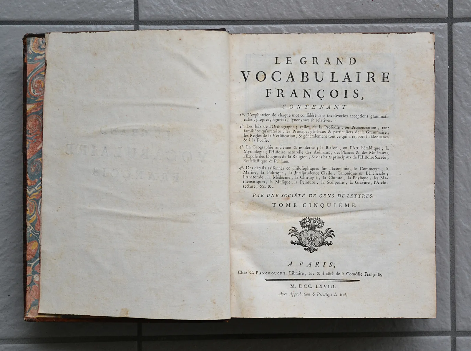 Boite à cigares composée de deux ouvrages in-4° (20 x 26cm.) du XVIII° siècle en veau de l’époque avec des armes royales sur le premier plat du Grand vocabulaire François (1768).