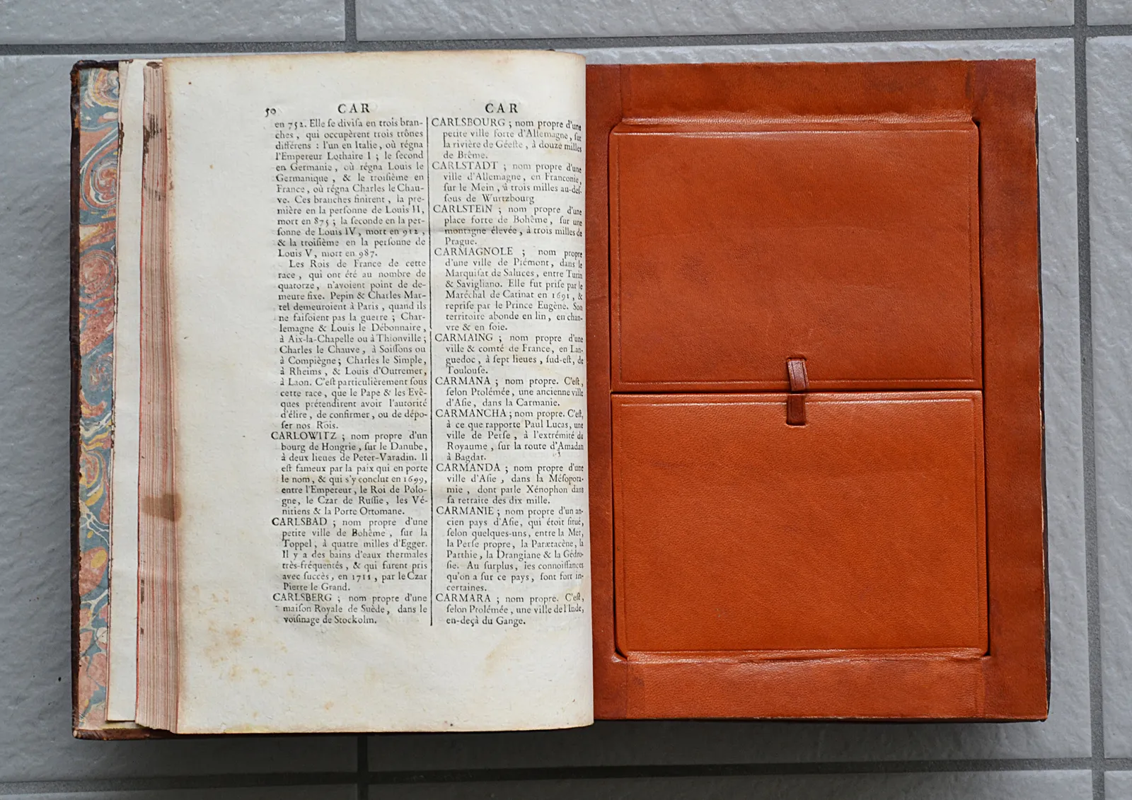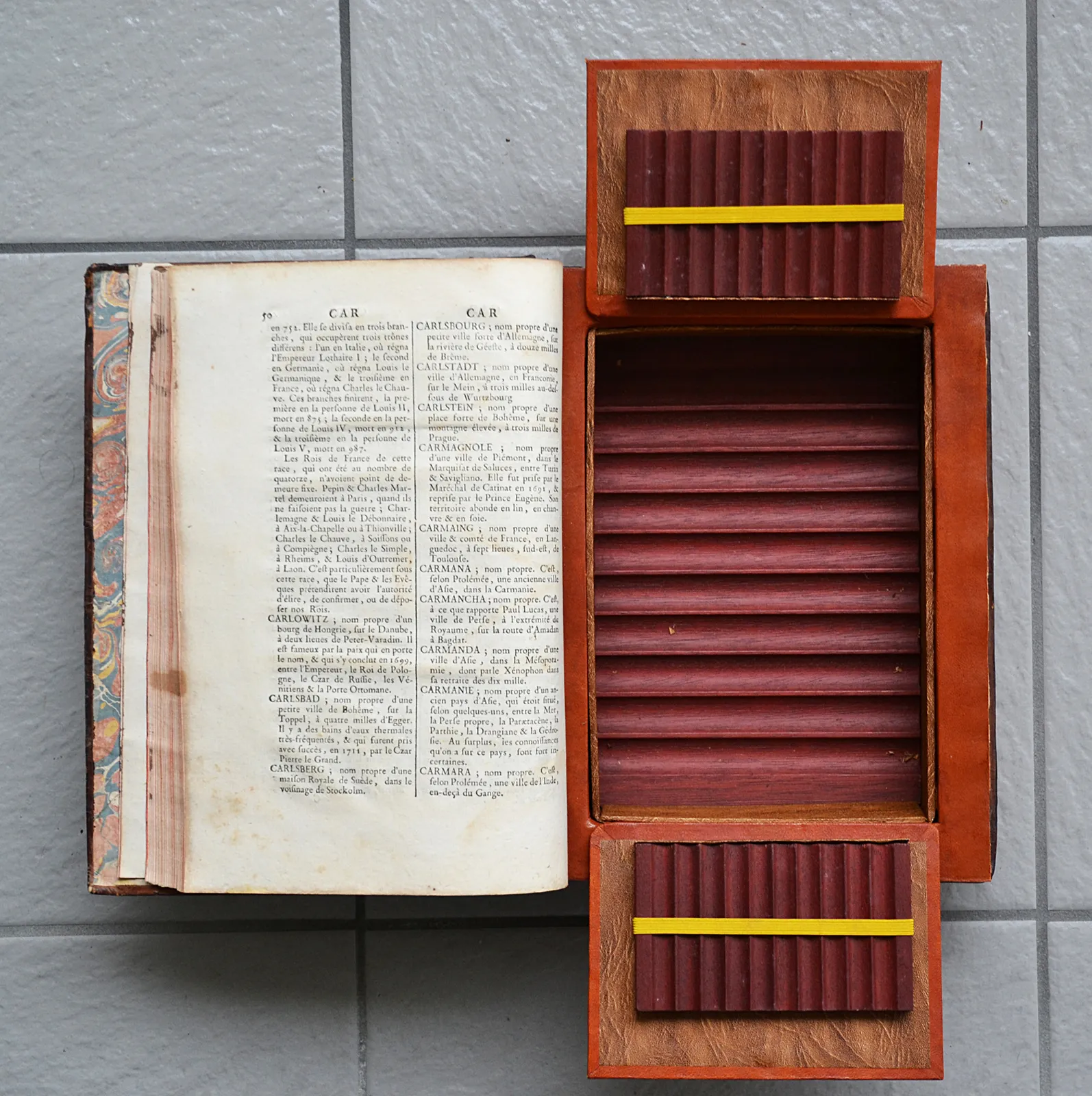 Ingénieuse boîte à cigares composée de deux ouvrages du XVIIIe siècle en veau d'époque, ornée des armes royales sur le premier plat du Grand vocabulaire François.