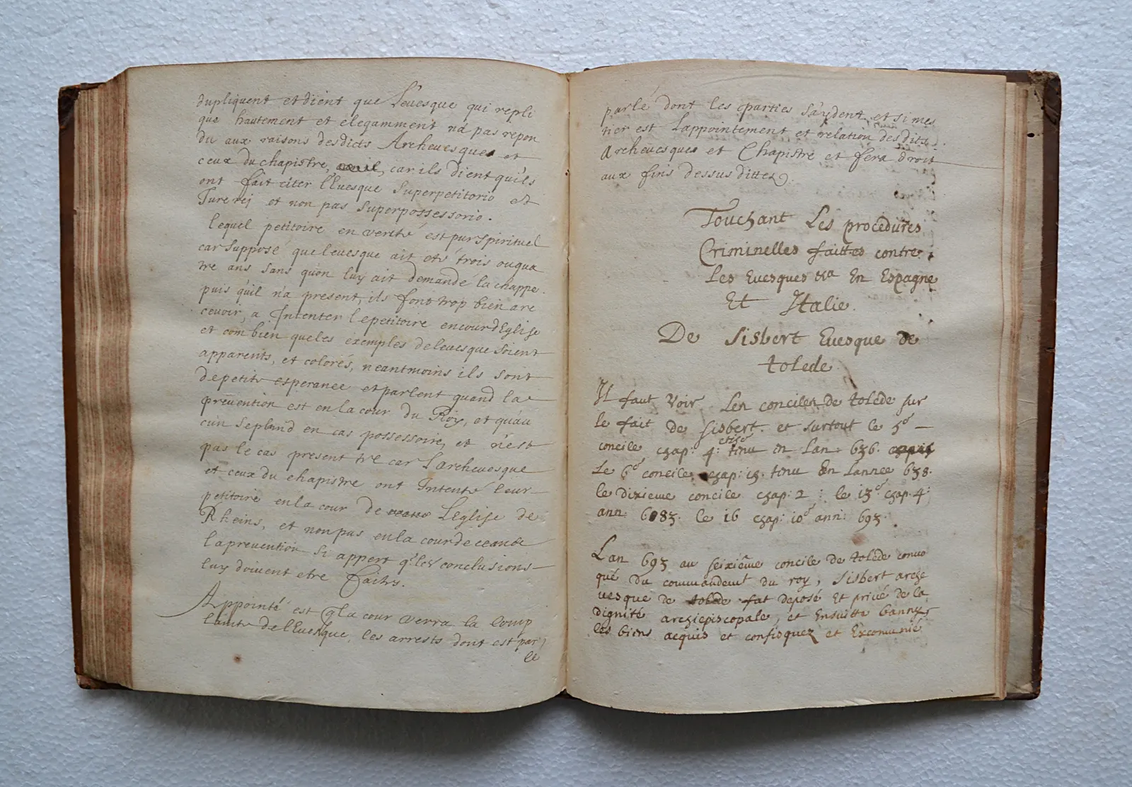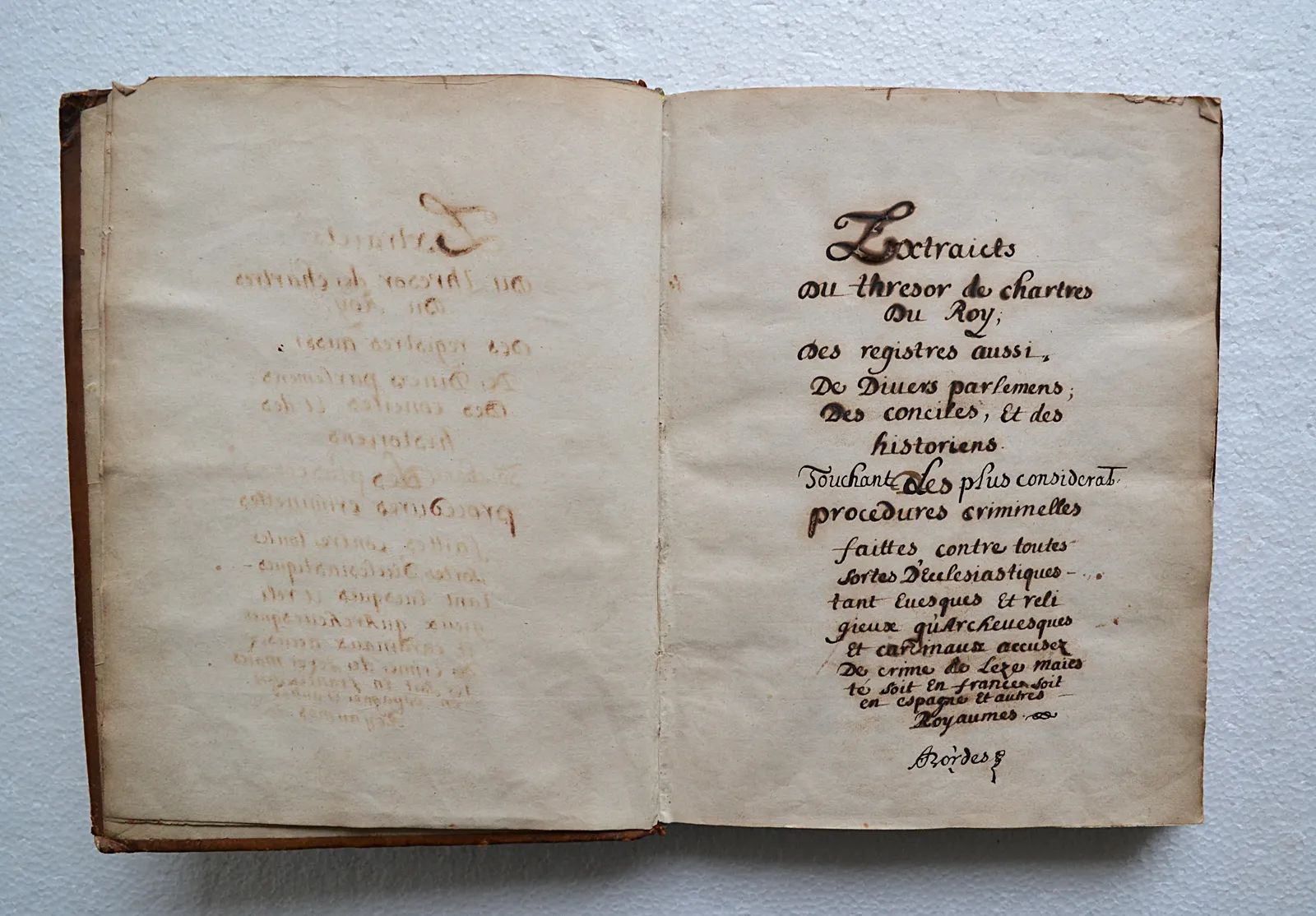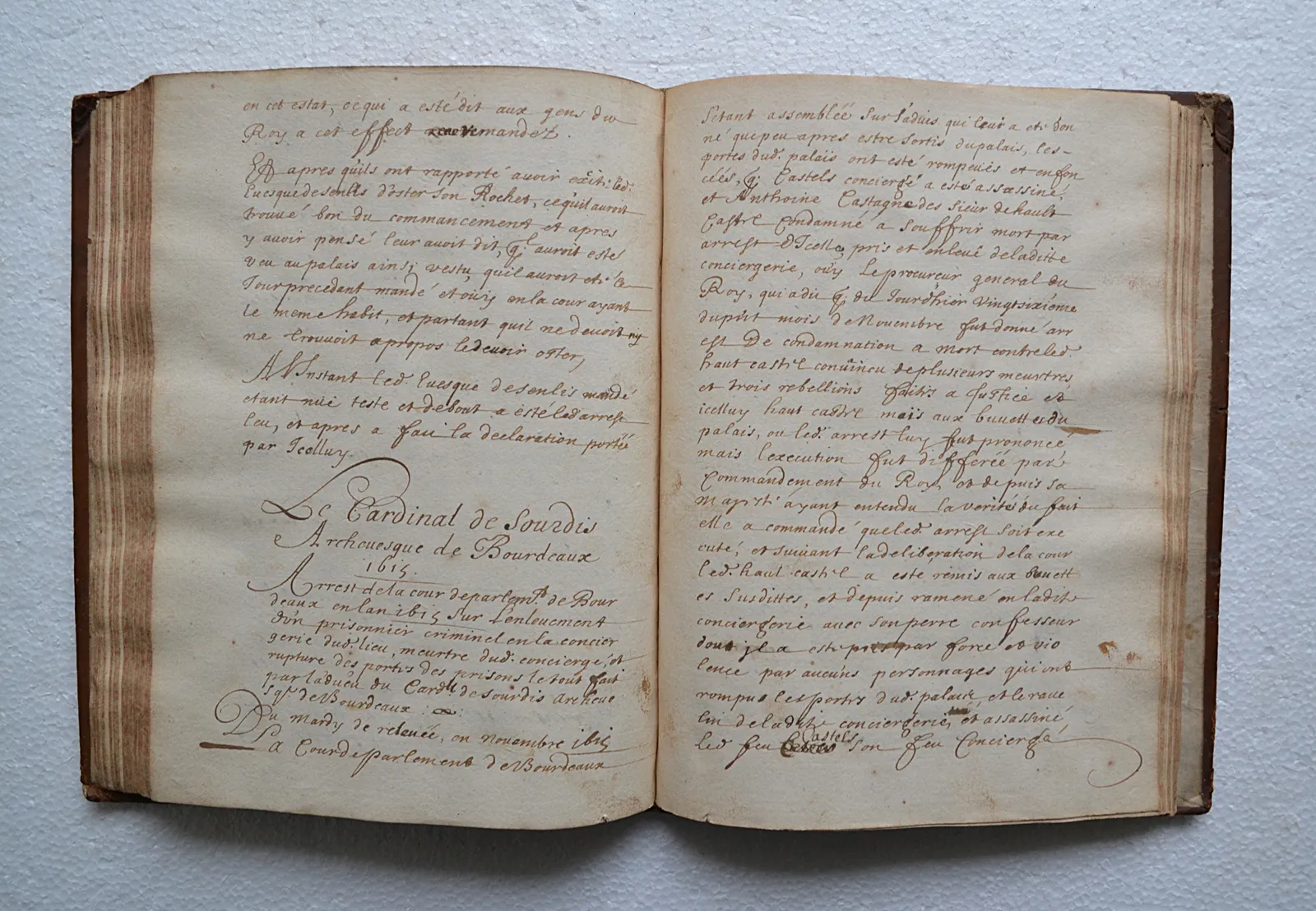 Important manuscrit anonyme du XVIIe siècle, recueil de procédures criminelles célèbres contre des ecclésiastiques accusés de crime de lèse-majesté, des évêques aux cardinaux.