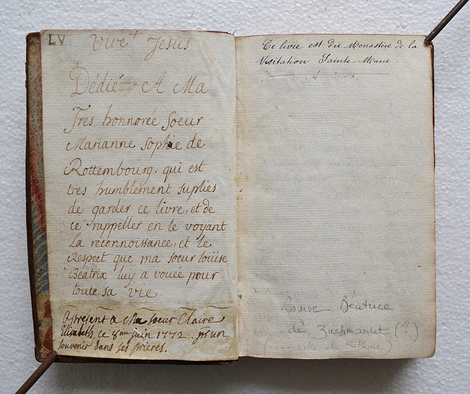 Ex-dono au verso de la première contregarde : « Dédié à ma très honorée Sœur Marianne Sophie de Rottembourg (…) » + Une autre mention mention manuscrite : « A présent à ma sœur Claire Élisabeth ce 8 juin 1772 (…) »