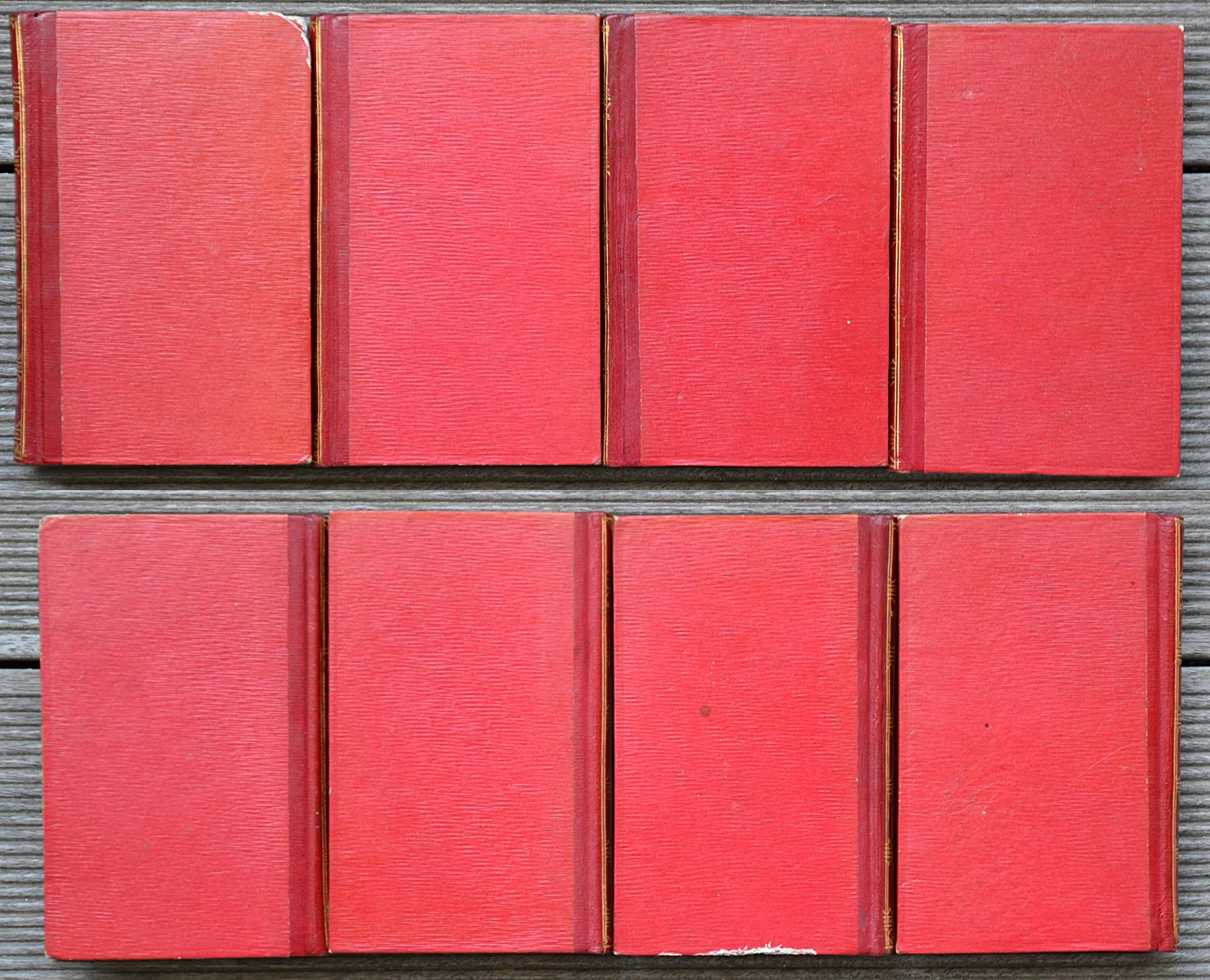 Quatre volumes in-18 (9,5 x 14,8 cm.) de VIII – 244 pp. + (2ff.) – 248 pp. + XVII – 262 pp. + (2ff.) – 248 pp. ; demi-maroquin rouge à grain long de l’époque, dos lisses ornés (petite perte de cartonnage sur les coins supérieurs du T1 ; une coupe inférieure frottée au T3).