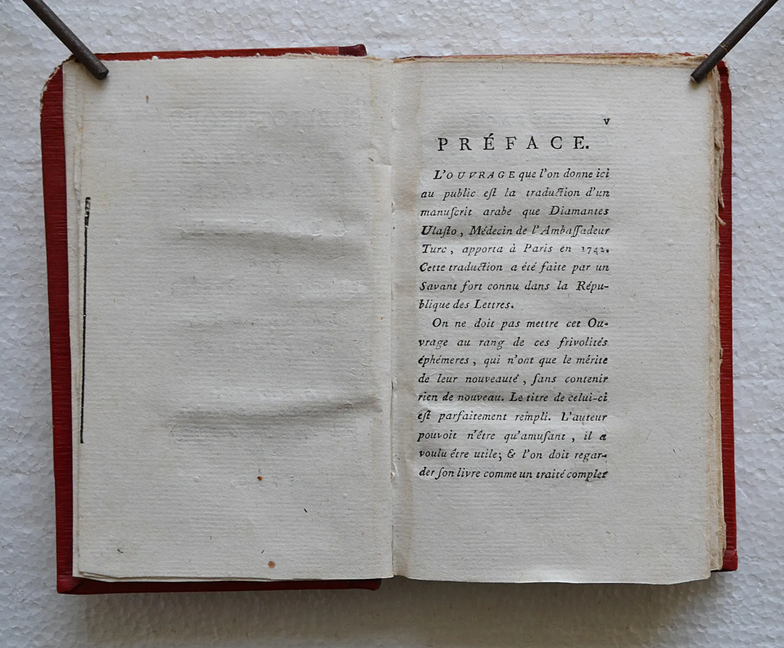 « L’ouvrage que l’on donne ici au public est la traduction d’un manuscrit arabe que Diamantes Ulasto, médecin de l’ambassadeur Turc, apporta à Paris en 1742 (…) L’on doit regarder son livre comme un traité complexe sur la beauté. En effet, tout ce qui peut la détruire ou la conserver, l’augmenter ou la diminuer se trouvera développé dans tout son jour. Causes physiques, causes morales, rien n’est omis ; l’auteur pénètre jusques dans le sanctuaire des plaisirs, mais sans effaroucher les grâces qui en gardent l’entrée (…) (Préface).