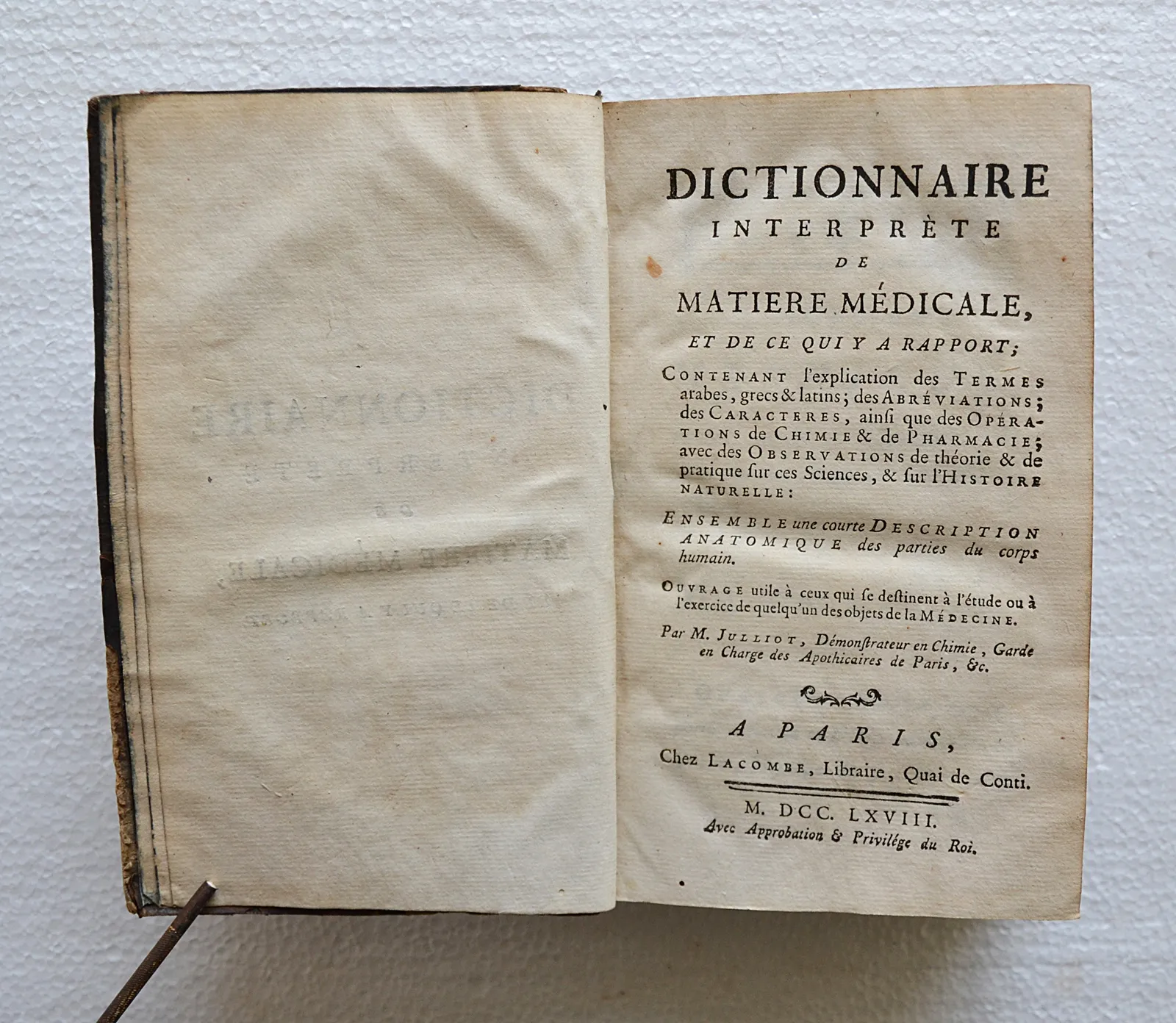 Dictionnaire interprète de matière médicale, et de ce qui y a rapport ; contenant l’explication des termes arabes, grecs & latins ; des abréviations ; des caractères, ainsi que des opérations de chimie & de pharmacie ; avec des observations de théorie & de pratique sur ces sciences, & sur l’histoire naturelle. Ensemble une courte description anatomique des parties du corps humain. Ouvrage utile à ceux qui se destinent à l’étude ou à l’exercice de quelqu’un des objets de Médecine.