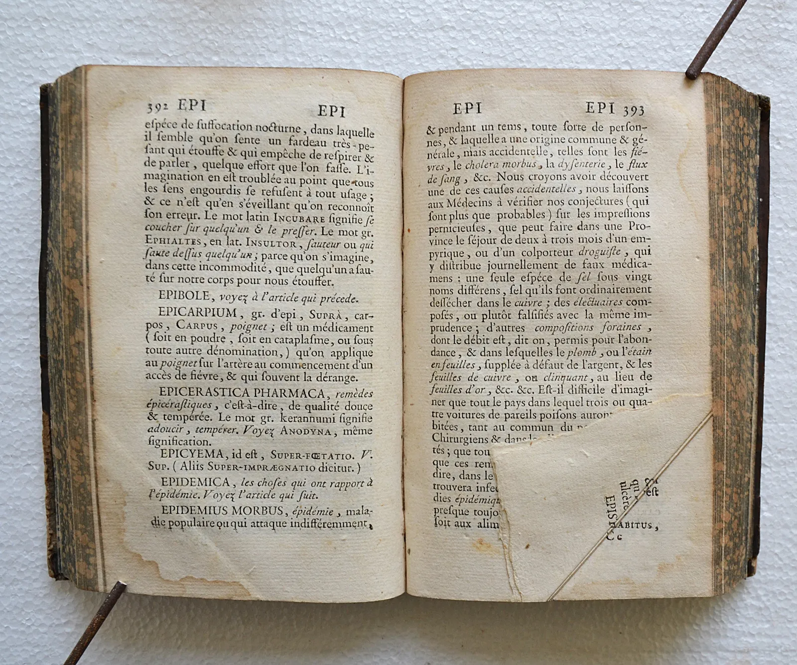 Coiffes absentes ; premier plat légèrement gondolé avec des accrocs sur les bords ; fente sur les mors supérieurs ; quelques traces de mouillure angulaire, sans gravité ; trois coins repliés (cf. photo).