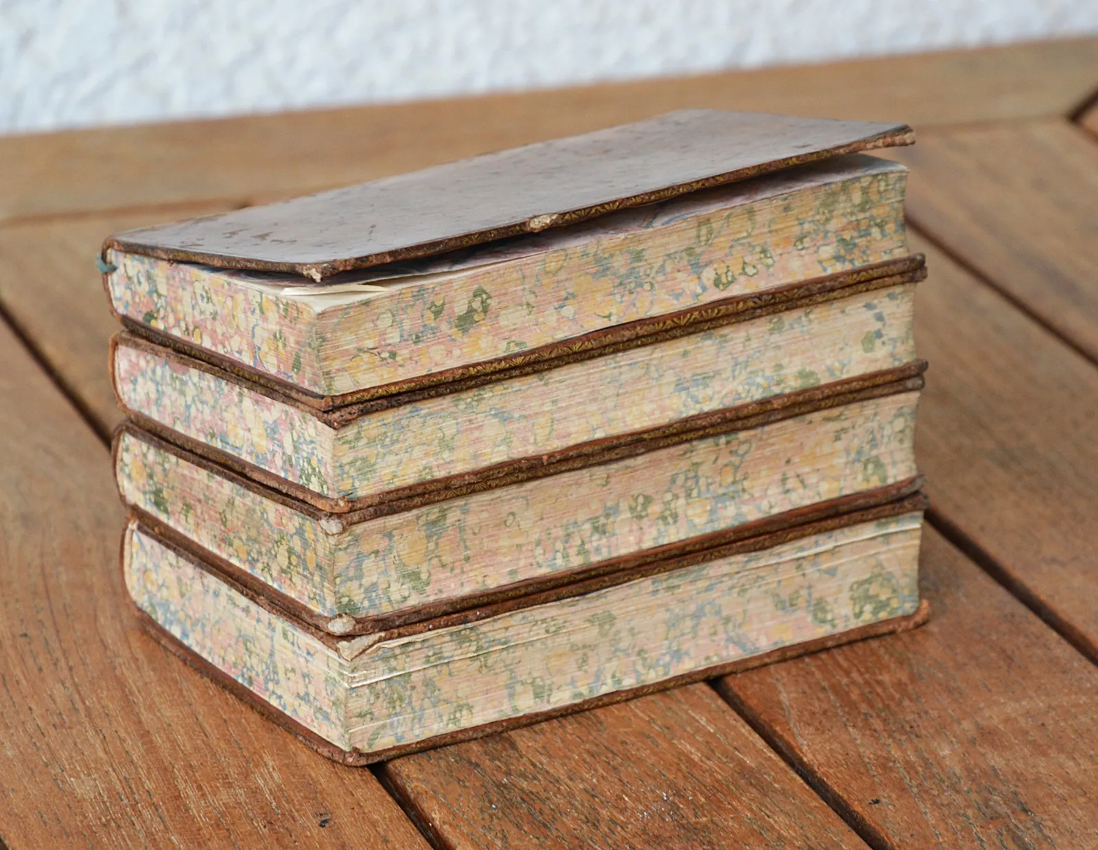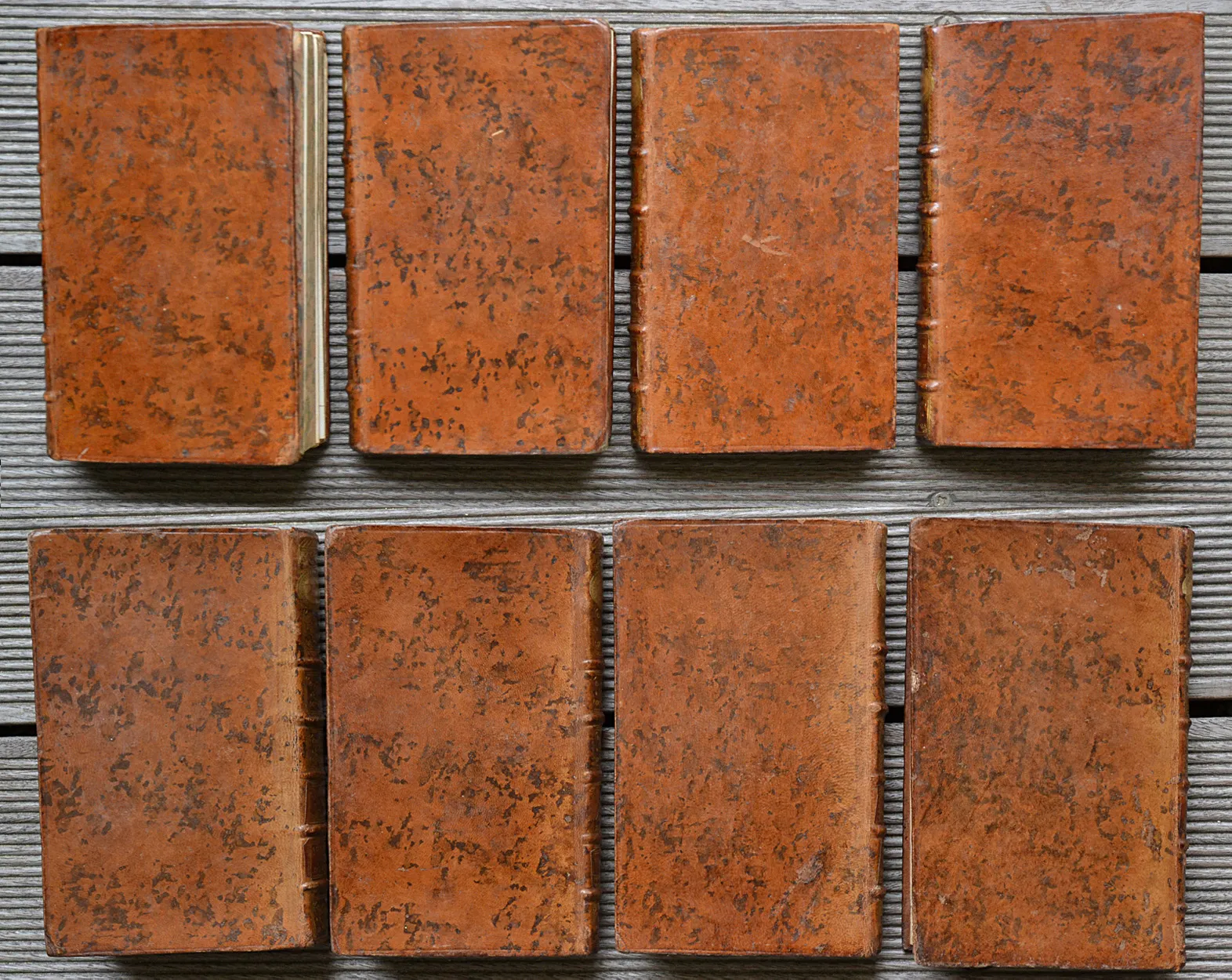 Quatre volumes in-8 (11,5 x 18,4 cm.) de CXXXII – (2ff.) – 340 pp. + (2ff.) – 432 pp. + (2ff.) – 411 pp. + (2ff.) – 404 pp. ; basane fauve marbrée, filet à froid sur les plats, dos à nerfs ornés, roulettes dorées sur les coupes, tranches marbrées, étiquette de bibliothèque de l’époque en queue de dos (reliure de l’époque).
