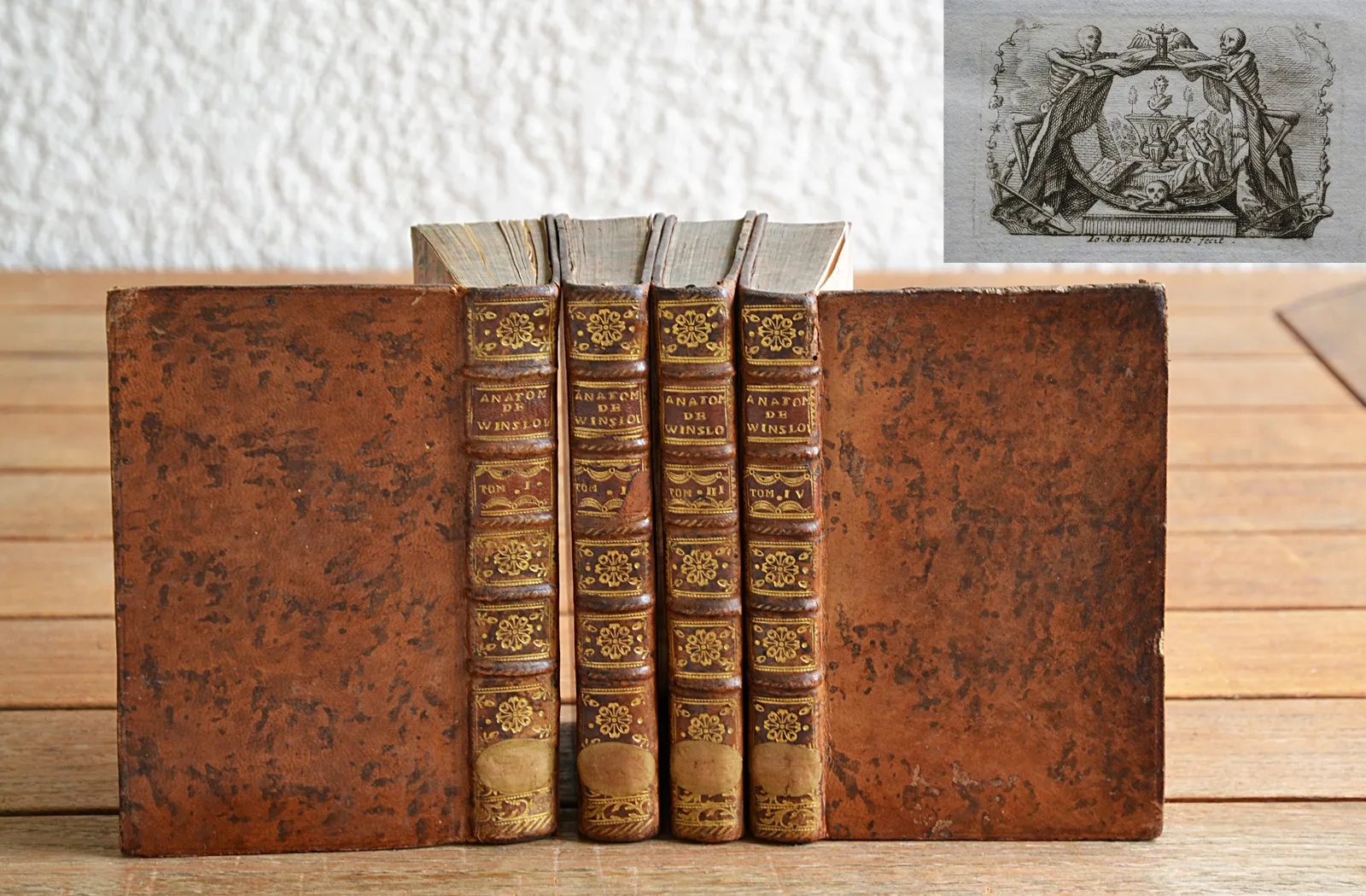 Quatre volumes en basane fauve marbrée de l'époque, ouvrage de référence du XVIIIe siècle pour l'anatomie descriptive, illustré de 9 planches dessinées par Holzhalb. Édition d'Amsterdam, 1752.