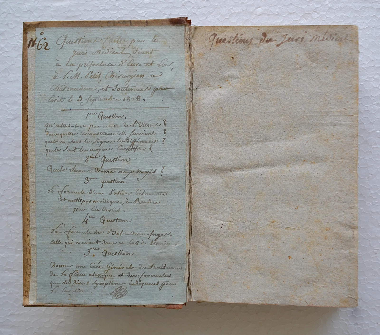 Notes manuscrites de l’époque sur la contregarde : « Questions faites pour le juris médical, séant à la préfecture d’Eure et Loir, à Mr. Petit, chirurgien à Châteaudun, et soutenu par écrit le 3 septembre 1808 (…) ».