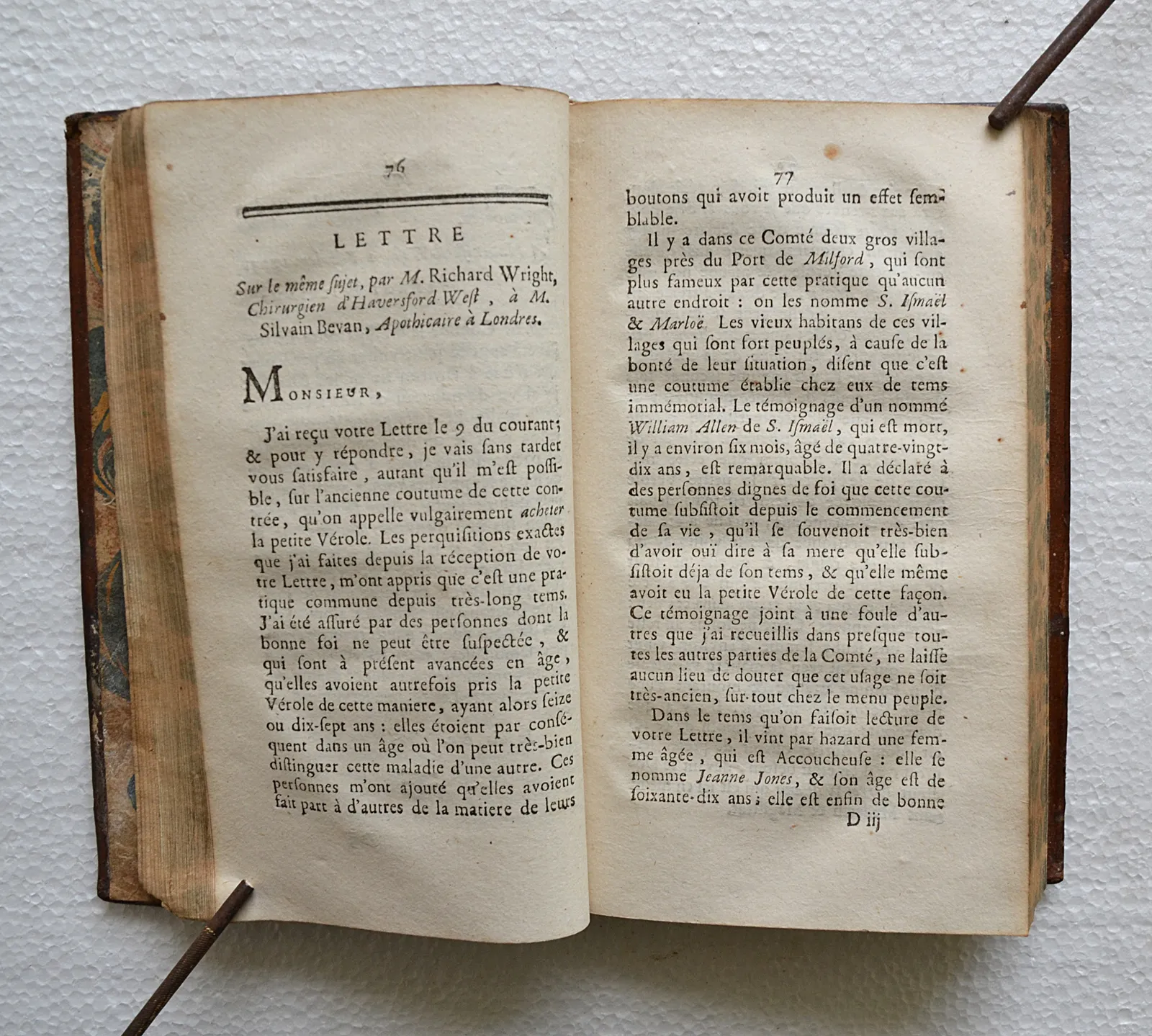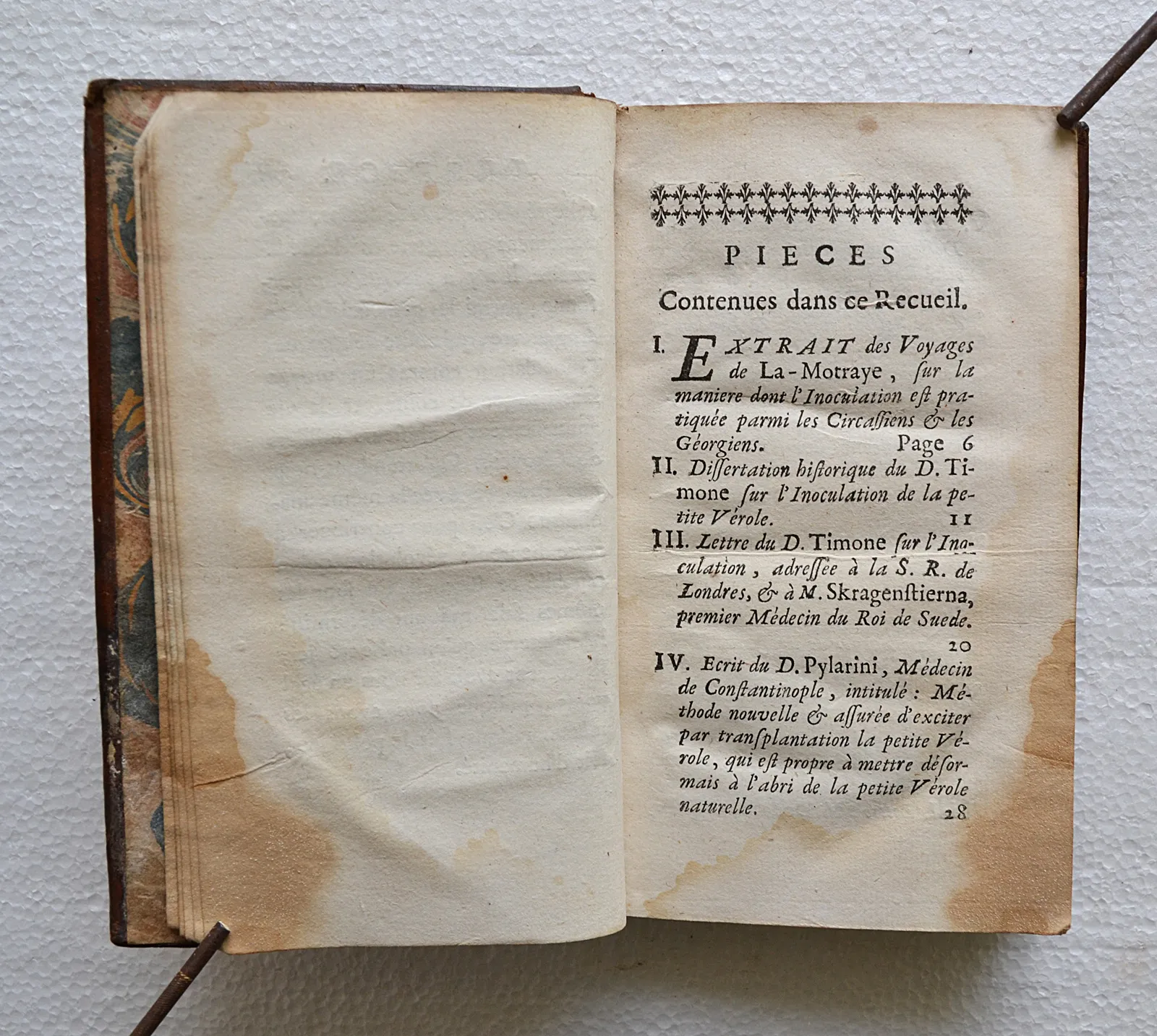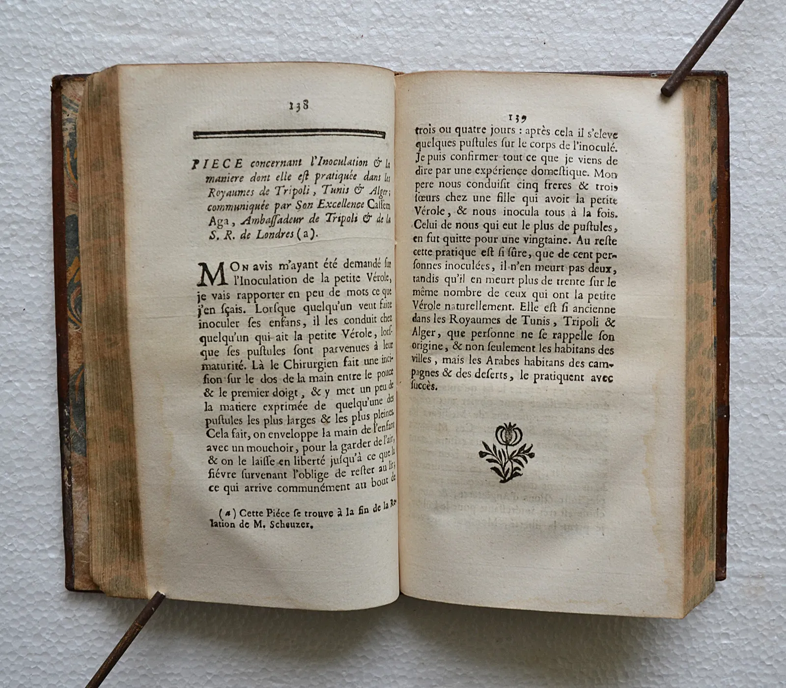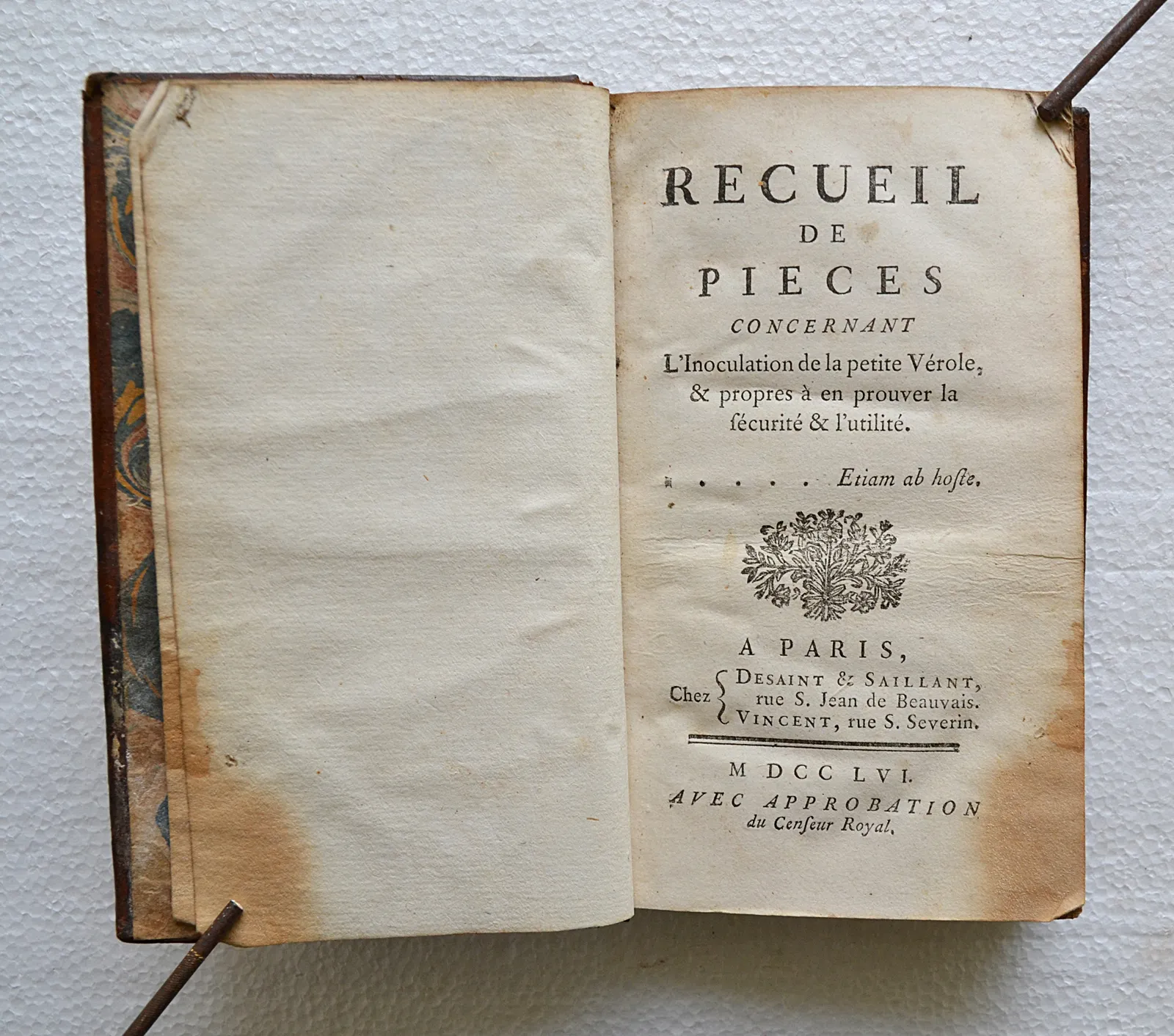 « Au XVIII° siècle, la variole était une maladie universelle. Suivant la virulence de l’épidémie, elle tuait entre une personne sur vingt et une sur sept, principalement des enfants en bas âge. L’inoculation variolique reposait sur un principe simple : comme on n’attrape la variole qu’une seule fois, autant l’avoir en bonne santé, bien préparé, lorsque l’épidémie est bénigne. Introduite en Angleterre dès les années 1720, l’inoculation demeure presque inconnue en France jusqu’en 1754 (…) ».