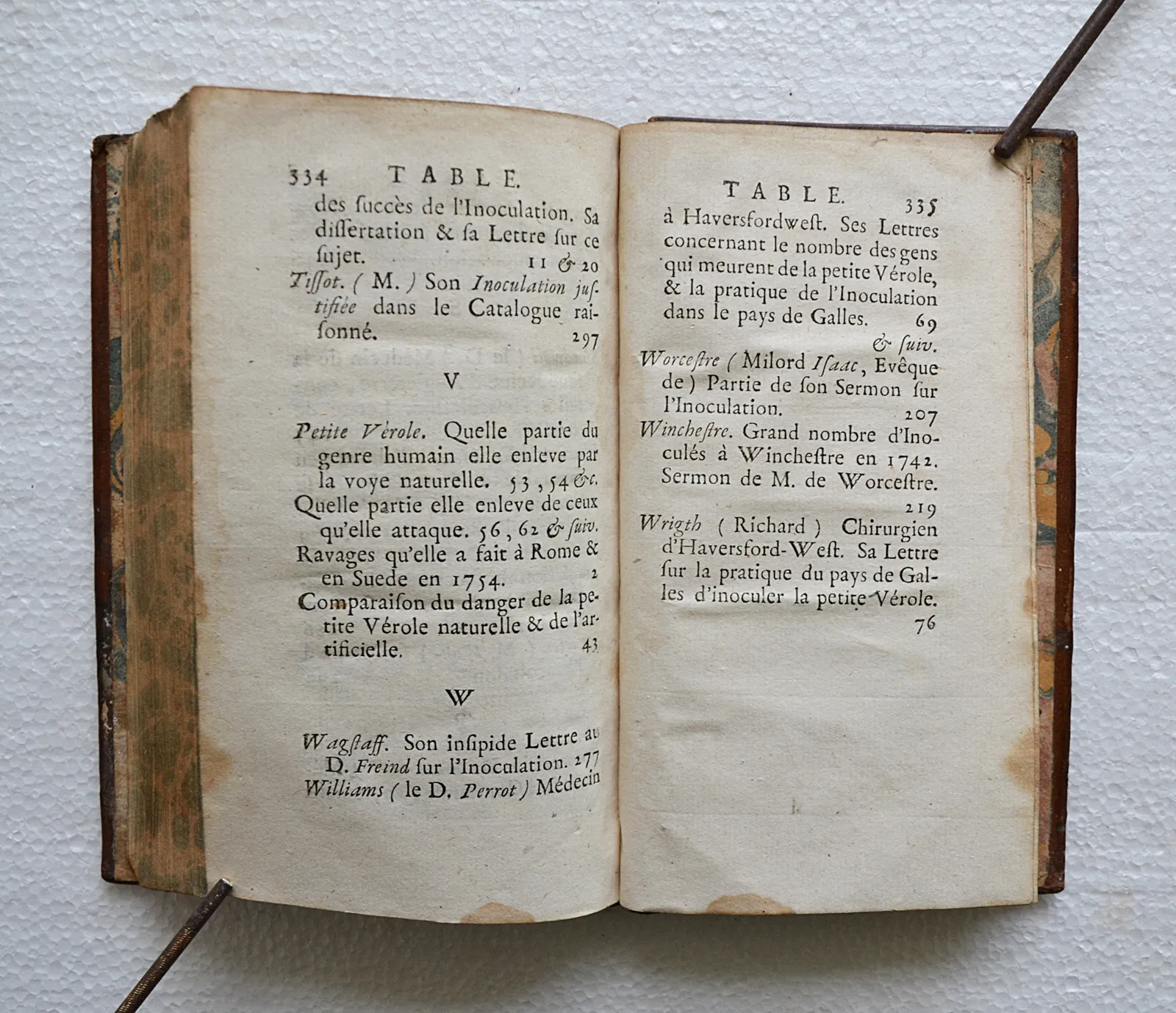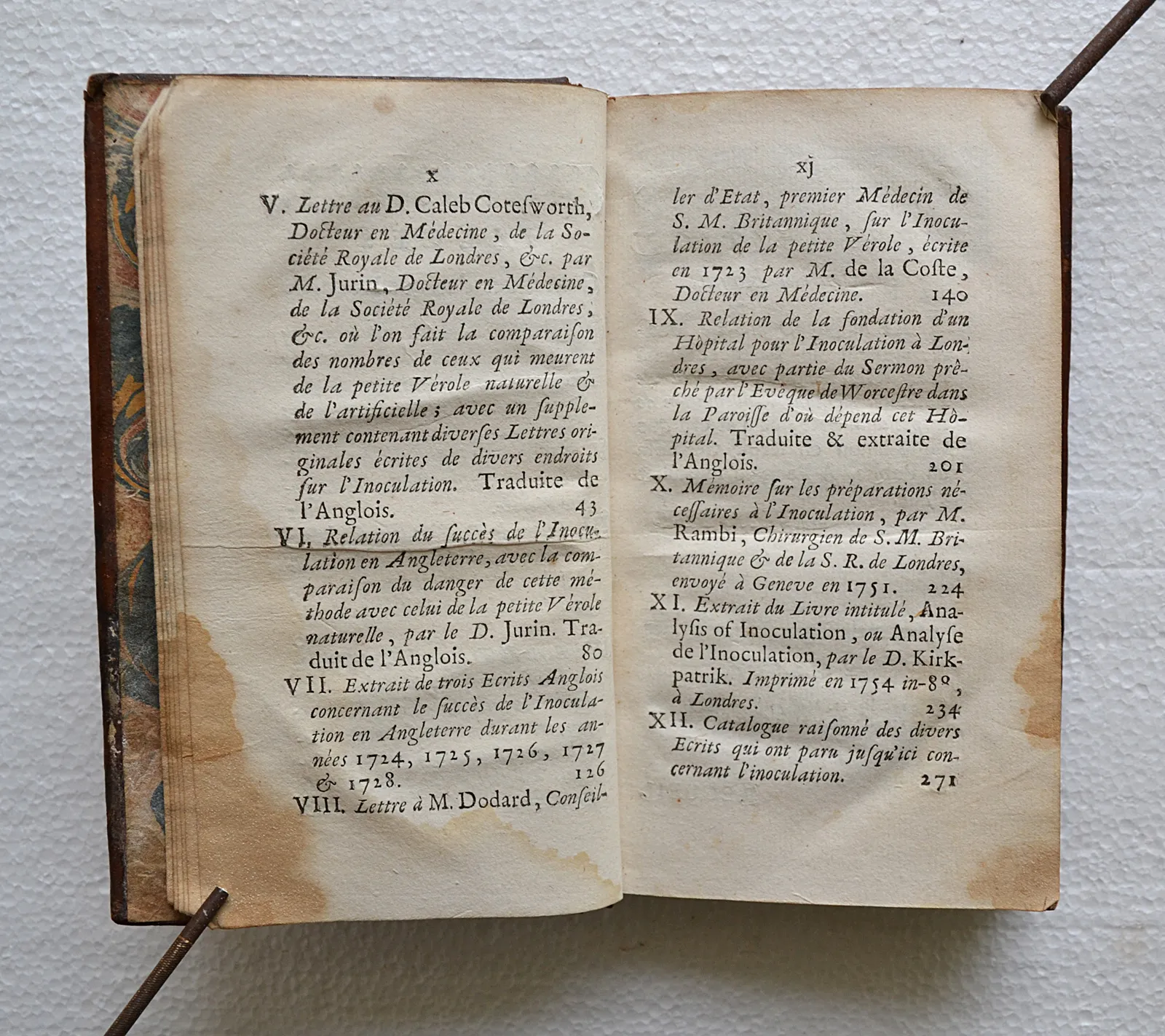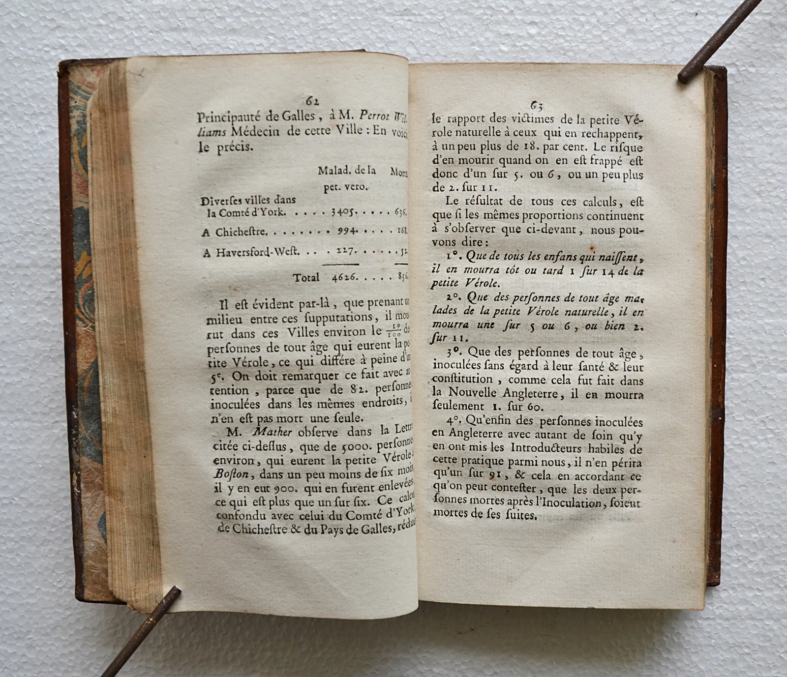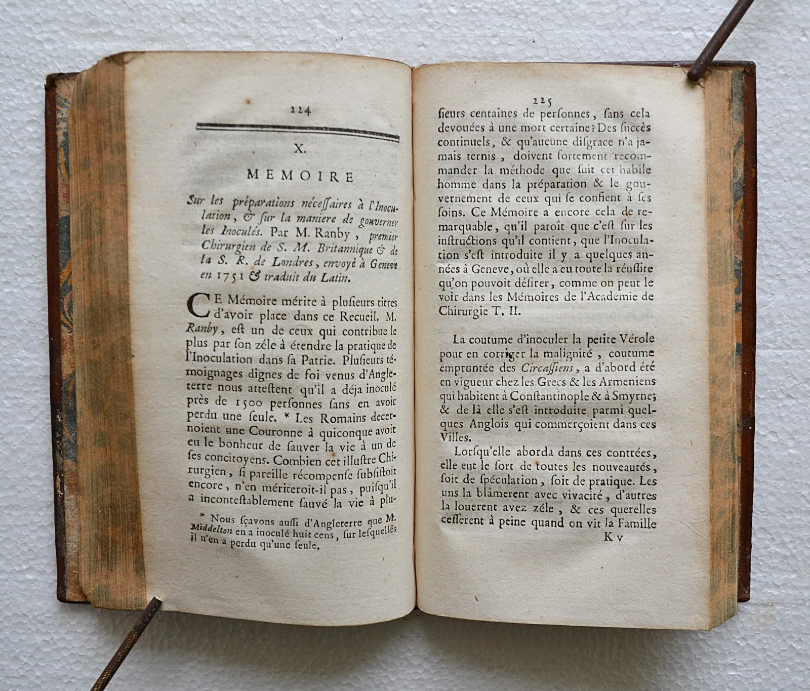 « Au XVIII° siècle, la variole était une maladie universelle. Suivant la virulence de l’épidémie, elle tuait entre une personne sur vingt et une sur sept, principalement des enfants en bas âge. L’inoculation variolique reposait sur un principe simple : comme on n’attrape la variole qu’une seule fois, autant l’avoir en bonne santé, bien préparé, lorsque l’épidémie est bénigne. Introduite en Angleterre dès les années 1720, l’inoculation demeure presque inconnue en France jusqu’en 1754 (…) ».