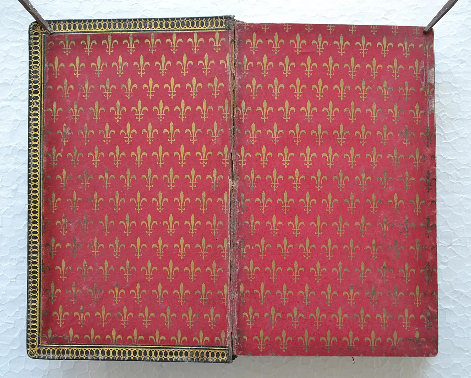 Maroquin noir d'époque aux monogrammes I.H.S. et M.R. dorés fleurdelisés, dos à nerfs à l'imitation du Moyen Âge, semis de fleurs de lys sur fond rouge.