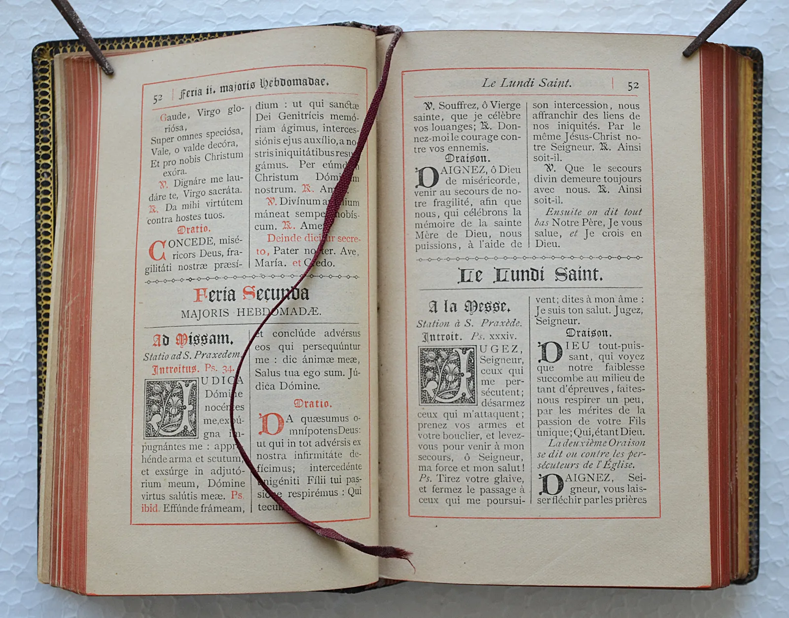 Tournay, Imprimerie liturgique de Saint Jean l’Evangéliste, Desclée, Lefebvre et Cie, 1883. Un volume in-12 (8,5 x 13,5 cm.) de : (3ff.) – 345(1) pp. – (8ff.), maroquin noir de l’époque, monogrammes dorés I.H.S. sur le premier plat & M.R. surmonté d’une couronne sur le second plat, les deux, dans un médaillon doré décoré de feuilles et de feuilles de lys dorées, dos à nerfs richement décoré du monogramme I.H.S. fleurdelisé, prolongement des nerfs à froid à l’imitation des reliures du moyen-âge, filet doré sur les coupes, roulette dorée à l’intérieur, contregardes et gardes illustrées d’un semis de fleurs de lys dorées sur fond rouge.