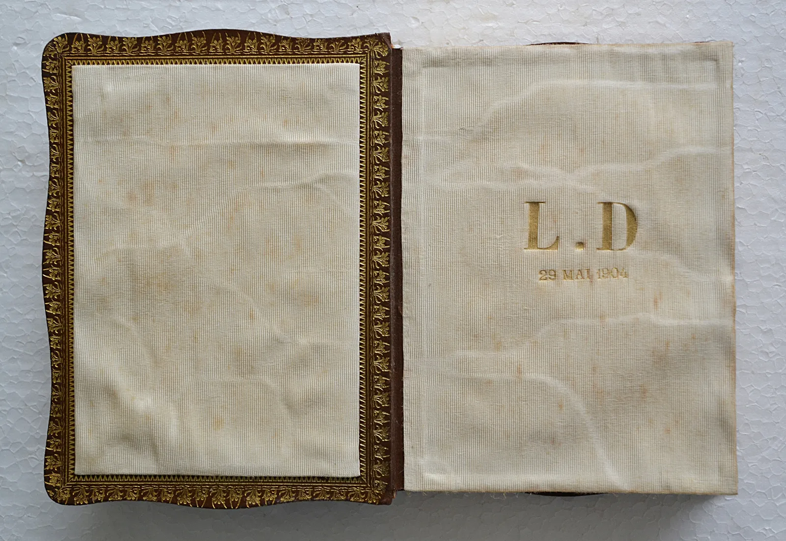 Dijon, Roux-Marchet et Cie, sans date [1916]. Un volume in-12 (12,5 x 16 cm.) de : 512 pages ; maroquin havane, plats avec les bords ondulés, décor floral doré en encadrement, dos lisse orné, roulette sur les coupes et à l’intérieur, doublures et gardes de moire crème, chiffre doré L.D. daté 29 mai 1904 sur la première garde.