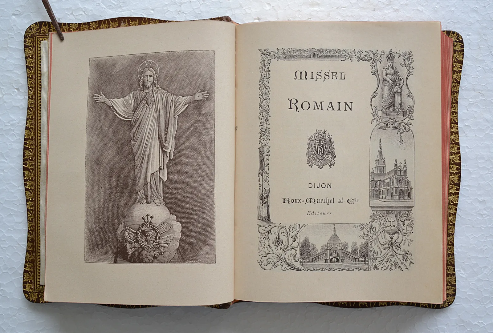Maroquin havane aux bords ondulés avec décor floral doré en encadrement, doublures de moire crème, texte orné de nombreux dessins religieux en noir.