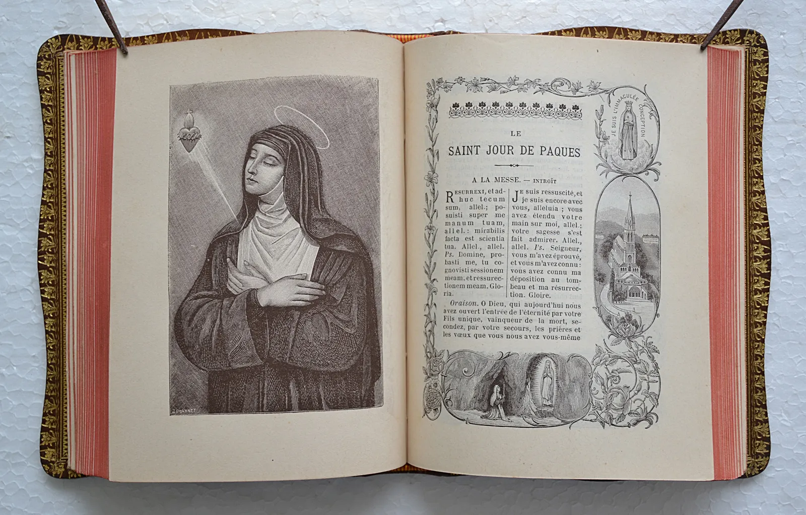 Très bel exemplaire, illustré de deux gravures hors-texte, et dont le texte est encadré de nombreux dessins religieux en noir.