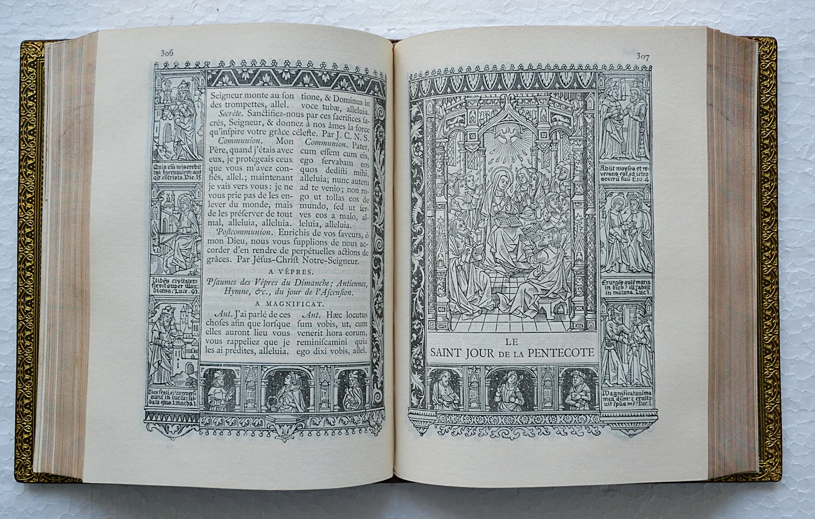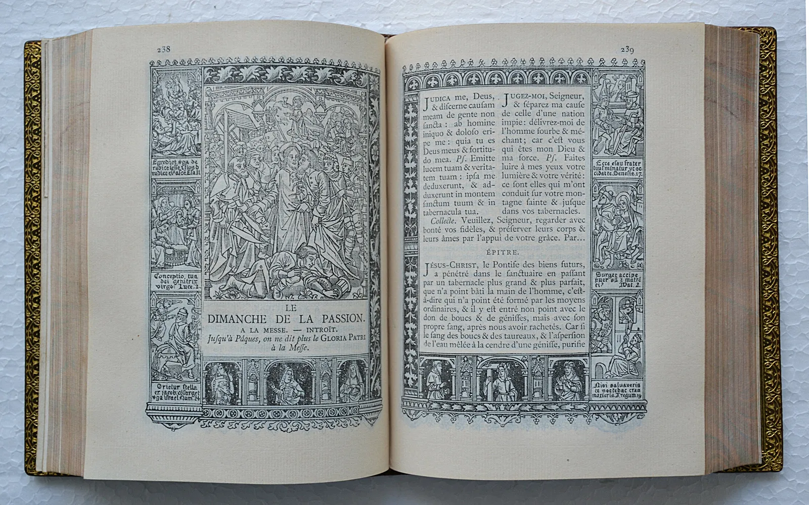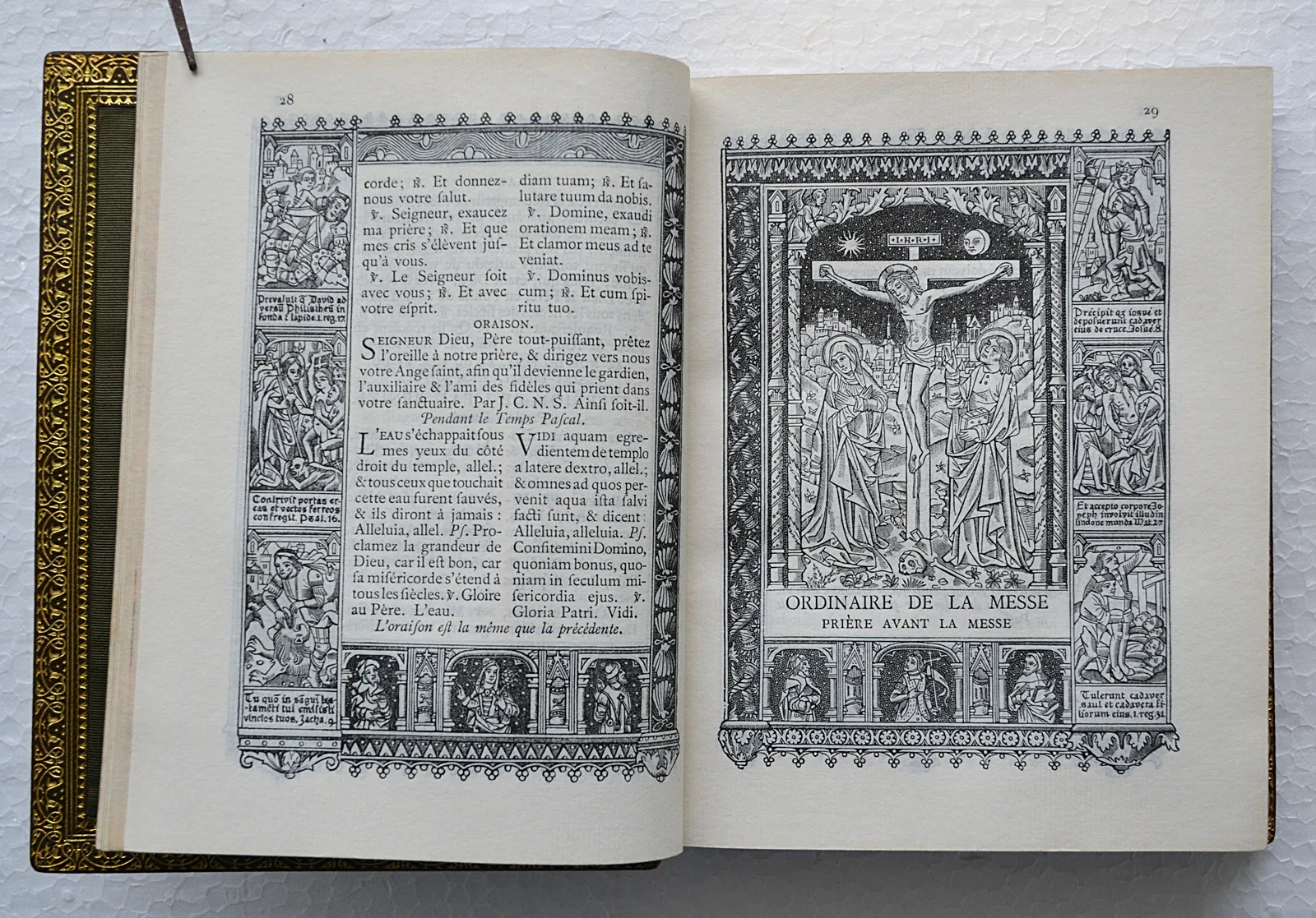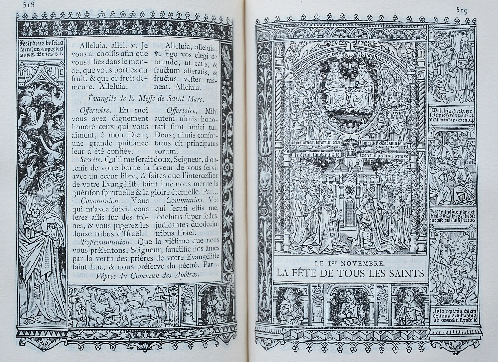 Titre & marque de l’imprimeur gravés. Le texte du calendrier liturgique est illustré de 10 gravures, il est entièrement encadré de scènes bibliques dans le style de celles du Moyen-âge.