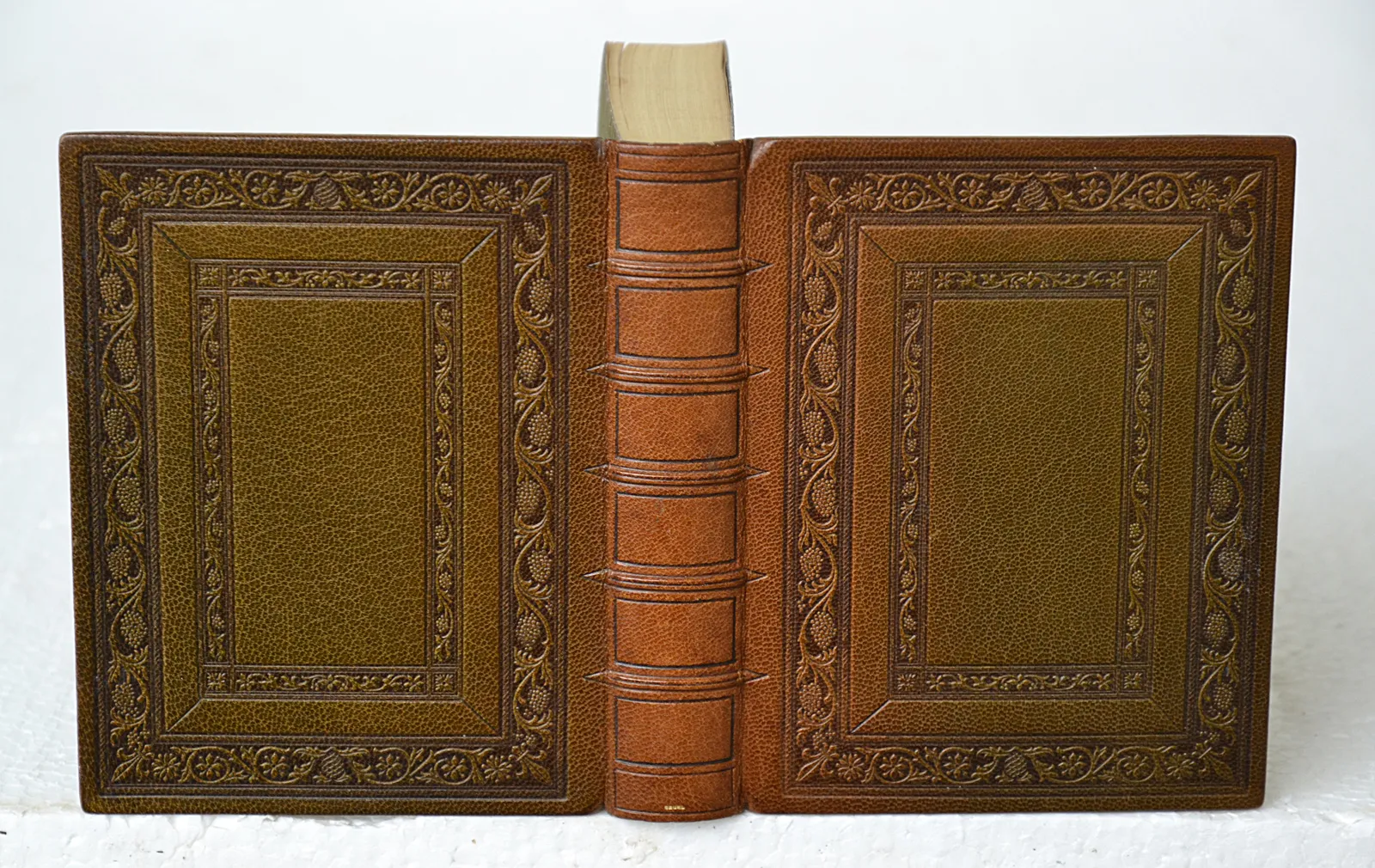 Reliure en maroquin olive de Gruel richement décorée de roulettes à froid, initiales couronnées dorées, dessins de A. Ledoux gravés par Touillot.