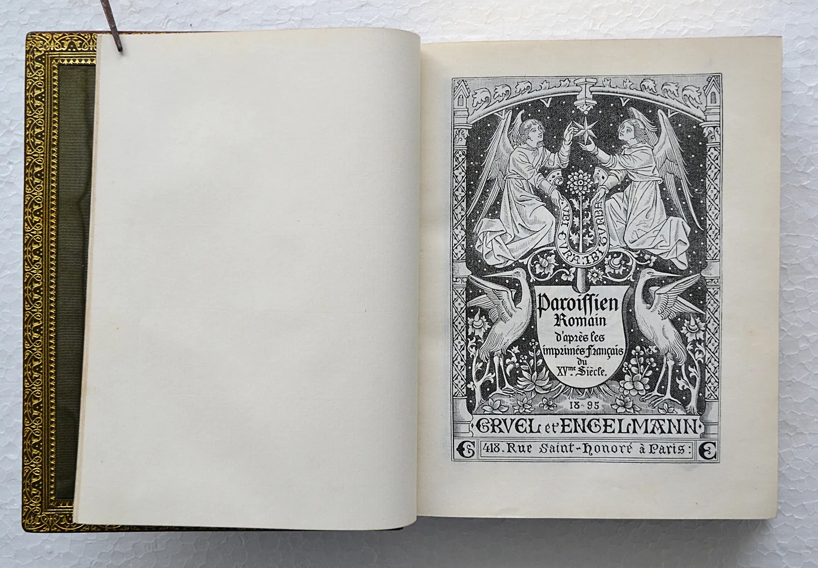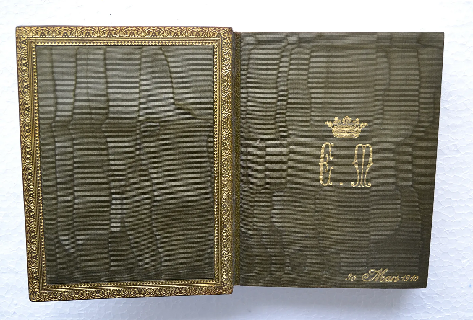 Paris, Gruel et Engelmann, 418 rue Saint-Honoré, 1895. Un volume in-12 (12,5 x 16 cm.) de 687(1) pages, maroquin olive, plats décorés de filets et d’un double encadrement de roulettes à froid (grappes de raisin, fleurs, fleur de lys), dos à nerfs orné d’un encadrement à froid dans les entre-nerfs, double filet doré sur les coupes, roulette dorée à l’intérieur, gardes de soie moirée olive, initiales C.M. surmontées d’une couronne dorée avec la date 30 Mars 1910 dorée sur la première garde, tranches dorées (Gruel en lettres dorées en queue de dos). Dos passé.