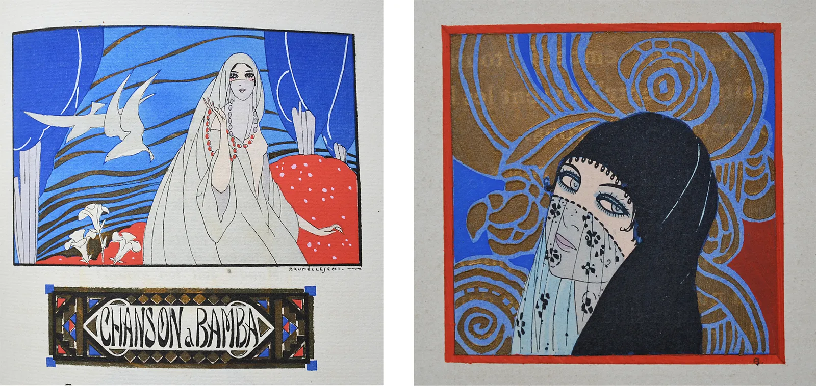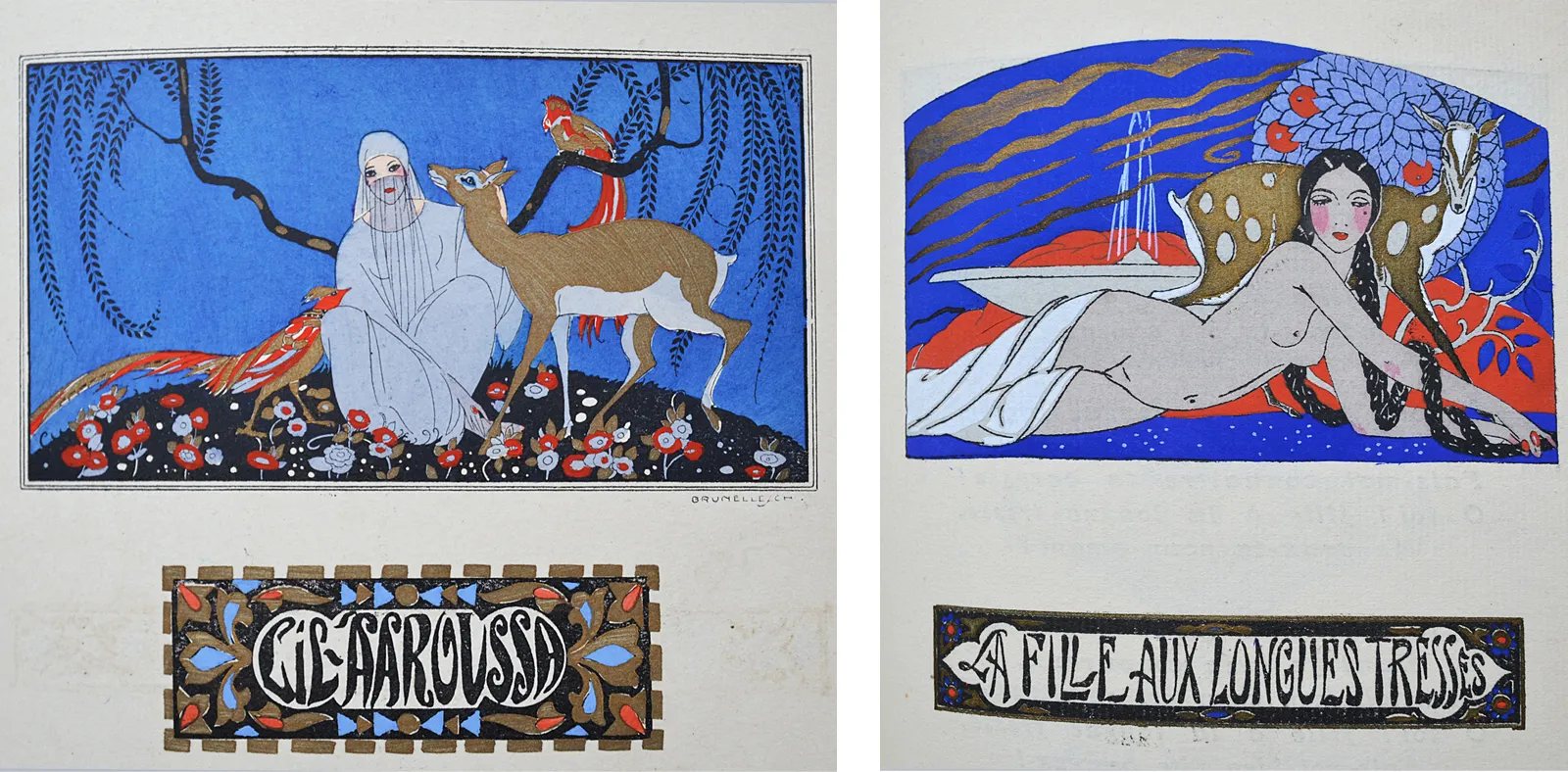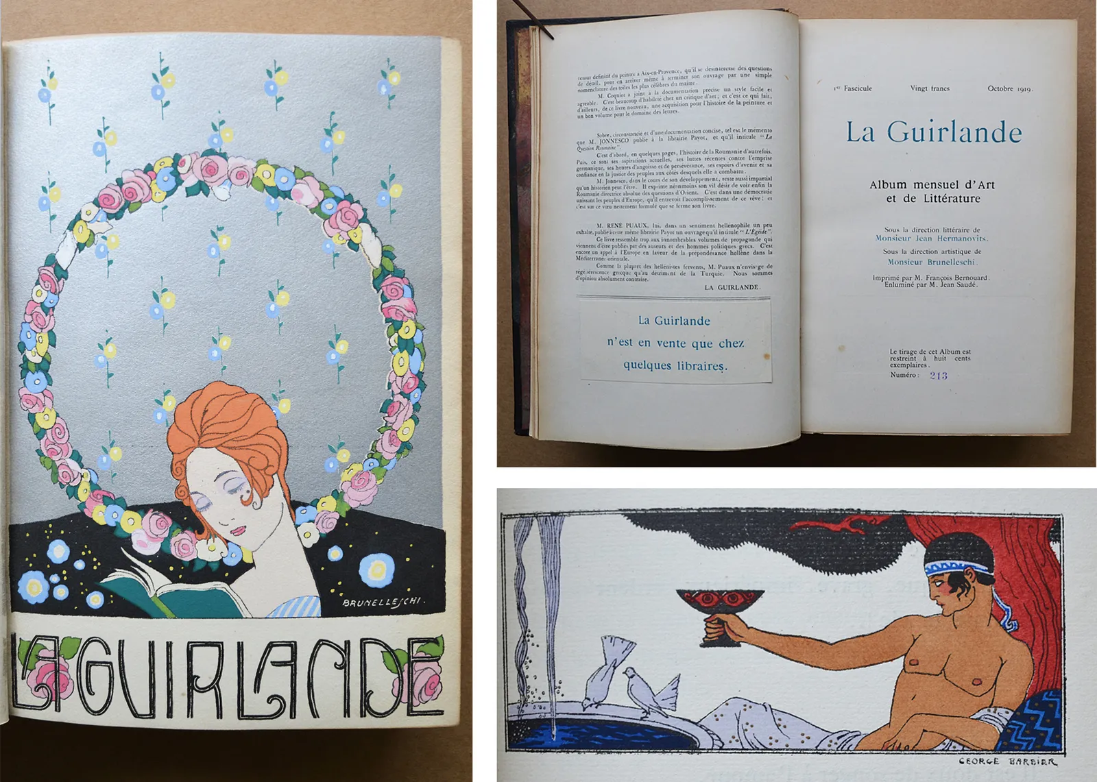 Album mensuel d’Art et de Littérature. Sous la direction littéraire de Monsieur Jean Hermanovits. Sous la direction artistique de Monsieur Brunelleschi. Imprimé par M. François Bernouard. Enluminé par M. Jean Saudé. Le tirage de cet album est restreint à huit cents exemplaires (n°213).